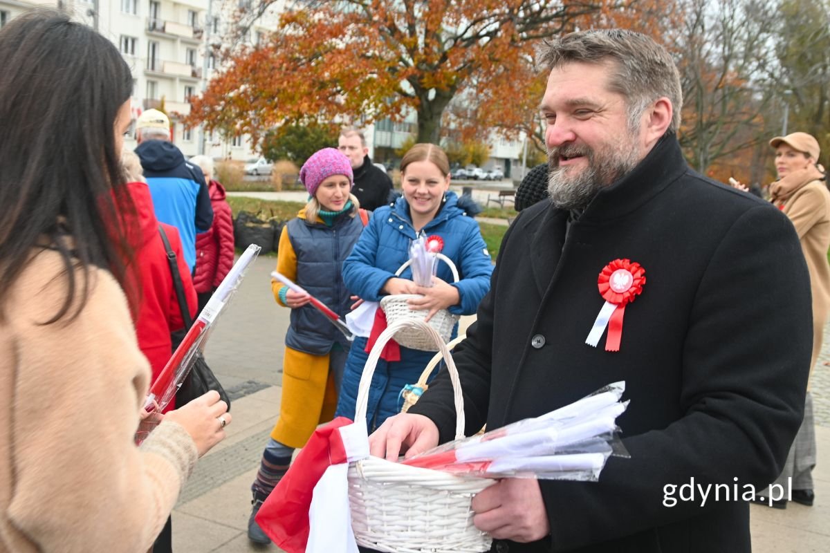 Na terenie Parku Centralnego 8 listopada prezydent Gdyni Aleksandra Kosiorek wraz wiceprezydentką Oktawią Gorzeńską i przewodniczącym Rady Miasta Tadeuszem Szemiotem rozdawali mieszkańcom miasta biało-czerwone flagi. Organizatorem akcji było Radio Gdańsk, którego pracownicy również uczestniczyli w przekazywaniu flag gdynianom. Podkreślenie barw narodowych zawsze służy i buduje naszą tożsamość. Jeżeli natomiast chodzi o gdyńskie obchody, to pamiętajmy, że nie tylko parada w Gdyni się odbywa. Rano mamy Bieg Niepodległości na dystansie 1918 metrów i 10 kilometrów, tak więc możemy mierzyć siły na zamiary. Również biblioteki i muzea włączyły się w te obchody, zatem każdy znajdzie coś dla siebie – mówiła Aleksandra Kosiorek, prezydent Gdyni. Gdynia przygotowuje się do obchodów Narodowego Święta Niepodległości, w ramach których 11 listopada zaplanowano m.in. Paradę Niepodległości i Gdyński Bieg Niepodległości z Decathlon. Parada wyruszy o godz. 12:00 sprzed Urzędu Miasta Gdyni (al. Marszałka Józefa Piłsudskiego 52/54), natomiast bieg rozpocznie się przy Polsat Plus Arenie Gdynia o godz. 8:00 (Bieg 1918) oraz 9:00 (Bieg Główny 10 km i Marsz Nordic Walking). Warto wspólnie obchodzić Święto Niepodległości dlatego, że budujemy swoją tożsamość, wzmacniamy wspólnotowość i łączymy się w ważnych dla naszego narodu chwilach. Myślę, że dla każdego narodu taki moment zatrzymania się, celebrowania świąt jest bardzo, bardzo ważny – mówiła Oktawia Gorzeńska, wiceprezydentka Gdyni. Od lewej: dziennikarka Radia Gdańsk Tatiana Slowi, prezydent Gdyni Aleksandra Kosiorek i przewodniczący Rady Miasta Tadeusz Szemiot (fot. Jakub Winiewski)Tego rodzaju wydarzenia pozwalają mieszkańcom miasta podkreślić swoje przywiązanie do ojczyzny i razem obchodzić ważne dla niej święta, wzmacniając poczucie wspólnoty, a także tożsamości narodowej. Oprócz flag wywieszonych przez mieszkańców 11 listopada w Gdyni pojawi się również wiele symboli narodowych umieszczonych m.in. na masztach oraz nośnikach reklamowych na terenie naszego miasta. Gdynia to ukochane dziecko Polski niepodległej. Powstała krótko po tym, jak Polska zdobyła niepodległość, więc my w Gdyni szczególnie podkreślamy naszą miłość do Polski i pamięć o tych wydarzeniach, które miały miejsce przed już ponad 100 laty – mówił Tadeusz Szemiot, przewodniczący Rady Miasta. Wydarzenie odbywające się przy pomniku marszałka Józefa Piłsudskiego stanowiło okazję do przypomnienia rodakom historii Polski oraz znaczenia symboli narodowych, a także do budowania poczucia wspólnoty i przynależności do narodu. Galeria zdjęć Pobierz galerię Przewodniczący Rady Miasta Tadeusz Szemiot rozdający flagi (fot. Jakub Winiewski) Pobierz zdjęcie Mieszkańcy Gdyni tłumnie zjawili się po odbiór flag (fot. Jakub Winiewski) Pobierz zdjęcie Biało-czerwone flagi czekały na gdynian w wiklinowych plecionych koszykach (fot. Jakub Winiewski) Pobierz zdjęcie Warunki pobierania Wszelkie prawa do zdjęć lub grafik prezentowanych w ramach portalu, należą do Prowadzącego portal lub do podmiotów z nim współpracujących i podlegają ochronie prawnej. Prowadzący portal zezwala na kopiowanie i przedstawianie utworów jedynie w celach niekomercyjnych oraz pod warunkiem zachowania go w oryginalnej postaci i zachowaniem kontekstu tematu, do którego zostało wykorzystaneprzez redakcję gdynia.pl. Opublikowane materiały powinny zawsze zawierać źródło, czyli adres strony www.gdynia.pl. Na publikowanie utworów w innych celach wymagana jest zgoda właściciela strony czyli Prowadzącego portal. Opublikowano: 08.11.2024 15:55 Autor: Jakub Winiewski (jakub.winiewski@gdynia.pl) Zmodyfikowano: 08.11.2024 16:47 Zmodyfikował: Karolina Szypelt