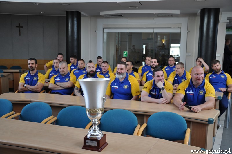 Sezon wakacyjny spowodował, że na taką uroczystość musieliśmy trochę poczekać, ale dzięki temu mogliśmy ponownie przeżyć wielkie emocje z początku miesiąca. We wtorek 28 lipca 2015 r. Mistrzowie Polski, rugbiści Arki Gdynia otrzymali z rąk prezydenta Gdyni Wojciecha Szczurka listy gratulacyjne oraz nagrodę w wysokości 30 tys. złotych. W rewanżu, zawodnicy wręczyli mu mistrzowską koszulkę. Sukcesy drużyny są ważne także z punktu widzenia szkolenia młodzieży. Dzieciaki patrząc na wasze sukcesy garną się do trenowania. Jesteście dla nich wzorem i mam nadzieję, że poczucie odpowiedzialności za to przyszłe pokolenie także będziecie dźwigać - powiedział prezydent Gdyni Wojciech Szczurek. Przypomnijmy, zawodnicy RC Arka Gdynia pokonali 5 lipca w pełnym dramaturgii spotkaniu Master Pharm Budowlanych Łodź 24-19. To czwarty mistrzowski tytuł w historii gdyńskiego klubu, pierwszy jednak zdobyty na własnym boisku, Narodowym Stadionie Rugby.fot. Sebastian Drausal Opublikowano: 28.07.2015 00:00 Autor: Dorota Nelke (11@gdynia.pl)