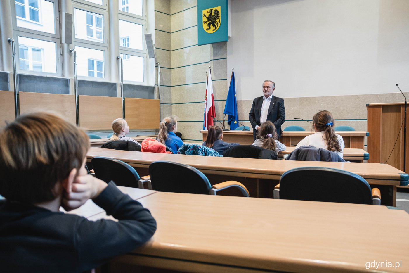 Wyjątkowi goście znów w Urzędzie Miasta Gdyni – codziennemu funkcjonowaniu magistratu przyjrzeli się mali mieszkańcy Gdyni, którzy na co dzień uczą się w Szkole Podstawowej nr 35. Uczniowie z Witomina odwiedzili niektóre komórki urzędu i spotkali się m. in. z prezydentem Wojciechem Szczurkiem, który opowiedział o tym, czym zajmuje się samorząd. Czym zajmuje się urząd miasta, jak podejmuje się decyzje dotyczące budowy ulic czy szkół i kto pracuje w gmachu, który najmłodszym kojarzy się z poważnymi sprawami załatwianymi przez ich rodziców? Ile dzieci, tyle pytań. Choć z pozoru miejski magistrat służy jasnym, dobrze znanym celom, z perspektywy młodych gdynian staje się miejscem, które ma wiele tajemnic do odkrycia. W środę przekonali się o tym uczniowie jednej z gdyńskich szkół – SP nr 35 przy ul. Uczniowskiej, który odwiedzili Urząd Miasta Gdyni i zwiedzili jego zakamarki, dowiadując się, co na co dzień dzieje się w budynku przy al. marsz. Piłsudskiego i dlaczego to właśnie tutaj zapadają decyzje, które mają wpływ na ich okolicę.Uczniowie SP nr 35 przygotowali pytania do prezydenta Gdyni, fot. Kamil ZłochNajmłodsi mieszkańcy mieli też okazję osobiście spotkać się z prezydentem Gdyni. Wojciech Szczurek ugościł drugoklasistów w największej sali urzędu, w której regularnie spotyka się Rada Miasta Gdyni i otrzymał grad pytań od dzieci – między innymi o to, czy lubi swoją pracę, który ze szkolnych przedmiotów był jego ulubionym, a nawet o codzienne hobby, sport i podróże. Dla prezydenta była to także okazja do sentymentalnych wspomnień, bo kilkadziesiąt lat temu sam kończył Szkołę Podstawową nr 35 i wychowywał się na gdyńskim Witominie. Mali gdynianie z okazji zbliżających się świąt przygotowali też dla Wojciecha Szczurka specjalną laurkę, którą wręczyli prezydentowi na koniec spotkania.Prezydent Gdyni, Wojciech Szczurek (w środku) z grupą drugoklasistów ze Szkoły Podstawowej nr 25 w Gdyni oraz ich nauczycielami, fot. Kamil ZłochUczniowie podstawówki z Witomina podczas wizyty w magistracie przyjrzeli się też funkcjonowaniu innych komórek urzędu, odwiedzając m.in. strażników miejskich. Galeria zdjęć Pobierz galerię Dzieci ze Szkoły Podstawowej nr 35 na Witominie spotkały się z prezydentem Gdyni, Wojciechem Szczurkiem, który odpowiedział na ich pytania, fot. Kamil Złoch Pobierz zdjęcie Dzieci ze Szkoły Podstawowej nr 35 na Witominie spotkały się z prezydentem Gdyni, Wojciechem Szczurkiem, który odpowiedział na ich pytania, fot. Kamil Złoch Pobierz zdjęcie Dzieci ze Szkoły Podstawowej nr 35 na Witominie spotkały się z prezydentem Gdyni, Wojciechem Szczurkiem, który odpowiedział na ich pytania, fot. Kamil Złoch Pobierz zdjęcie Dzieci ze Szkoły Podstawowej nr 35 na Witominie spotkały się z prezydentem Gdyni, Wojciechem Szczurkiem, który odpowiedział na ich pytania, fot. Kamil Złoch Pobierz zdjęcie Dzieci ze Szkoły Podstawowej nr 35 na Witominie spotkały się z prezydentem Gdyni, Wojciechem Szczurkiem, który odpowiedział na ich pytania, fot. Kamil Złoch Pobierz zdjęcie Warunki pobierania Wszelkie prawa do zdjęć lub grafik prezentowanych w ramach portalu, należą do Prowadzącego portal lub do podmiotów z nim współpracujących i podlegają ochronie prawnej. Prowadzący portal zezwala na kopiowanie i przedstawianie utworów jedynie w celach niekomercyjnych oraz pod warunkiem zachowania go w oryginalnej postaci i zachowaniem kontekstu tematu, do którego zostało wykorzystaneprzez redakcję gdynia.pl. Opublikowane materiały powinny zawsze zawierać źródło, czyli adres strony www.gdynia.pl. Na publikowanie utworów w innych celach wymagana jest zgoda właściciela strony czyli Prowadzącego portal. Opublikowano: 07.12.2022 15:13 Autor: Kamil Złoch (kamil.zloch@gdynia.pl) Zmodyfikowano: 07.12.2022 15:31 Zmodyfikował: Agnieszka Janowicz