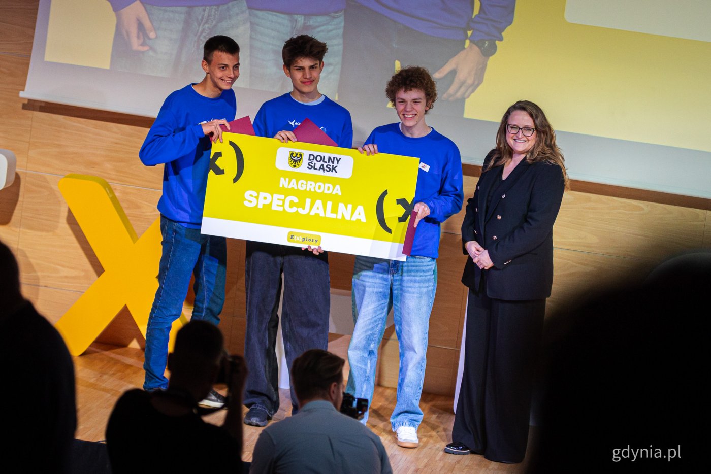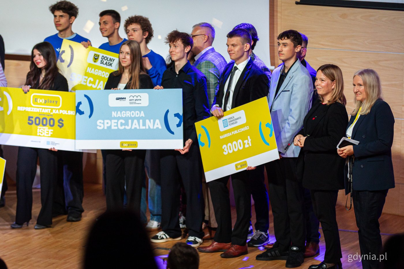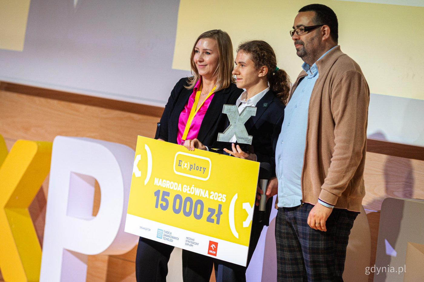 Magnetyczne materiały dla robotyki, kwantowe sposoby na detekcję plastiku w wodzie, antykradzieżowe zabezpieczenia ze światłowodów czy bakterie zastępujące sztuczne nawozy – to projekty nastoletnich naukowców, które w Gdyni docenili jurorzy Konkursu Naukowego Explory! Najlepsi otrzymali nagrody finansowe, które pozwolą im kontynuować swoje badania, a także przepustkę na międzynarodowe targi naukowe ISEF. Wśród finalistów znalazły się dwa projekty uczniów z gdyńskich liceów. Najlepsi młodzi naukowcy spotkali się w Gdyni Gala pełna emocji i nowych szans Naturalna alternatywa dla nawozów „made in Gdynia” Lista zwycięzców Konkursu Naukowego Explory 2025 Finał Konkursu Explory to w zasadzie podsumowanie całego wydarzenia, które przez kilka dni skupia w Gdyni najzdolniejszych młodych naukowców z całego kraju – Gdynia Explory Week.Przypomnijmy, że od 22 października (gdy rozpoczął się tzw. Przystanek Gdynia) aż do 24 października (finał konkursu i SHOTx) nastoletni innowatorzy prezentowali swoje pomysły i szukali kolejnych inspiracji, m.in. w Pomorskim Parku Naukowo-Technologicznym Gdynia. Zdjęcia i montaż: Sławomir Okoń Najlepsi młodzi naukowcy spotkali się w Gdyni Wspomniany konkurs to natomiast jedna z najważniejszych inicjatyw wpisujących się w nurt tzw. edukacji STEAM (skrót od słów „science”, „technology”, „engineering”, „arts” i „mathematics”, czyli nauki, technologii, inżynierii, sztuki i matematyki). To podejście, które pomaga wyłonić spośród uczniów umysły gotowe na zmienianie świata – wynajdywanie nowatorskich technologii czy opracowywanie rozwiązań odpowiadających na potrzeby współczesnego społeczeństwa.Wcześniej wszystkie z finałowych projektów – łącznie 35 rozwiązań i badań, które przebrnęły przez wcześniejsze etapy konkursu – przeszły wnikliwą ocenę jurorów (łącznie kilkunastu ekspertów) oraz partnerów konkursu. Najlepsi mogą liczyć na konkretne wsparcie ich idei, bo czekały m.in. nagrody finansowe sięgające 15 tysięcy złotych, ale i przepustki na prestiżowe, międzynarodowe targi Regeneron ISEF (International Science and Engineering Fair) w Stanach Zjednoczonych.Wiceprezydentka Gdyni Oktawia Gorzeńska (na zdjęciu) witająca finalistów konkursu podczas gali (fot. Kamil Złoch) Od jurorów wiem, że projekty były przewspaniałe, wręcz genialne, i bardzo trudno było dokonać wyboru. Mam nadzieję, że – choć nagrody nie powędrują do wszystkich – to jednak sama obecność w finale już jest pewną nagrodą, bo można podzielić się tym, co wypracowywaliście wspólnie z szerszym gronem – mówiła podczas gali Konkursu Explory 2025 wiceprezydentka Gdyni Oktawia Gorzeńska. Warto wspomnieć, że w finałowym gronie w tym roku znalazły się też dwa projekty z gdyńskimi akcentami: „Drinkwise – system monitorujący nawodnienie oraz podaż składników mineralnych” autorstwa Darii Gelety, Kornelii Wieczorek i Oskara Krawczyka (łączone siły III Liceum Ogólnokształcącego w Gdyni i Zespołu Szkół nr 1 w Kozienicach); „NeuroSoil – interakcje bakterii glebowych produkujących GABA z roślinami” autorstwa Laury Grafińskiej i Tomasza Gerki z VI Liceum Ogólnokształcącego w Gdyni. Explory to festiwal nauki i innowacji, bardzo ważny dzisiaj, szczególnie w czasach, kiedy zmiana tak mocno nas dotyka, a problemy, z którymi mierzymy się w naszym społeczeństwie i które pojawiają się w różnych obszarach życia, oczekują nowych rozwiązań. Nowych, czyli innowacyjnych. Dlatego spotkania młodych naukowczyń i naukowców, innowatorek i innowatorów, którzy mogą zaprezentować swoje unikatowe projekty, są tak ważne. Mam nadzieję, że idea Explorów, która od 14 lat ma miejsce w Gdyni, będzie jeszcze bardziej pączkowała w naszym mieście, że będziemy ją rozwijali, jak choćby poprzez festiwale nauki, które już przed nami w kolejnych tygodniach – powiedziała Oktawia Gorzeńska, wiceprezydentka Gdyni. Gala pełna emocji i nowych szans Finałową galę konkursu, która odbyła się w piątek (24 października) w centrum konferencyjnym PPNT Gdynia, transmitowano na żywo na platformie YouTube.Zapis transmisji z gali Konkursu Explory 2025 / YouTubePodczas gali wręczono nie tylko nagrodę główną oraz wyłoniono reprezentantów Polski na wspomniany ISEF w amerykańskim Phoenix, ale uhonorowano także finalistów nagrodami specjalnymi – w tym przyznawaną przez Prezydent Miasta Gdyni oraz przyznawaną przez Uniwersytet Morski w Gdyni.Ostatecznie jurorom najbardziej przypadł do gustu projekt polegający na opracowaniu własnego, magnetycznego materiału, który mógłby sprawdzić się w tzw. robotyce miękkiej. Jego autor, Emil Pająk z V LO w Gliwicach, sięgnął po nagrodę główną wartą 15 tys. złotych, wyjazd do Stanów Zjednoczonych oraz nagrodę specjalną gdyńskiej uczelni. Kiedy oglądałem pozostałe projekty finalistów, naprawdę do samego końca nie byłem w stanie stwierdzić, które projekty tak naprawdę wygrają. Wszystkie były naprawdę niesamowite i każdy z nas włożył w swoje badania ogrom pracy – powiedział na scenie Emil Pająk. Emil Pająk (z mikrofonem) w tym roku zdobył najwięcej nagród (fot. Kamil Złoch)„Miejski” laur, czyli nagrodę specjalną przyznawaną przez prezydent Gdyni, otrzymali natomiast lokalni reprezentanci w finale – duet licealistów z VI LO w Gdyni, Laura Grafińska i Tomasz Gerka. Ich pomysł to, w wielkim uproszczeniu: skorzystanie z bakterii, które potencjalnie mogą zastąpić sztuczne nawozy w uprawie roślin.Laureaci nagrody specjalnej przyznawanej przez prezydent Gdyni, Tomasz Gerka i Laura Grafińska, na scenie z wiceprezydentką Gdyni Oktawią Gorzeńską (fot. Kamil Złoch) Naturalna alternatywa dla nawozów „made in Gdynia” Laura Grafińska i Tomasz Gerka (na zdjęciu) podczas prezentacji swojego projektu na scenie w PPNT Gdy