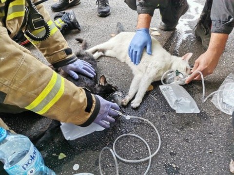 Strażacy #wGdyni podczas interwencji przy ul. Morskiej, wynieśli z płonącego mieszkania dwa nieprzytomne koty. Po resuscytacji zwierzęta wróciły do swoich właścicieli. Ewakuacja mieszkańców i reanimacja kotów W niedzielę, 6 września, ok. godz. 17:00, Komenda Miejska Państwowej Straży Pożarnej w Gdyni otrzymała zgłoszenie o pożarze mieszkania przy ul. Morskiej w Chyloni. Strażacy przeprowadzili brawurową akcję ratunkową i ewakuowali kilkanaście osób. Nikomu nic się nie stało. Zwierzęta również zostały uratowane! Strażacy wynieśli z mieszkania dwa nieprzytomne koty. - Ratowanie kotów przebiega tak samo, jak ratowanie człowieka. Jest prowadzona tlenoterapia i uciskanie klatki piersiowej. To nietypowa sytuacja, ale dla strażaka to nie ma znaczenia, trzeba ratować i się ratuje – powiedział mł. kpt. Jakub Friedenberger, rzecznik Komendy Miejskiej Państwowej Straży Pożarnej w Gdyni.Po przeprowadzeniu resuscytacji zwierzęta odzyskały przytomność i wróciły do swoich właścicieli. Bo dla strażaków każde życie jest tak samo ważne! Galeria zdjęć Pobierz galerię Strażacy przeprowadzają resuscytacja u kota. // fot. st. kpt Paweł Gil, Komenda Miejska Państwowej Straży Pożarnej w Gdyni Pobierz zdjęcie Gdyńskich strażacy uratowali z płonącego mieszkania dwa koty. // fot. st. kpt Paweł Gil, Komenda Miejska Państwowej Straży Pożarnej w Gdyni Pobierz zdjęcie Warunki pobierania Wszelkie prawa do zdjęć lub grafik prezentowanych w ramach portalu, należą do Prowadzącego portal lub do podmiotów z nim współpracujących i podlegają ochronie prawnej. Prowadzący portal zezwala na kopiowanie i przedstawianie utworów jedynie w celach niekomercyjnych oraz pod warunkiem zachowania go w oryginalnej postaci i zachowaniem kontekstu tematu, do którego zostało wykorzystaneprzez redakcję gdynia.pl. Opublikowane materiały powinny zawsze zawierać źródło, czyli adres strony www.gdynia.pl. Na publikowanie utworów w innych celach wymagana jest zgoda właściciela strony czyli Prowadzącego portal. Opublikowano: 07.09.2020 09:48 Autor: Weronika Rozbicka (w.rozbicka@gdynia.pl) Zmodyfikowano: 07.09.2020 11:08 Zmodyfikował: Weronika Rozbicka