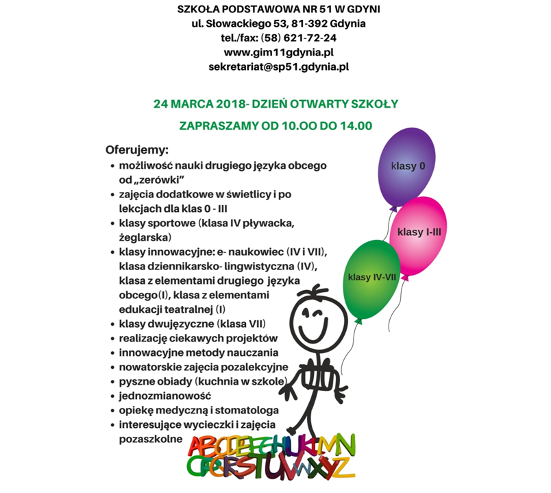 Wychodząc naprzeciw oczekiwaniom dzieci rozpoczynających naukę w nowej szkole, a także rodzicom chcącym zapewnić swoim dzieciom jak najlepsze warunki nauczania i rozwoju, gdyńskie szkoły zapraszają na Dni Otwarte. Nauczyciele i uczniowie gdyńskich szkół przygotowali szeroką ofertę edukacyjną dla przyszłych adeptów. Czekać na nich będzie też wiele atrakcyjnych zajęć. Oprócz spotkań tematycznych goście będą mogli wziąć udział w zabawach integracyjnych, rozgrywkach sportowych, a także zwiedzić mury przyszłej szkoły. Kontakt do szkół dostępny jest na stronie: www.gdynia.pl w zakładce „Informator o placówkach”. Szkoła Podstawowa nr 6 Dzień Otwarty w szkole odbędzie się 25 maja. Szczegóły będą dostępne już wkrótce na stronie internetowej szkoły: www.sp6.gdynia.pl. Adres: Cechowa 22, 81-194 GdyniaTelefon: 58 625 40 25 Szkoła Podstawowa nr 8 Dzień Otwarty w Szkole Podstawowej nr 8 odbędzie się 24 marca w godz. 9.30-12.00. W programie m. in.: zajęcia kulinarne, plastyczne, konkurencje sportowe, spotkanie z książką, gry planszowe i łamigłówki matematyczne oraz prezentacje uczniów klas trzecich. Adres: Orłowska 27/33, 81-522 Gdynia Telefon: 58 624 84 62, www.zs5gdynia.pl Szkoła Podstawowa nr 12 Dyrekcja Szkoły Podstawowej nr 12 w Gdyni zaprasza rodziców pięciolatków, sześciolatków i siedmiolatków wraz z dziećmi na Dzień Otwarty 22 marca w godzinach 17.00-19.00.O godzinie 17.00 w stołówce szkolnej rozpocznie się spotkanie organizacyjne dyrekcji z rodzicami, na którym zostanie przedstawiona oferta edukacyjna dla Oddziałów Przedszkolnych "Zerówek" i klas 1 SP. W tym czasie dzieci pod opieką nauczycieli będą mogły uczestniczyć w wielu atrakcyjnych zajęciach: zabawach z robotami, ciekawych eksperymentach, zajęciach plastycznych, muzyczno-ruchowych, komputerowych, twórczej nauce czytania, pokazach zdjęć. Telefon: 58 624 04 07Adres: Stawna 4/6, 81-629 Gdynia, www.sp12gdynia.pl Szkoła Podstawowa nr 17 Szkoła Podstawowa nr 17 organizuje Dni otwarte w dniu 24 marca (sobota). Spotkanie dla rodziców i opiekunów odbędzie się w Szkole Podstawowej nr 17 o godzinie 10.00-11.30. , Dzieci w tym czasie będą mogły wziąć udział w zajęciach adaptacyjnych "Bajeranckie warsztaty malowania." Adres: Grabowo 12, 81-265 GdyniaTelefon: 58 620 89 78, www.sp17edu.pl Szkoła Podstawowa nr 18 Szkoła Podstawowa nr 18 zaprasza przyszłych pierwszoklasistów i ich rodziców na dzień otwarty szkoły, który odbędzie się 22 marca (czwartek) w godz. 15.00-17.00. W programie między innymi: zajęcia wokalno-ruchowe, muzyczne z wykorzystaniem instrumentów perkusyjnych, plastyczne, komputerowe, sportowe, świetlicowe, bajkowa matematyka, finanse dla najmłodszych, czytanie bajek w bibliotece, słodki poczęstunek. Adres: Krasickiego 28, 81-001 GdyniaTelefon: 58 620 69 43, www.sp18.gdynia.pl Szkoła Podstawowa nr 20 Dzień otwarty w Szkole Podstawowej nr 20 odbędzie się 23 marca w godz. 12.00-14.00.Adres: Starodworcowa 36, 81-575 GdyniaTelefon: 58 629 39 30, www.sp20gdynia.pl Szkoła Podstawowa nr 26 Szkoła Podstawowa nr 26 w Gdyni organizuje Dzień Otwarty dla klas siódmych, dwujęzycznych z językiem francuskim w budynku przy ul. Wolności 25 6 kwietnia w godz. 15.00-17.00.Adres: Tatrzańska 40, 81-313 GdyniaTelefon: 58 620 66 64, www.sp26gdynia.pl Szkoła Podstawowa nr 28 Dzień Otwarty w Szkole Podstawowej nr 28 odbędzie się 12 maja. Szczegóły pojawią się wkrótce na stronie szkoły: www.sp28gdynia.pl.Adres: Zielona 53, 81-197 GdyniaTelefon: 58 665 84 62 Szkoła Podstawowa nr 31 Nauczyciele kl. 0-3 zapraszają na zajęcia adaptacyjne dla dzieci 6 i 7-letnich: 20 marca w godz. 17.00-17.45, s.3c lub 24 marca w godz. 10.00-10.45, s.3c.Dzień Otwarty dla kandydatów do klasy 4 SP– oddziałów sportowych (piłka ręczna – dziewczęta, piłka nożna – chłopcy), odbędzie się 24 marca w godz. 10.00-12.00 na hali sportowej.Adres: Chylońska 227, 81-007 GdyniaTelefon: 58 782 11 51, www.zs9gdynia.pl Szkoła Podstawowa nr 35 Piłkarski Dzień Otwarty w szkole Podstawowej nr 35 odbędzie się 24 marca w godz. 10.00 - 13.00. Adres: Uczniowska 1, 81-647 GdyniaTelefon: 58 624 09 74, www.sp35gdynia.pl Szkoła Podstawowa nr 51 Dzień Otwarty odbędzie się 24 marca w godz.10.00-14.00.Adres: Juliusza Słowackiego 53, 81-001 GdyniaTelefon: 58 621 72 24, www.gim11gdynia.pl Szkoła Podstawowa nr 52 Dyrektor, grono pedagogiczne i uczniowie zapraszają na dzień otwarty 6 kwietnia w godzinach 16.00-18.00. Rodzice, opiekunowie i przyszli uczniowie spotkają się z dyrektorem i poznają szkołę.Adres: Stefana Okrzei 6, GdyniaTelefon: 58 663 79 88, www.sp52gdynia.eu Sportowa Szkoła Podstawowa nr 14 Dzień Otwarty odbędzie się 11 kwietnia w godz.17.30-19.00.Adres: Władysława IV 54, 81-384 GdyniaTelefon: 58 620 72 55, www.zsso.gdynia.pl Zespół Szkolno-Przedszkolny nr 1 Dni otwarte w Zespole Szkolno-Przedszkolnym nr 1 odbędą się 24 marca w godz. 11.30 - 13.30.Adres: Wiczlińska 93, 81-577 Gdynia Telefon: 58 624 15 64, www.sp37.gdynia.pl Zespół Szkolno-Przedszkolny nr 2 Dyrekcja i nauczyciele Zespołu Szkolno-Przedszkolnego nr 2 w Gdyni (Szkoły Podstawowej nr 42, Przedszkola nr 54) zapraszają na Dzień Otwarty, który odbędzie się 7 kwietnia w godz. 9.00 do 13.00. W programie „Wiosenny koncert” – występy najmłodszych uczniów szkoły, zwiedzanie świetlicy, czytelni, biblioteki szkolnej i sal lekcyjnych oraz wiele ciekawych atrakcji przygotowanych przez uczniów.Adres: Leopolda Staffa 10, 81-597 GdyniaTelefon: 58 629 20 00, www.zs10.gdynia.pl Zespół Szkolno-Przedszkolny nr 4 Zespół Szkolno-Przedszkolny nr 4 organizuje Dzień Otwarty szkoły 24 marca w godz. 10.00-13.00.Adres: Chwaszczyńska 26, 81-571 GdyniaTelefon: 58 629 12 69, www.zsp4gdynia.pl I Akademickie Liceum Ogólnokształcące Dzień Otwarty w I Akademickim Liceum Ogólnokształcącym w Gdyni odbędzie się 21 kwietnia (sobota) w godzinach 9.00 do 