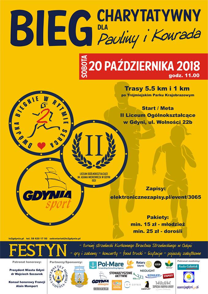 Kolejny wielki zryw serc w II Liceum Ogólnokształcącym. Społeczność szkoły, we współpracy z rodzicami uczniów Dwójki, przygotowuje kolejną akcję charytatywną, która ma wspomóc leczenie dwójki absolwentów szkoły. Bieg jest kontynuacją działań dobroczynnych, które w ubiegłym roku szkolnym zakończyły się wielkim koncertem w Gdynia Arenie, na którym zagrał m. in. zespół Czerwone Gitary. Szkoła ponownie zwraca się do mieszkańców Gdyni z prośbą o wsparcie tej niezwykłej inicjatywy. Szanowni Państwo,Dyrektor oraz Samorząd Uczniowski II Liceum Ogólnokształcącego z Oddziałami Dwujęzycznymi w Gdyni, najstarszego liceum w mieście, znanego jako "Dwójka", zwraca się do Państwa z ogromną prośbą o wsparcie finansowe biegu charytatywnego "Dwójka biegnie w rytmie serca", który odbędzie się w sobotę, dnia 20 października 2018 roku o godz. 11.00 w Trójmiejskim Parku Krajobrazowym - start z boiska II LO przy ulicy Wolności 22b (9.00 - 10.30- rejestracja zawodników). Szczegóły na stronie: lo2gdynia.pl oraz na Facebooku szkoły (II LO im. Adama Mickiewicza oraz Gimnazjum nr 23 w Gdyni). Rejestracja uczestników na stronie: elektronicznezapisy.pl/eventPodczas biegu na boisku odbywać się będzie festyn, w ramach którego odbęda się m. in. gry i zabawy, koncerty, turniej piłki nożnej, zawody strzeleckie Bractwa Kurkowego - będzie można skorzystać też z przygotowanej oferty gastronomicznej i wziąć udział w licytacjach na rzecz naszych podopiecznych. Koszt pakietu startowego to co najmniej 25 zł dorośli oraz co najmniej 15 zł dzieci i młodzież do lat 18. Planujemy przeprowadzić bieg na dystansie 5,5 km oraz 1 km (po lesie). Wsparciem może być również zakup pakietu startowego lub zaproponowanie usługi, która mogłaby pomóc w organizacji biegu. Chcielibyśmy zapewnić uczestnikom pamiątkowy gadżet, wydrukować ulotki i plakaty, zatrudnić firmę do obsługi strony rejestracyjnej biegu oraz mierzenia czasu. Jeśli ktokolwiek z Państwa mógłby nam w tym pomóc, bylibyśmy zobowiązani. Bieg jest kontynuacją działań dobroczynnych skierowanych do naszych uczniów zmagających się z ciężką chorobą nowotworową - Pauliny, bardzo poważnie chorej na białaczkę oraz Konrada, który zmaga się z rzadką, nieoperacyjną chorobą nowotworową - mięsakiem kościopochodnym. Dzięki zeszłorocznego koncertowi charytatywnemu zorganizowanemu przez nas w Gdynia Arenie udało nam się zapewnić środki finansowe na leczenie Pauliny i Konrada na rok. Nadszedł czas, by pomóc im ponownie.Bieg współorganizują z nami: Gdyńskie Centrum Sportu oraz Stowarzyszenie Aktywni.Honorowy patronat nad biegiem dotychczas objęli: Prezydent Miasta Gdyni, dr Wojciech Szczurek oraz Konsul honorowy Francji w Gdyni, Alain Mompert. Patronat medialny: Radio Gdańsk, mlodagdynia.pl i esencjagdyni.pl.Partnerzy: Uniwersytet Morski, Akademia Marynarki Wojennej, Pol-Mare, Rada Dzielnicy Działki Leśne, Serio, Śródmieście, Semco, Neolight, ZKM, GRYF, Klub Rotary, Kohler, Staples, Sopocka Fabryka Urody, Loopy's World Z góry dziękujemy za pozytywne rozpatrzenie naszej prośby, a ewentualne darowizny prosimy przekazać na konto Rady Rodziców przy ZSO Nr 2 w Gdyni, z dopiskiem "Bieg charytatywny". Nr konta: 69 1500 1881 12 10 2002 6804 0000 (Bank Zachodni WBK Gdynia)Z poważaniem,Elżbieta Zarębadyrektor szkoły Kontakt do szkoły i koordynatorów biegu:sekretariat@lo2gdynia.pl, tel. 58 620 17 50Katarzyna Klecha - Przewodnicząca Rady Rodziców przy ZSO nr 2 w Gdyni, tel. 792 662 626Anna Ćwiklińska-Rutka - nauczyciel - koordynator, cwikrut@wp.pl, tel. 608 381 003Maja Makowska - Samorząd Uczniowski Dwójki, tel. 501 138 964Rejestracja: elektronicznezapisy.pl/event Opublikowano: 06.09.2018 09:18 Autor: Aleksandra _Rzewuska (a.rzewuska@gdynia.pl) Zmodyfikowano: 30.11.2018 09:56 Zmodyfikował: Aleksandra Rzewuska