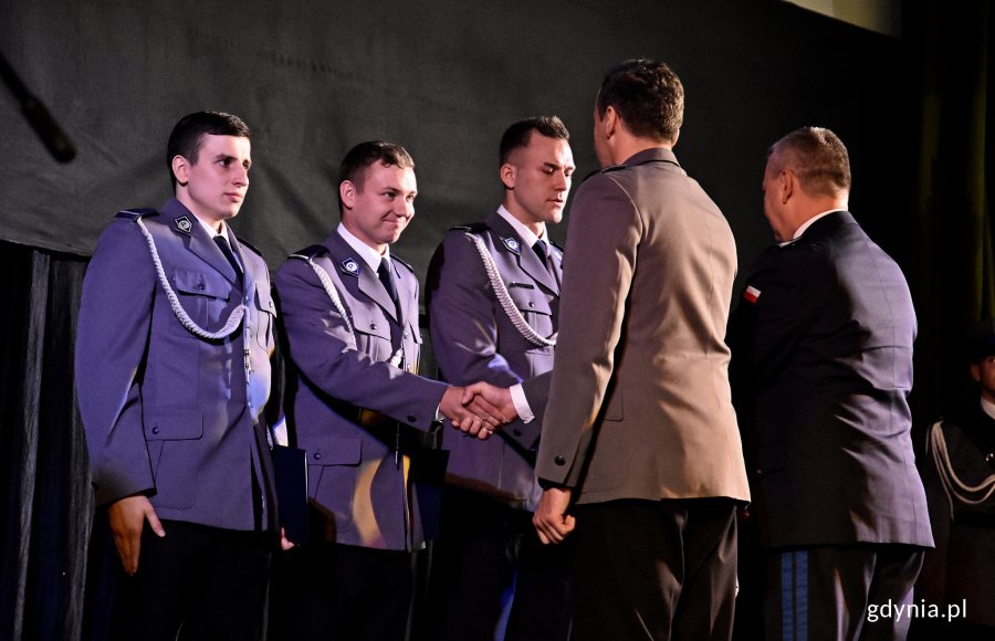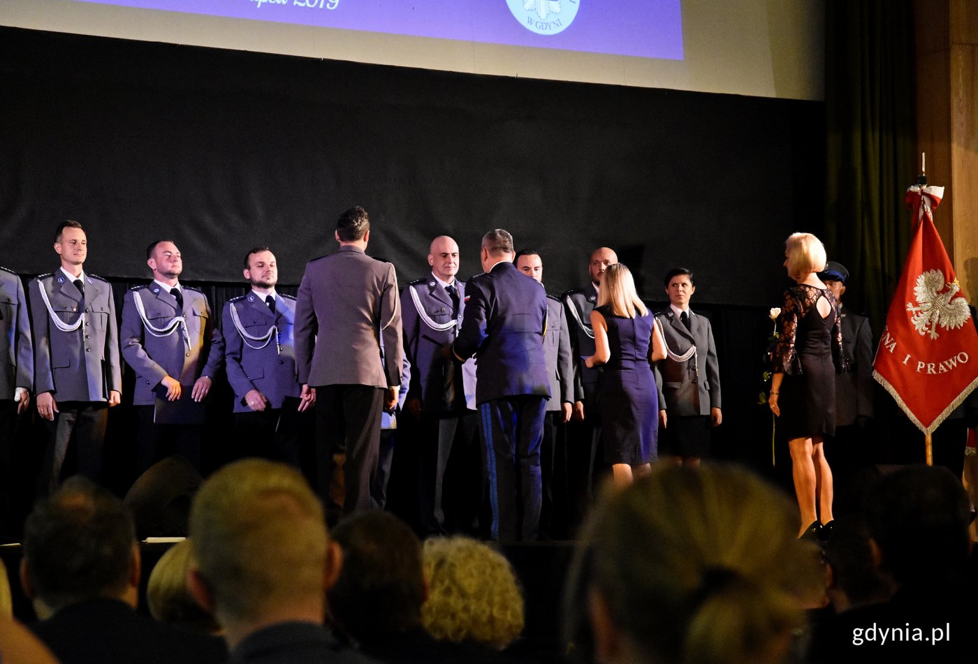 Awanse, nagrody i podziękowania otrzymało w piątek kilkudziesięciu gdyńskich policjantów. Funkcjonariusze z miejskiej komendy i komisariatów z okazji Święta Policji i 100. jubileuszu swojej formacji spotkali się w dawnym kinie „Grom”. Mundurowi odebrali też nagrody przyznane przez prezydenta Gdyni.Święto Policji, które co roku w każdej jednostce jest okazją do uroczystego wręczenia awansów i nagród dla policjantów w tym roku jest wyjątkowe. Mija dokładnie 100 lat od momentu utworzenia Policji Państwowej. Z tej okazji także i gdyńska komenda podczas swoich uroczystości odwołała się do międzywojennych tradycji formacji. Jak się okazuje, Gdynia ze względu na swój portowy charakter zapisała niezwykle ciekawą kartę w historii policji.- Czerpiemy z wzorów Policji Państwowej, tego przykładem jest też patronka wybrana dla województwa pomorskiego, pani Stanisława Paleolog. Wspominam o niej dlatego, że została wybrana na patronkę województwa między innymi dzięki pracy, którą wykonała w Gdyni. W powstającym mieście portowym, jako szefowa Policji Kobiecej walczyła z handlem ludźmi, opiekowała się kobietami, które tutaj przebywały, także dziećmi. W tym roku, z okazji 100-lecia powstania Policji Państwowej odsłanialiśmy tablicę pamiątkową na jej grobie w Manchesterze – mówił podczas gdyńskiego Święta Policji nadinsp. Jarosław Rzymkowski, Komendant Wojewódzki Policji w Gdańsku.Funkcjonariusze pracujący na co dzień w Komendzie Miejskiej, ale też w sześciu gdyńskich komisariatach odebrali na scenie m.in. awanse na wyższe stopnie i nagrody. Nagradzano m.in. tych funkcjonariuszy, którzy w ostatnim roku zajmowali wysokie miejsca w sportowej rywalizacji mundurowych z całej Polski.Stałym elementem święta gdyńskiej policji są także nagrody prezydenta Gdyni dla wyróżniających się policjantów. To wyróżnienia przyznawane „za wzorowe wypełnianie obowiązków służbowych na rzecz bezpieczeństwa mieszkańców Gdyni”. W tym roku to łącznie 9 funkcjonariuszy, którzy zostali nagrodzeni nagrodami pieniężnymi. Gratulował im wiceprezydent Gdyni ds. jakości życia, Bartosz Bartoszewicz, który podczas swojego przemówienia podkreślił rolę skutecznej policji w procesie rozwoju miasta.- W imieniu pana prezydenta, własnym, ale także wszystkich mieszkańców Gdyni składam serdeczne gratulacje dla wszystkich dziś wyróżnionych i nagrodzonych osób. Nie mam najmniejszych wątpliwości, że to państwa indywidualne zaangażowanie pomaga wpłynąć na ogólny wizerunek gdyńskiej policji, który w oczach gdynian jest odczytywany jako niezwykle pozytywny – zaznaczył Bartosz Bartoszewicz, wiceprezydent Gdyni ds. jakości życia. - Dziś wiemy z materiałów archiwalnych o tym, że jednym z największych problemów Gdyni było poczucie bezpieczeństwa. Wiemy o tym, że gdynianie w pierwszej kolejności oczekiwali jego wzrostu, z uwagi na zmiany, jakie następowały po prostu mieli obawy o swoje życie. Dziś takiego wniosku już nie ma, dziś wszyscy jako gdynianie czujemy się bezpieczni i to bezwzględnie zasługa naszej policji. Jesteśmy miastem gotowym na to, by gościć imprezy o charakterze ogólnoświatowym – podkreślił wiceprezydent.Przypomnijmy, że współpraca miasta z Komendą Miejską przynosi dobre efekty - zarówno w postaci projektów miękkich, czyli np. akcji prewencyjnych i promujących troskę o bezpieczeństwo, jak i w postaci większych inwestycji – aktualnie coraz bliżej ukończenia jest budowa zupełnie nowego komisariatu policji na Chwarznie-Wiczlinie, dokąd przeniosą się funkcjonariusze pracujący na Witominie. Gdynia regularnie współfinansuje też zakup nowych radiowozów. Galeria zdjęć Pobierz galerię Święto Policji w Gdyni, fot. Kamil Złoch Pobierz zdjęcie Święto Policji w Gdyni, fot. Kamil Złoch Pobierz zdjęcie Święto Policji w Gdyni, fot. Kamil Złoch Pobierz zdjęcie Święto Policji w Gdyni, fot. Kamil Złoch Pobierz zdjęcie Święto Policji w Gdyni, fot. Kamil Złoch Pobierz zdjęcie Święto Policji w Gdyni, fot. Kamil Złoch Pobierz zdjęcie Święto Policji w Gdyni, fot. Kamil Złoch Pobierz zdjęcie Święto Policji w Gdyni, fot. Kamil Złoch Pobierz zdjęcie Święto Policji w Gdyni, fot. Kamil Złoch Pobierz zdjęcie Święto Policji w Gdyni, fot. Kamil Złoch Pobierz zdjęcie Święto Policji w Gdyni, fot. Kamil Złoch Pobierz zdjęcie Święto Policji w Gdyni, fot. Kamil Złoch Pobierz zdjęcie Święto Policji w Gdyni, fot. Kamil Złoch Pobierz zdjęcie Święto Policji w Gdyni, fot. Kamil Złoch Pobierz zdjęcie Święto Policji w Gdyni, fot. Kamil Złoch Pobierz zdjęcie Warunki pobierania Wszelkie prawa do zdjęć lub grafik prezentowanych w ramach portalu, należą do Prowadzącego portal lub do podmiotów z nim współpracujących i podlegają ochronie prawnej. Prowadzący portal zezwala na kopiowanie i przedstawianie utworów jedynie w celach niekomercyjnych oraz pod warunkiem zachowania go w oryginalnej postaci i zachowaniem kontekstu tematu, do którego zostało wykorzystaneprzez redakcję gdynia.pl. Opublikowane materiały powinny zawsze zawierać źródło, czyli adres strony www.gdynia.pl. Na publikowanie utworów w innych celach wymagana jest zgoda właściciela strony czyli Prowadzącego portal. Opublikowano: 19.07.2019 14:46 Autor: Kamil Złoch (kamil.zloch@gdynia.pl) Zmodyfikowano: 19.07.2019 15:06 Zmodyfikował: Agnieszka Janowicz