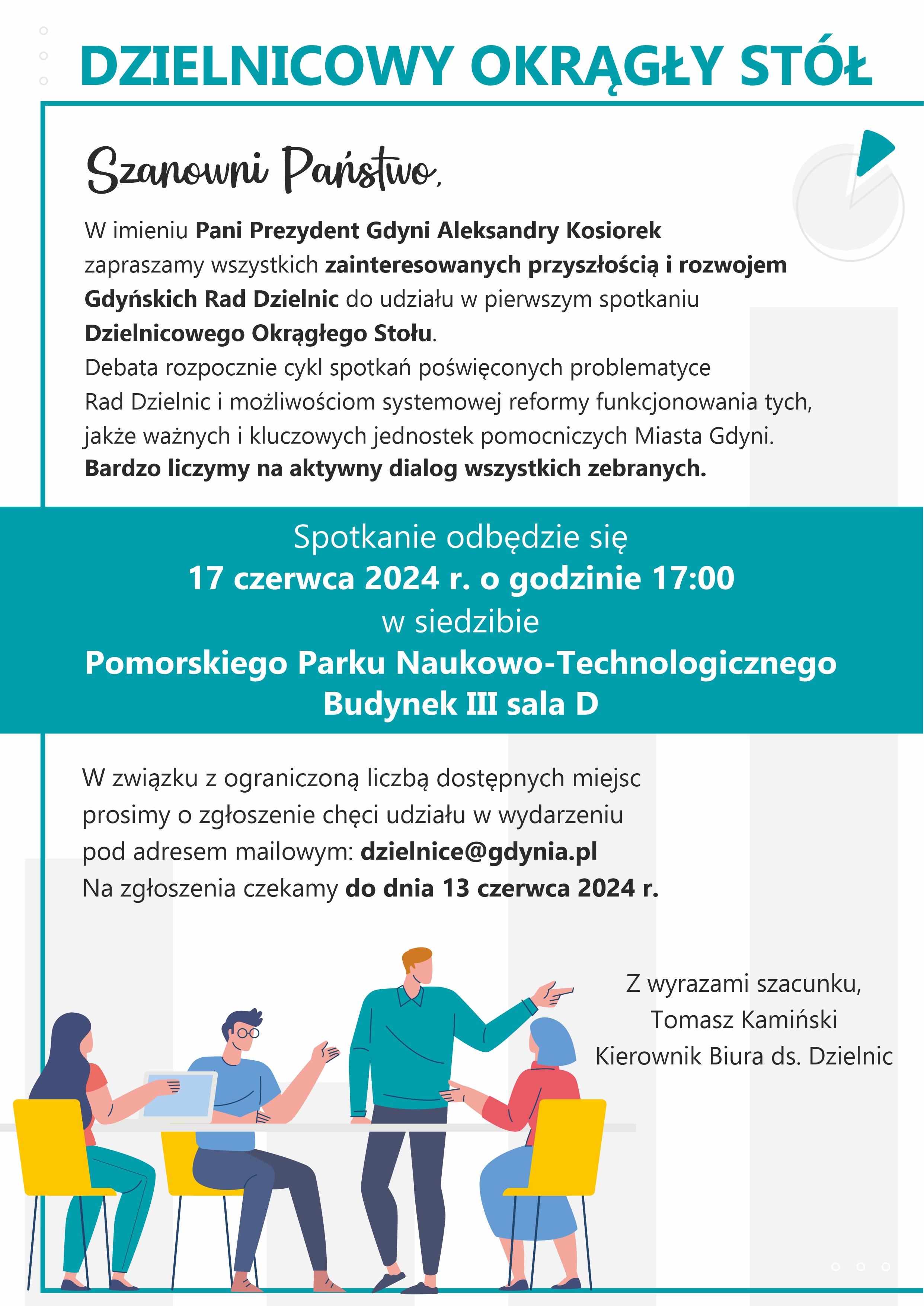 W imieniu prezydent Gdyni Aleksandry Kosiorek zapraszamy wszystkich zainteresowanych przyszłością i rozwojem gdyńskich rad dzielnic do udziału w pierwszym spotkaniu Dzielnicowego Okrągłego Stołu. Spotkanie odbędzie się w dniu 17 czerwca o godz. 17.00 w siedzibie Pomorskiego Parku Naukowo-Technologicznego (Budynek III sala D).W związku z ograniczoną liczbą dostępnych miejsc prosimy o zgłoszenie chęci udziału w wydarzeniu pod adresem mailowym: dzielnice@gdynia.plNa zgłoszenia czekamy do 13 czerwca. Opublikowano: 17.06.2024 13:10 Autor: Joanna Majchrowska (joanna.majchrowska@gdynia.pl) Zmodyfikowano: 18.06.2024 09:06 Zmodyfikował: Joanna Majchrowska
