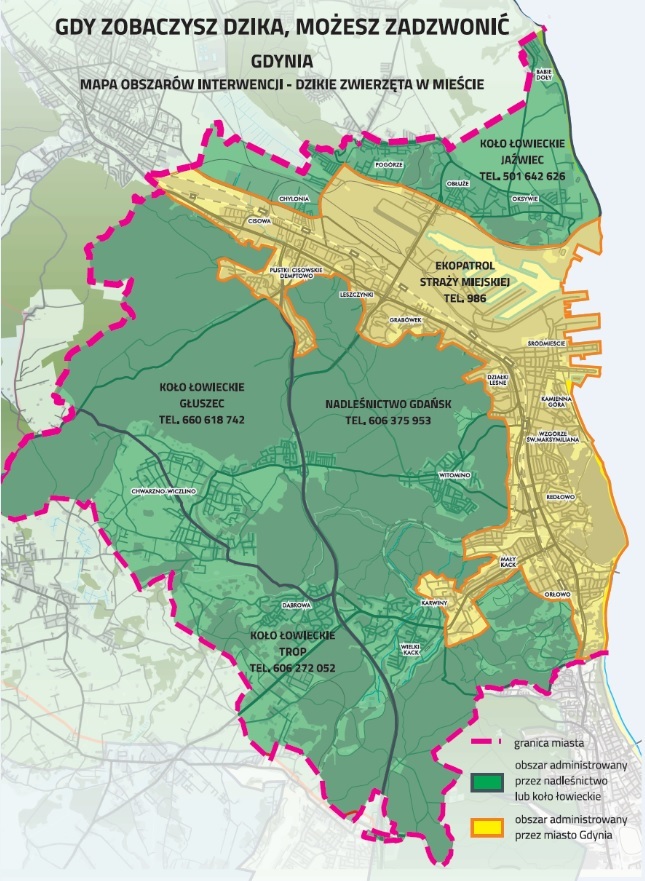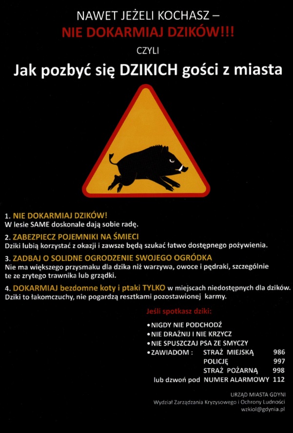 Dziki to już stali goście na terenach zurbanizowanych. Liczba interwencji podejmowanych przez służby miejskie, w związku z ich obecnością w mieście, stale rośnie. Zwierzęta zwabione możliwością łatwego znalezienia posiłku i wyrzuconymi resztkami jedzenia, wychodzą z lasu i podchodzą w okolice osiedli mieszkaniowych i ludzkich domostw. Co zrobić, kiedy spotkamy dzika na swojej drodze? Jak się zachować i do kogo się zgłosić? Najważniejsze to zachować spokój. A żeby dziki zniechęcić do spacerów przy naszych domach, należy pamiętać, aby ich nie dokarmiać, nie wykładać jedzenia luzem i zamykać wiaty śmietnikowe. Lipiec i sierpień były rekordowe pod względem interwencji podjętych przez Straż Miejską w związku z dzikami grasującymi na terenie zurbanizowanym. W lipcu służby otrzymały 253 zgłoszenia w tej sprawie. W sierpniu było ich tylko trochę mniej, bo 239. Najwięcej interwencji podejmowano w rejonie Karwin, Małego Kacka, Fikakowa i Chylonii, gdzie w pobliżu osiedli mieszkaniowych są też tereny leśne. Obowiązujące przepisy dają możliwość odłowu dzików, jednak zabraniają przesiedlania tych zwierząt. – W związku z zagrożeniem ASF (afrykański pomór świń) obowiązuje zakaz przesiedlania dzików odłowionych na terenach zurbanizowanych w odległe od miasta tereny leśne. Jednak gdyńskie służby odpowiedzialne za porządek publiczny odnotowują zwiększoną liczbę zgłoszeń związanych z pojawianiem się dzików w rejonie osiedlowych zabudowań. Dlatego prowadzony jest odstrzał redukcyjny dzików. Odstrzał prowadzi wyspecjalizowana firma i robi to wyłącznie na obszarze wyłączonym z polowań, to znaczy na terenach zabudowanych lub bezpośrednio do nich przylegających. Odłowu dokonuje się w warunkach gwarantujących bezpieczeństwo osób trzecich. Jeśli w Państwa okolicy będzie prowadzona akcja odławiania bądź odstrzału, proszę o bezwzględne stosowania się do zaleceń osób zabezpieczających teren – tłumaczy Zdzisław Kobyliński, naczelnik wydziału Zarządzania Kryzysowego i Ochrony Ludności w Urzędzie Miasta Gdyni. Gdy zobaczysz dzika…zachowaj spokój Dlaczego dziki tak chętnie wychodzą z lasu i odwiedzają pobliskie osiedla mieszkaniowe i domy? Przyczyna jest prosta – tu łatwiej im znaleźć pożywienie. Dziki chętnie korzystają z darmowej stołówki i resztek jedzenia wyrzuconych przez mieszkańców. Dlatego podstawowa zasada to nie dokarmiać dzików. Należy też zabezpieczać wiaty śmietnikowe i pojemniki, żeby zwierzęta nie dostały się do pozostawionych tam odpadków. Osoby dokarmiające bezdomne koty czy ptaki również powinny pamiętać, żeby wystawiać pokarm w miejscach niedostępnych dla dzików. Co zrobić, kiedy już spotkamy dzika na swojej drodze. Strażnicy miejscy apelują, żeby przede wszystkim zachować spokój. – Najlepiej ominąć zwierzę lub odwrócić się i pójść w drugą stronę. Nie należy też krzyczeć, hałasować czy wykonywać gwałtownych ruchów. Dzik sam z siebie nie zaatakuje człowieka. Jednak spłoszony może zachować się różnie. Gdy jesteśmy z psem trzeba jak najszybciej oddalić się z miejsca, gdyż nasz pupil może sprowokować dzika do ataku. W szczególności, gdy jest to locha z młodymi. I tutaj też należy pamiętać o zasadzie bezpieczeństwa. Nie podnośmy małych dzików na ręce i ich nie głaszczmy – radzi Leonard Wawrzyniak, rzecznik prasowy gdyńskiej Straży Miejskiej. Straż Miejska nie zajmuje się odłowem dzików, ale nie pozostawia mieszkańców bez pomocy. Odpowiadają na każde zgłoszenie. Patrol nie może jednak złapać zwierząt. Strażnicy zabezpieczają jedynie teren, kiedy ktoś czuje się zagrożony i jeśli jest taka możliwość, starają się wyprowadzić dziki z powrotem do lasu. – Reagujemy na wszystkie zgłoszenia dotyczące dzików. Patrol przyjeżdża na miejsce w sytuacji zagrożenia, na przykład, gdy dzik wejdzie na teren szkoły, prywatną posesję lub gdy osoba zgłaszająca boi się zwierzęcia – podkreśla Wawrzyniak. Ekopatrol edukuje także mieszkańców poprzez prowadzenie pogadanek w przedszkolach, szkołach, spotkaniach z mieszkańcami, festynach rodzinnych oraz rozwieszając ulotki na temat dzików. W zależności od obszaru miasta za interwencje związane z dzikami odpowiedzialne są różne jednostki. Kontakt do nich można znaleźć na załączonej mapie: Opublikowano: 12.09.2019 13:40 Autor: Redakcja portalu Gdynia.pl (wydz.komsp@gdynia.pl) Zmodyfikowano: 12.09.2019 14:40 Zmodyfikował: Karolina Szypelt