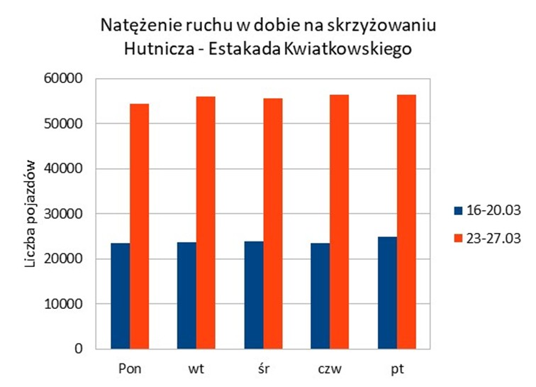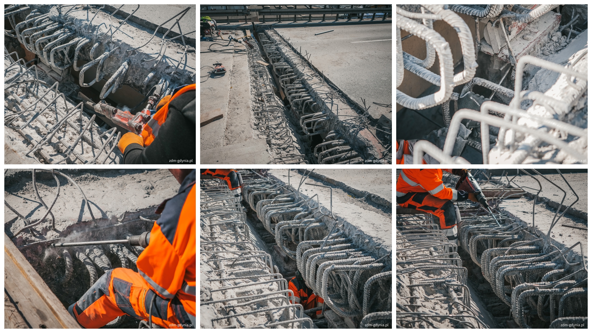 Na Estakadzie Kwiatkowskiego kontynuowane są roboty związane z naprawą przegubu konstrukcyjnego. To jeden z najważniejszych elementów całej konstrukcji – jego stan techniczny został zakwalifikowany jako awaryjny. Na placu budowy widać wyraźny postęp – zdemontowano dylatacje, skuty został górny wspornik przegubu, a obecnie trwa rozkuwanie dolnego wspornika.Po wykonaniu tych prac rozpoczną się kolejne etapy związane z odtwarzaniem elementów konstrukcyjnych. Roboty prowadzone są w systemie zmianowym, co pozwala sprawnie przechodzić do kolejnych faz realizacji. Trwa rozkuwanie dolnego wspornika przegubu Estakady Kwiatkowskiego (fot. Marcin Mielewski, Zarząd Dróg Miejskich ) Ruch zaplanowany, nie przypadkowy Zmianę organizacji ruchu w rejonie estakady przygotowano na podstawie konkretnych danych, a nie doraźnych decyzji. Przed zamknięciem głównego ciągu przeprowadzono pomiary ruchu w obrębie skrzyżowania z ul. Hutniczą. Na ich podstawie przygotowano analizę z wykorzystaniem mikrosymulacji ruchu, która pozwoliła sprawdzić różne warianty funkcjonowania układu drogowego.Wybrano rozwiązanie, które w symulacji dawało najlepsze rezultaty.Efekt to zmienione działanie sygnalizacji świetlnej: zmieniony układ faz ruchu, dostosowanie długości sygnałów zielonych dla poszczególnych relacji. wyraźnie zwiększony maksymalny czas zielonego dla relacji zjazdowych z estakady. To właśnie te kierunki przejęły największy strumień pojazdów po zamknięciu głównej jezdni. System reaguje na rzeczywisty ruch Sytuacja drogowa w rejonie estakady i na innych ulicach jest na bieżąco monitorowana i na bieżąco korygowana (fot. Marcin Mielewski, Zarząd Dróg Miejskich) Nowa organizacja ruchu nie działa według jednego, stałego schematu. Sygnalizacja świetlna w rejonie ul. Hutniczej działa dynamicznie i dostosowuje się do rzeczywistego obciążenia ruchem. System TRISTAR wykorzystuje dane z urządzeń detekcji i na bieżąco zmienia długość sygnałów: przy mniejszym natężeniu ruchu zielone światło jest skracane, uzyskany czas przekazywany jest bardziej obciążonym relacjom, w przypadku większego ruchu możliwe jest wydłużenie sygnału w ramach przyjętych zakresów. Nad działaniem systemu czuwają pracownicy Samodzielnego Referatu Sygnalizacji Świetlnej i Planowania Transportu w Zarządzie Dróg Miejskich, którzy analizują dane i wprowadzają korekty w jego pracy. Korekty po wdrożeniu Od momentu wprowadzenia czasowej organizacji ruchu sytuacja jest stale analizowana. Dane z detektorów pokazują, jak zmienia się natężenie ruchu w ciągu dnia i w kolejnych dniach funkcjonowania układu (fot. Marcin Mielewski, Zarząd Dróg Miejskich) Na tej podstawie wprowadzono już pierwsze korekty: zmieniono zakresy maksymalnego wydłużania sygnałów zielonych, dopasowano działanie algorytmu do różnych pór dnia, doprecyzowano warunki wydłużania i skracania sygnałów. To proces ciągły - układ jest na bieżąco dostosowywany do rzeczywistych zachowań kierowców. 57 tysięcy pojazdów przez jedno skrzyżowanie mat. Zarządu Dróg Miejskich w Gdyni Dane od pierwszego dnia roboczego obowiązywania nowej organizacji ruchu pokazują wyraźny trend – natężenie ruchu stopniowo rosło. Obecnie przez skrzyżowanie z ul. Hutniczą przejeżdża ponad 57 tysięcy pojazdów na dobę.Jeszcze przed zamknięciem głównego ciągu estakady w godzinach szczytu przez ten odcinek przejeżdżało ponad 3700 samochodów w obu kierunkach w ciągu godziny. To pokazuje skalę ruchu, z jaką musi dziś mierzyć się ten fragment układu drogowego. Utrudnienia odczuwalne w całym mieście Zmiana organizacji ruchu w tym miejscu nie ma charakteru lokalnego. To jeden z kluczowych punktów układu drogowego Gdyni, dlatego jej wpływ odczuwalny jest w wielu częściach miasta.Ruch monitorowany jest nie tylko w rejonie ul. Hutniczej, ale również na trasach alternatywnych: ul. Morska, ul. Chwarznieńska, ul. Wielkopolska, ul. Dworcowa w kierunku ul. Podjazd, inne odcinki ul. Hutniczej. Pozwala to reagować w całym układzie drogowym, który przejął dodatkowe obciążenie. Apel do kierowców Estakada Kwiatkowskiego (fot. Marcin Mielewski, Zarząd Dróg Miejskich) Estakada Kwiatkowskiego jest jedną z kluczowych tras w mieście, dlatego przy obecnej organizacji ruchu każda dodatkowa liczba pojazdów ma znaczenie.Apelujemy, aby z przejazdu w tym rejonie korzystali przede wszystkim ci kierowcy, dla których jest to rzeczywiście konieczne. Jeśli nie ma konieczności przejazdu tym odcinkiem, warto skorzystać z tras alternatywnych lub innych środków transportu.Utrudnienia związane z remontem potrwają do końca czerwca, a ich przebieg wynika bezpośrednio z technologii robót – szczególnie etapów związanych z odtwarzaniem konstrukcji i procesem wiązania betonu, którego nie da się przyspieszyć.Przy takim natężeniu ruchu utrudnienia są nieuniknione i odczuwalne. Sytuacja jest jednak stale monitorowana, a organizacja ruchu na bieżąco dostosowywana do rzeczywistych warunków.Prosimy kierowców o zachowanie szczególnej ostrożności w rejonie prowadzonych prac i stosowanie się do tymczasowego oznakowania. Opublikowano: 07.04.2026 10:30 Autor: Marcin Mielewski (m.mielewski@zdiz.gdynia.pl) Zmodyfikowano: 07.04.2026 10:34 Zmodyfikował: Aleksandra Dylejko