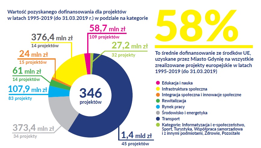 1 maja mija 15. rocznica wejścia Polski do Unii Europejskiej. W tym czasie nasz kraj przeszedł ogromną metamorfozę. Zmieniła się też Gdynia. Dzięki środkom europejskim w mieście realizowano wiele inwestycji i projektów. Dotyczyły one m.in. rozwoju infrastruktury transportowej, społecznej, ochrony środowiska i poprawy efektywności energetycznej czy rozwoju edukacji i nauki. W Gdyni, przy unijnym wsparciu, wykonaliśmy do tej pory w sumie 346 projektów. Łączny koszt ich realizacji to 4,16 mld złotych, z czego dofinansowanie ze środków Unii Europejskiej wyniosło 2 438 545 547 złotych. Pozytywne skutki naszej obecności w Unii Europejskiej widać gołym okiem. Wspólny rynek korzystnie wpłynął na sytuację gospodarczą Polski. A dzięki środkom europejskim samorządy mogły zrealizować wiele projektów. Powstały liczne inwestycje infrastrukturalne, nowoczesne obiekty sportowe i kulturalne czy rewitalizacje. Unowocześniane są szkoły, możemy też przemieszczać się szybciej i bezpieczniej. Dodatkowo mieszkańcy mają również możliwość korzystania z programów społecznych. Gdynia korzysta z unijnego dofinansowania od wielu lat. Pierwsze środki przyznano naszemu miastu jeszcze przed wejściem Polski do Unii Europejskiej - w ramach projektów przedakcesyjnych. Od 1995 do końca pierwszego kwartału 2019 roku w Gdyni zrealizowano łącznie 346 projektów, na które pozyskano, z różnego rodzaju europejskich programów i funduszy, aż 2 438 545 547 złotych. Kwota ta pokryła ponad połowę całkowitego kosztu ich wykonania, który wyniósł 4,16 mld złotych.– Gdynia wykorzystała swoją szansę. Udało nam się realnie poprawić komfort życia, korzystamy z wygodnego i ekologicznego transportu miejskiego, mamy czyste plaże i chronimy środowisko, pijemy zdrową wodę prosto z kranu, szkoły zawodowe mają nowoczesne pracownie, rewitalizujemy gdyńskie dzielnice, mamy czyste powietrze, a dzięki termomodernizacji obiektów oświatowych i budynków mieszkalnych sukcesywnie zmniejszamy emisję gazów cieplarnianych. Powstały nowe połączenia drogowe, ścieżki rowerowe. Sprawy urzędowe możemy załatwić bez wychodzenia z domu, wspieramy osoby z niepełnosprawnościami, bezrobotne, zagrożone wykluczeniem społecznym. Wybudowaliśmy nowe placówki kultury, domy sąsiedzkie, Centrum Nauki Experyment, uczniowie korzystają z programów wymian międzynarodowych, a innowacyjne firmy korzystają z największego w Polsce Pomorskiego Parku Naukowo-Technologicznego Gdynia. Unia to nie tylko środki na rozwój, ale wspólna historia, tożsamość, te same korzenie kulturowe. Warto bronić tych wartości i warto być dumnym z bycia częścią europejskiej wspólnoty – mówi Wojciech Szczurek, prezydent Gdyni.Spośród wszystkich 346 projektów największe dofinansowanie udało się uzyskać na inwestycje dotyczące rozwoju infrastruktury transportowej. W tej kategorii pozyskano 1,4 mld złotych. Dzięki tym środkom zrealizowano 45 projektów. Drugą co do wielkości wartość dofinansowania z funduszy unijnych udało się zdobyć na realizację infrastruktury społecznej. Wyniosła ona 376,4 mln złotych, za które wykonano 14 projektów. Trzecia najwyższa kwota – 373,4 mln złotych została pozyskana na realizację 34 projektów w kategorii środowisko i energetyka. Poniżej grafika prezentująca wartość pozyskanego dofinansowania dla wszystkich dotychczasowych projektów - w podziale na kategorie. Pełna baza gdyńskich projektów wykonanych dzięki dofinansowaniu ze środków Unii Europejskiej znajduje się na stronie www.gdynia.pl/projektyeuropejskie. Natomiast lista projektów zrealizowanych na Pomorzu jest dostępna na stronie www.rpo.pomorskie.eu/baza-projektow. – U progu nowego milenium nie mieliśmy w Gdyni najmniejszej wątpliwości co do tego, czy obecność Polski w Unii Europejskiej jest potrzebna i czy ma sens. Byliśmy przekonani, że nie ma innej drogi i lepszego sposobu na rozwój miasta, województwa i kraju. Dostaliśmy niepowtarzalną szansę na otwarcie granic, rozwój gospodarczy, przepływ idei i pomysłów. 1 maja mija 15 lat obecności Polski w Unii Europejskiej. Gdynia wykorzystała ten czas w 100 procentach! Przed nami kolejne lata i wyzwania. Trwa realizowana ze wsparciem unijnym rewitalizacja dzielnic Gdyni. Wkrótce ruszy budowa węzłów na Karwinach i w Chyloni. Pracujemy nad wspólnym, ujednoliconym biletem, który w niedługim czasie silniej zintegruje naszą metropolię. Bez środków unijnych nie udałoby się nam dokonać tak wiele i tak szybko. Wszystkim, którzy przez te lata pracowali na wspólny sukces dziękuję za wytrwałość i zaangażowanie. Dzięki Wam jakość życia w Gdyni jest coraz wyższa. Przed nami kolejne szanse i wyzwania. Jestem przekonany, że wspólnie zrobimy jeszcze więcej dla mieszkańców Gdyni i regionu – mówi Michał Guć, wiceprezydent Gdyni ds. innowacji Dni Otwarte Funduszy Europejskich Za nieco ponad tydzień wszyscy zainteresowani tematem inwestycji i przedsięwzięć, które powstały przy udziale funduszy europejskich, będą mieli okazję się z nimi zapoznać. Od 10 do 12 maja w Gdyni i na całym Pomorzu odbędą się Dni Otwarte Funduszy Europejskich. W tych dniach z bliska będzie można przyjrzeć się temu, co powstało w naszej najbliższej okolicy, dzięki unijnemu dofinansowaniu. W Gdyni w swoje progi zaproszą: Centrum Sąsiedzkie Przystań Śmidowicza 49, baza PKA, Teatr Muzyczny i Leśny Ogród Botaniczny „Marszewo”. Zaplanowano zwiedzanie i inne atrakcje. Będzie też można poczuć się jak na morzu i zobaczyć wielofunkcyjny mostek nawigacyjny. Natomiast Powiatowy Urząd Pracy w Gdyni zaprezentuje swoją ofertę realizowanych projektów. Przewidziano również quiz wiedzy o Unii Europejskiej, prezentację na temat rynku pracy oraz prelekcję na temat ścieżki kariery. Szczegółowy program jest dostępny na stronie: www.dniotwarte.eu. Gdyńskie projekty Po