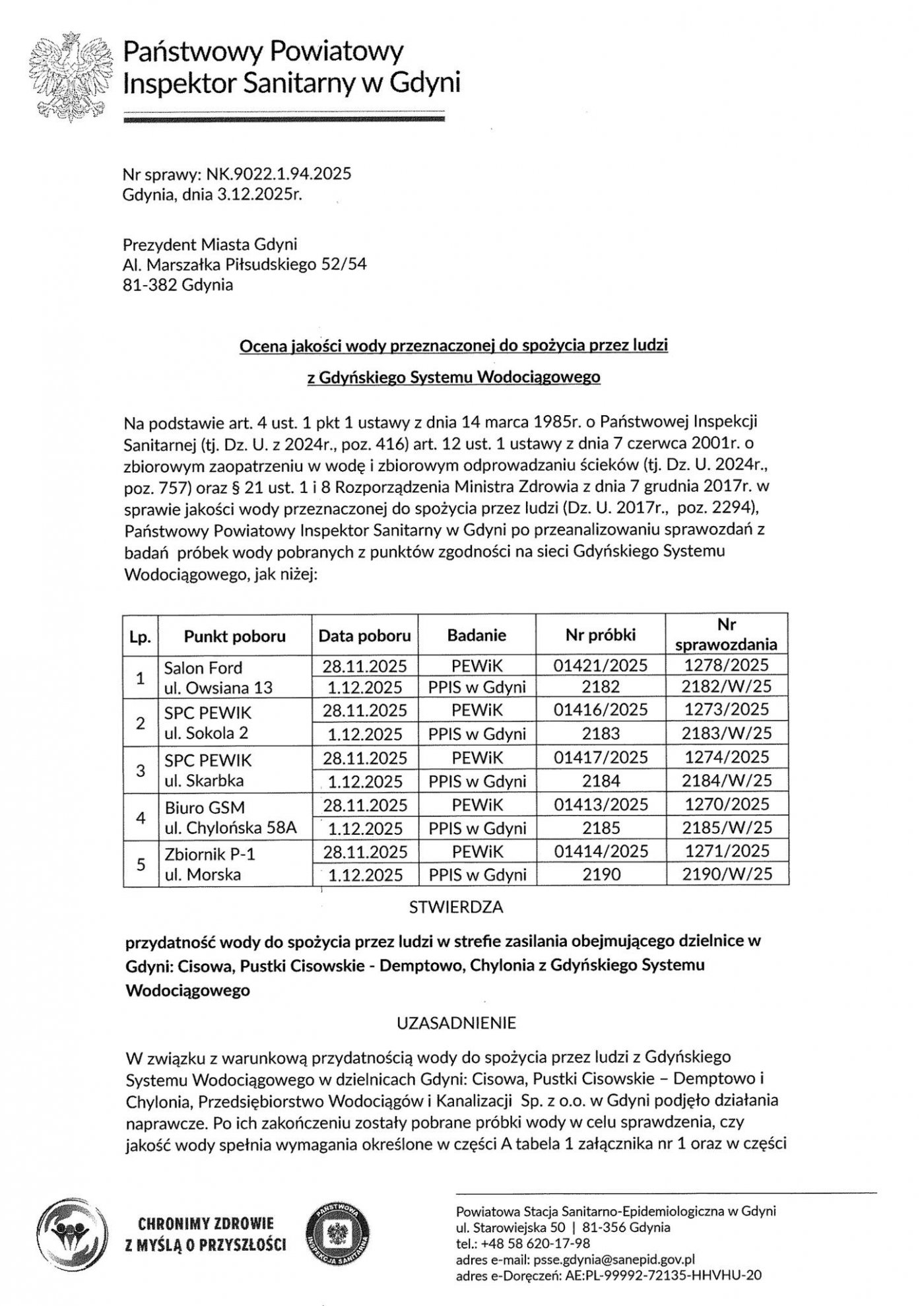 Przedsiębiorstwo Wodociągów i Kanalizacji Sp. z o.o. w Gdyni poinformowało, że zgodnie z treścią Komunikatu z dnia 03.12.2025 wydanego przez Państwowego Powiatowego Inspektora Sanitarnego w Gdyni woda w strefie zasilania dzielnic: Gdynia Cisowa, Pustki Cisowskie – Demptowo i Chylonia spełnia mikrobiologiczne wymagania jakości wody wynikające z Rozporządzenia Ministra Zdrowia w sprawie jakości wody przeznaczonej do spożycia przez ludzi z dnia 7 grudnia 2017 r. (Dz.U. 2017 r. , poz. 2294) i jest przydatna do spożycia przez ludzi. Aktualne komunikaty PEWIK Gdynia dostępne są na stronie pewik.gdynia.pl. Galeria zdjęć Pobierz galerię Komunikat z dnia 03.12.2025, wydany przez Państwowego Powiatowego Inspektora Sanitarnego w Gdyni (cz. 1) Pobierz zdjęcie Komunikat z dnia 03.12.2025, wydany przez Państwowego Powiatowego Inspektora Sanitarnego w Gdyni (cz. 2) Pobierz zdjęcie Komunikat z dnia 03.12.2025, wydany przez Państwowego Powiatowego Inspektora Sanitarnego w Gdyni (cz. 3) Pobierz zdjęcie Warunki pobierania Wszelkie prawa do zdjęć lub grafik prezentowanych w ramach portalu, należą do Prowadzącego portal lub do podmiotów z nim współpracujących i podlegają ochronie prawnej. Prowadzący portal zezwala na kopiowanie i przedstawianie utworów jedynie w celach niekomercyjnych oraz pod warunkiem zachowania go w oryginalnej postaci i zachowaniem kontekstu tematu, do którego zostało wykorzystaneprzez redakcję gdynia.pl. Opublikowane materiały powinny zawsze zawierać źródło, czyli adres strony www.gdynia.pl. Na publikowanie utworów w innych celach wymagana jest zgoda właściciela strony czyli Prowadzącego portal. Kontakt PEWIK GDYNIA Sp. z o.o. https://pewik.gdynia.pl bok@pewik.gdynia.pl +48586687311 Opublikowano: 03.12.2025 14:14 Autor: Paweł Jałoszewski (pawel.jaloszewski@gdynia.pl) Zmodyfikowano: 03.12.2025 14:21 Zmodyfikował: Aleksandra Dylejko