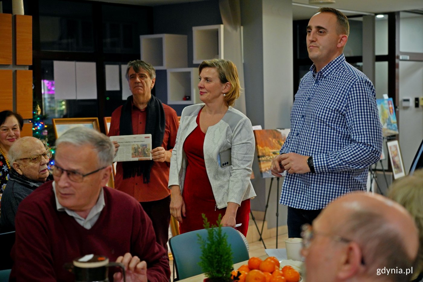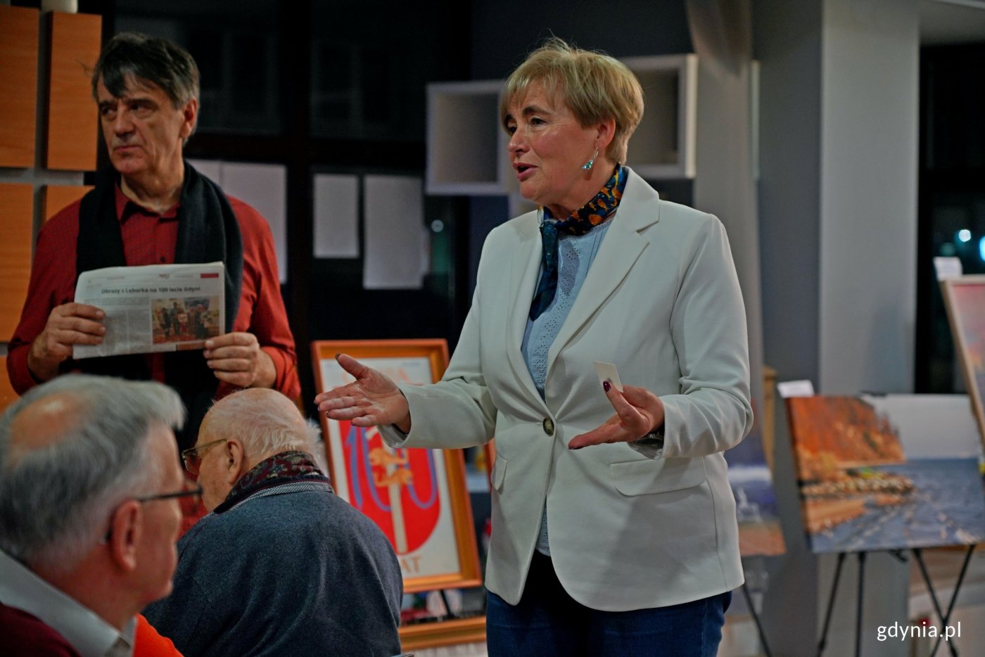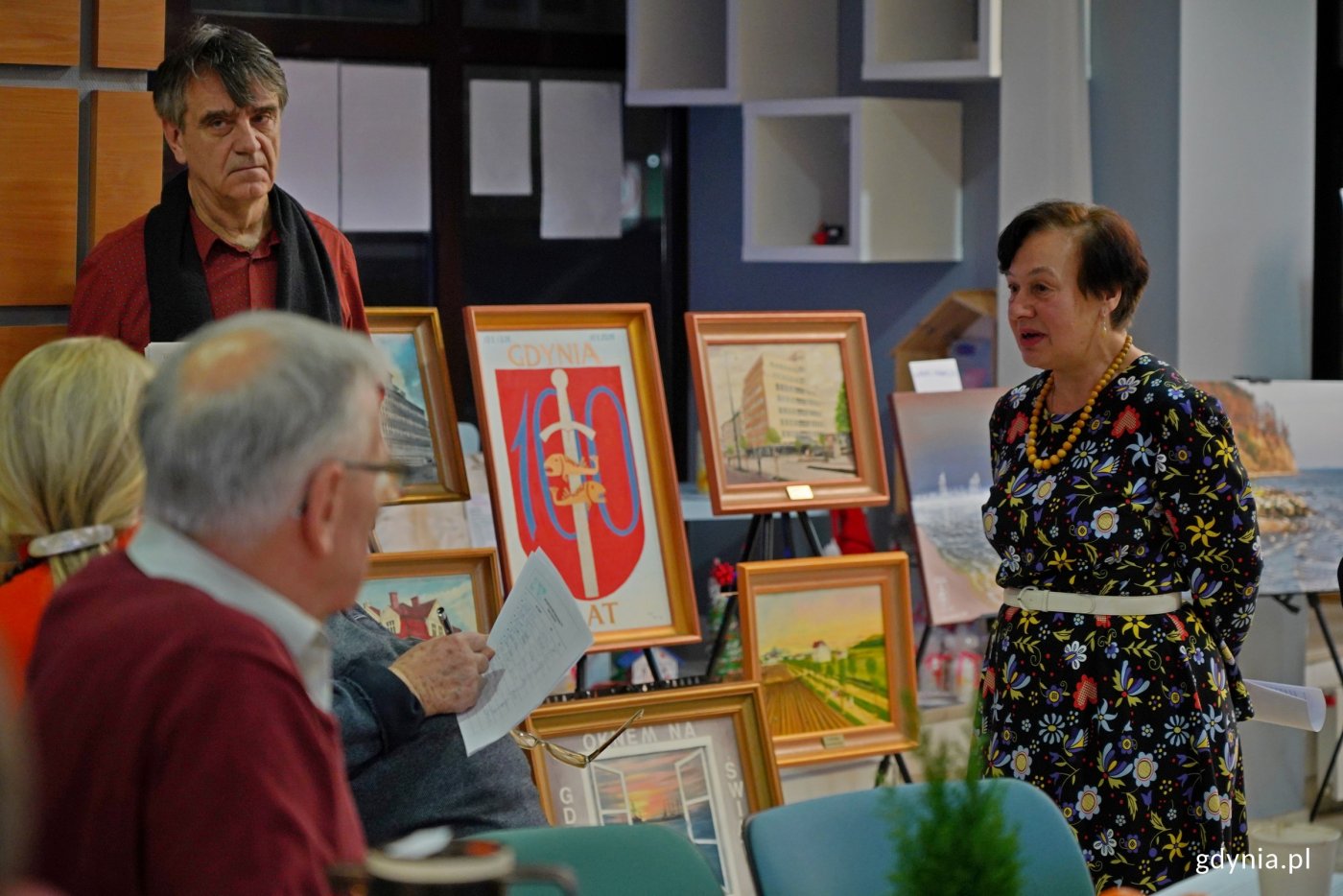 Kiedyś i dziś – to był główny motyw prewernisażu wystawy „100 obrazów na 100-lecie Gdyni”. Prace Marka Koguta i jego przyjaciół tym razem zaprezentowano w Gdyńskim Centrum Organizacji Pozarządowych. Wydarzenie towarzyszyło spotkaniu wigilijnemu Oddziału Morskiego Polskiego Towarzystwa Turystyczno-Krajoznawczego. Obrazy olejne Marka Koguta przedstawiają m.in. morze, flotę czy architekturę Gdyni. Artysta tworzył je przez 10 lat z myślą o stuleciu miasta. A do projektu zaprosił też swoich przyjaciół. I tak powstała wystawa „100 obrazów na 100-lecie Gdyni”. Jako że jubileusz miasta zbliża się wielkimi krokami, część prac jest prezentowana w ramach prewernisaży. Pierwszy z nich zorganizowano pod koniec października w siedzibie Towarzystwa Miłośników Gdyni. A kolejny odbył się we wtorek, 16 grudnia w Gdyńskim Centrum Organizacji Pozarządowych. Uczestniczyła w nim m.in. radna miasta Teresa Bysewska. „100 obrazów na 100-lecie miasta” to wspaniała, oddolna inicjatywa. I wydaje mi się, że najfajniejsze w tym wszystkim jest to, że nasi mieszkańcy sami realizują ciekawe eventy i spotkania na stulecie miasta. Dlatego wszystkim polecam. Wystawa była już prezentowana w Warszawie. W tej chwili jest w Gdyńskim Centrum Organizacji Pozarządowych. Wiem, że w styczniu będzie brała udział w Wielkiej Orkiestrze Świątecznej Pomocy. Wszystkich zachęcam do tego, aby tę wystawę obejrzeć i się inspirować, aby każdy znalazł w sobie takie sto obrazów na stulecie miasta – mówi Teresa Bysewska. Wideo i montaż: Przemek DopkeŁącznie zaprezentowano 20 prac. Obrazy Marka Koguta przedstawiały m.in. znane miejsca w Gdyni zestawione w parach – kiedyś i dziś. Natomiast dzieła przyjaciół skupiły się na popularnych lokalizacjach i charakterystycznych punktach w mieście. Marek Kogut zaproponował, że będzie to wystawa z przyjaciółmi. Uważam się za przyjaciółkę i chciałabym pokazać swoje prace, które zrobiłam specjalnie na stulecie Gdyni. Zainspirowały mnie parasole. Wszyscy turyści, którzy przyjeżdżają do Gdyni, przechodzą w miejsce, gdzie się one znajdują, bo to przy samej plaży. Namalowałam jeszcze inne ujęcia, które również będą pokazane. Są to kontenery z Estakady Kwiatkowskiego, bardzo kolorowe. Zrobiłam też dyptyk – dwa ujęcia pomnika Gdynian Wysiedlonych, ponieważ moja mama została wysiedlona – mówi Barbara Paluchowska, jedna z artystek, której prace są prezentowane na wystawie. Wydarzenie towarzyszyło spotkaniu wigilijnemu Oddziału Morskiego Polskiego Towarzystwa Turystyczno-Krajobrazowego. Przy okazji organizacja podsumowała swoją działalność w mijającym roku i przedstawiła cele na najbliższy czas. Wspieramy wszelkie idee, które promują Gdynię. A poniekąd te miejsca, które są przedstawione na obrazach, są bardzo turystyczne. We wszystkie te lokalizacje my, jako turystyka, chodzimy – podkreśla Paweł Wysocki, prezes Oddziału Morskiego PTTK w Gdyni. Od lutego 2026 roku wystawa „ 100 obrazów na 100-lecie Gdyni” będzie dostępna w Klubie Marynarki Wojennej przy ul. Zawiszy Czarnego 1.Obrazy Marka Koguta w zestawieniu kiedyś i dziś (fot. Magdalena Czernek)W oczekiwaniu na ten wernisaż można się udać na finisaż jubileuszowej wystawy fotografii Haliny Wasielke-Cieślak. To jedna z artystek, której prace uświetnią ekspozycję „100 obrazów na 100-lecie Gdyni”. Finisaż potrwa od 29 grudnia 2025 roku do 17 stycznia 2026 roku w galerii Gdyńskiego Centrum Filmowego (pl. Grunwaldzki 2). Galeria zdjęć Pobierz galerię Obrazy prezentowane podczas prewernisażu wystawy „100 obrazów na 100-lecie Gdyni” w Gdyńskim Centrum Organizacji Pozarządowych (fot. Magdalena Czernek) Pobierz zdjęcie Od prawej: Paweł Wysocki – prezes Oddziału Morskiego PTTK w Gdyni, Justyna Sudzik i Wojciech Pasko-Porys – komisarz wystawy podczas prewernisażu wystawy „100 obrazów na 100-lecie Gdyni” i spotkania wigilijnego w Gdyńskim Centrum Organizacji Pozarządowych (fot. Magdalena Czernek) Pobierz zdjęcie Alicja Wrzosek – prezes Klubu Krajoznawczego „Bliza” Oddziału Morskiego PTTK w Gdyni podczas prewernisażu wystawy „100 obrazów na 100-lecie Gdyni” i spotkania wigilijnego w Gdyńskim Centrum Organizacji Pozarządowych (fot. Magdalena Czernek) Pobierz zdjęcie Obrazy prezentowane podczas prewernisażu wystawy „100 obrazów na 100-lecie Gdyni” w Gdyńskim Centrum Organizacji Pozarządowych (fot. Magdalena Czernek) Pobierz zdjęcie Radna miasta Teresa Bysewska przemawiająca podczas prewernisażu wystawy „100 obrazów na 100-lecie Gdyni” i spotkania wigilijnego w Gdyńskim Centrum Organizacji Pozarządowych (fot. Magdalena Czernek) Pobierz zdjęcie Obrazy prezentowane podczas prewernisażu wystawy „100 obrazów na 100-lecie Gdyni” w Gdyńskim Centrum Organizacji Pozarządowych (fot. Magdalena Czernek) Pobierz zdjęcie Barbara Paluchowska, jedna z artystek, której prace są prezentowane na wystawie, podczas prewernisażu wystawy „100 obrazów na 100-lecie Gdyni” i spotkania wigilijnego w Gdyńskim Centrum Organizacji Pozarządowych (fot. Magdalena Czernek) Pobierz zdjęcie Uczestnicy prewernisażu wystawy „100 obrazów na 100-lecie Gdyni” i spotkania wigilijnego w Gdyńskim Centrum Organizacji Pozarządowych (fot. Magdalena Czernek) Pobierz zdjęcie Od lewej: prof. Tadeusz Palmowski, radna miasta Teresa Bysewska, Wojciech Pasko-Porys – komisarz wystawy oraz artystka Barbara Paluchowska podczas prewernisażu wystawy „100 obrazów na 100-lecie Gdyni” i spotkania wigilijnego w Gdyńskim Centrum Organizacji Pozarządowych (fot. Magdalena Czernek) Pobierz zdjęcie Obrazy prezentowane podczas prewernisażu wystawy „100 obrazów na 100-lecie Gdyni” w Gdyńskim Centrum Organizacji Pozarządowych (fot. Magdalena Czernek) Pobierz zdjęcie Uczestnicy prewernisażu wystawy „100 obrazów na 100-lecie Gdyni” i spotkania wigilijneg