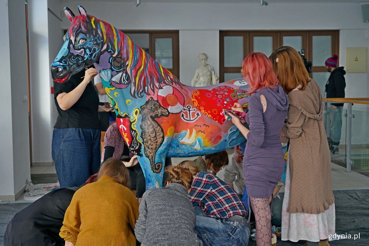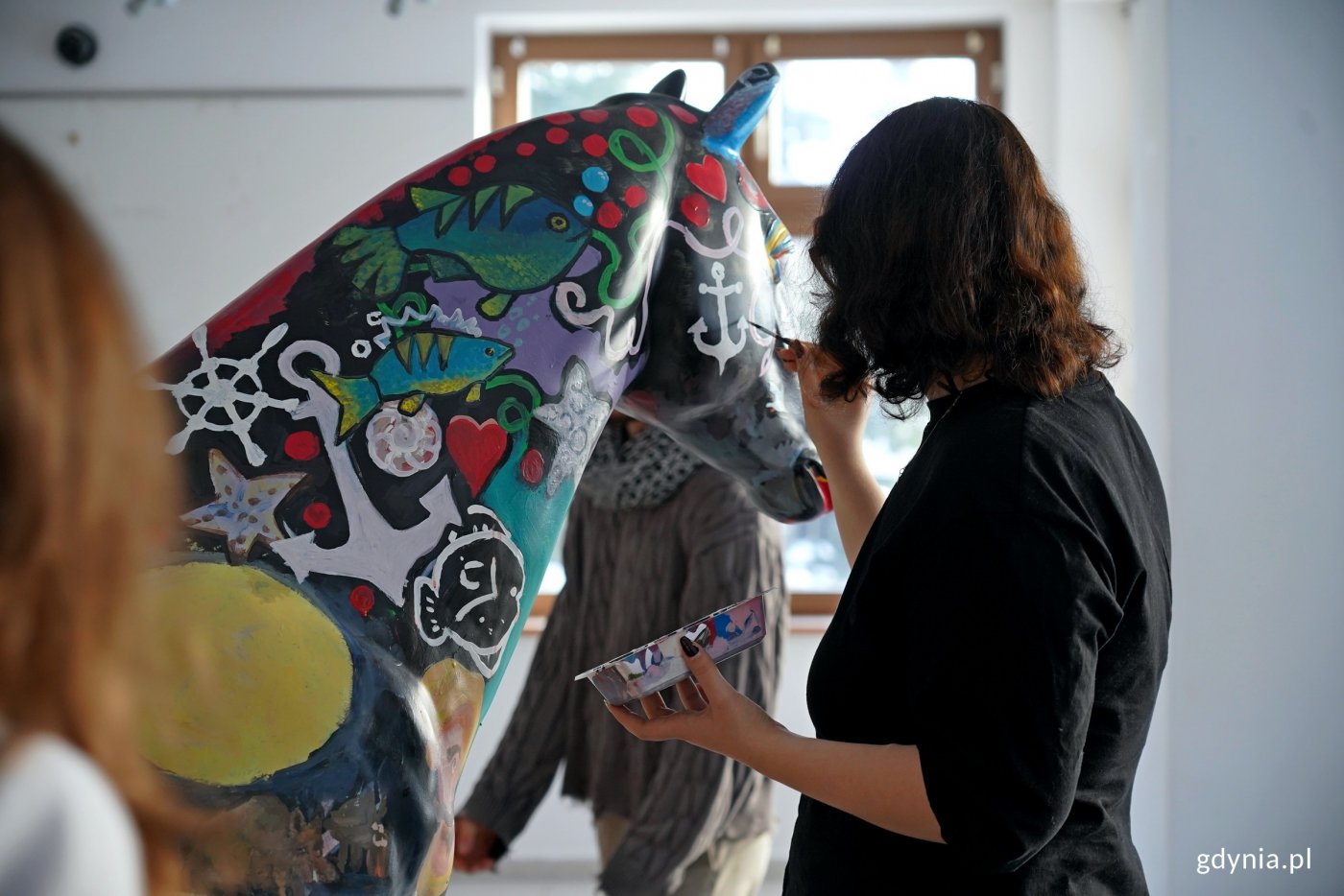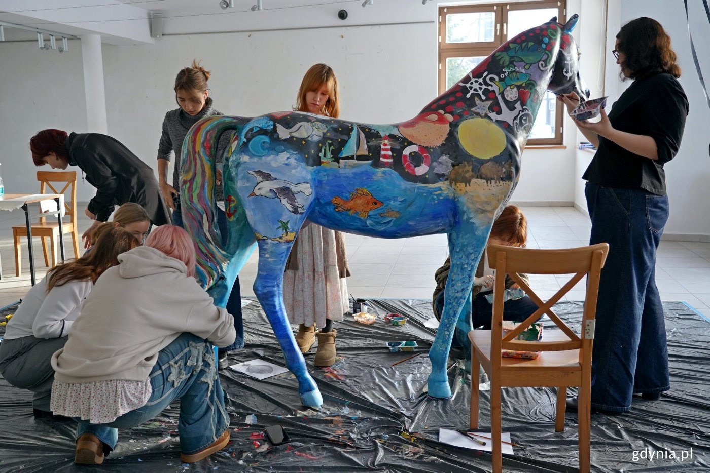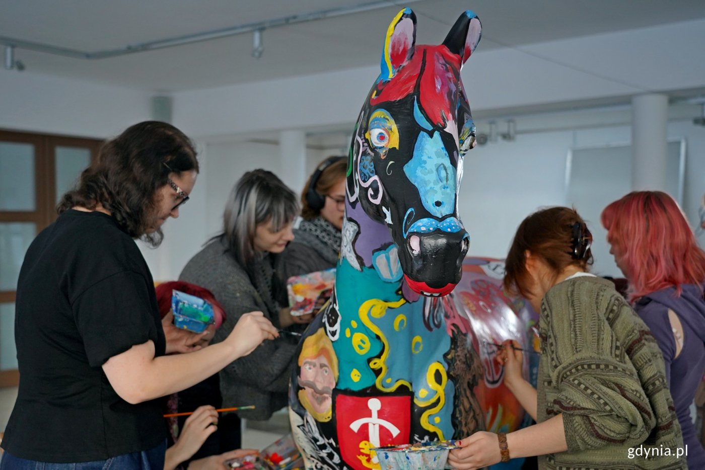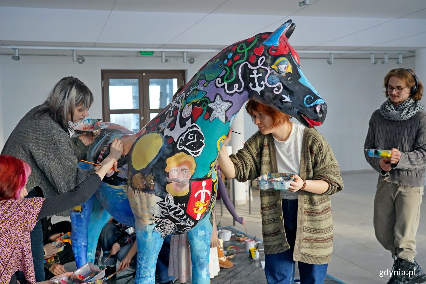 Chwycili za pędzle i przystąpili do dzieła. Uczniowie Państwowego Liceum Sztuk Plastycznych w Gdyni pomalowali konia, którego miasto przekaże na tegoroczną licytację w ramach Wielkiej Orkiestry Świątecznej Pomocy. Jest kolorowy i ma budzić radosne skojarzenia. Zdobią go gdyńskie oraz morskie akcenty. Nawiązuje on również do stulecia naszego miasta. Kiedy miasto kupiło teren z halą magazynową, gdzie gromadzone są zasoby niezbędne do zapewnienia bezpieczeństwa mieszkańcom Gdyni w sytuacjach kryzysowych, przy budynku znaleziono czarną rzeźbę konia naturalnej wielkości. Samorządowcy zastanawiali się, co z nią zrobić. Po dyskusjach zapadła decyzja, że wesprze ona szczytny cel. Trafi na licytację podczas tegorocznego, 34. finału Wielkiej Orkiestry Świątecznej Pomocy. A o to, żeby koń się wyróżniał, przyciągał uwagę i wyglądał gdyńsko, zadbali uczniowie i nauczyciele Państwowego Liceum Sztuk Plastycznych. Historia jest bardzo ciekawa. Weszliśmy w jego posiadanie całkiem przypadkiem. I zastanawiałam się, co można zrobić z plastikowym koniem naturalnej wielkości. Postanowiłam, że oddamy go na Wielką Orkiestrę Świątecznej Pomocy. Koń już jest prawie skończony. Ma wiele akcentów gdyńskich, m.in. herb Gdyni na piersi. Są dziki, motywy morskie, żaglówki, mewy, czyli wszystko, co kojarzy się z naszym miastem. Będzie można go licytować. Pieniądze zostaną przeznaczone na szczytny cel. I taki koń to unikat w skali całej Polski, może nawet Europy, tak że zachęcam do licytowania. Jestem pod ogromnym wrażeniem tego, jak się prezentuje. Widać ogromny talent i zaangażowanie nauczycieli oraz uczniów – mówi Aleksandra Kosiorek, prezydent Gdyni. Zdjęcia i montaż: Sławomir OkońPrace nad jego wizerunkiem trwają od dwóch tygodni i zbliżają się do końca. Dopracowywane są detale i poszczególne motywy. W ich tworzeniu brała udział również prezydent Gdyni. Koń przyjechał do nas dwa tygodnie temu, natomiast pierwsze wprawki malarskie pojawiły się już w poniedziałek. Stworzyła je klasa pod opieką pani Ewy Manuszewskiej. To była klasa pierwsza. W tej chwili właściwie kończymy, poprawiamy, nakładamy kolejne warstwy, po to, aby wszystko wyglądało bardzo efektownie i radośnie. Chodziło o to, żeby było to intensywne w kolorach, barwne, żeby nawiązywało też do logo Wielkiej Orkiestry Świątecznej Pomocy. Pojawia się powoli serduszko, pojawiają się kopytka, które też będą nosić elementy logo Wielkiej Orkiestry Świątecznej Pomocy – podkreśla Aleksandra Szwarc, wicedyrektor Państwowego Liceum Sztuk Plastycznych w Gdyni. Tworzenie tego artystycznego dzieła sprawia radość młodym artystom i daje im satysfakcje. Już tydzień temu poinformowano nas, że będziemy mieć okazję stworzyć takiego konia. I po prostu nie mogliśmy się doczekać. Od rana malujemy i myślę, że to całkiem dobra zabawa. Razem chcemy stworzyć dobry, duży projekt. Cieszymy się, że razem możemy zrobić coś dobrego dla WOŚP-u – mówi Grzegorz Leszka, uczeń klasy V Państwowego Liceum Sztuk Plastycznych w Gdyni. Uczniowie Państwowego Liceum Sztuk Plastycznych w Gdyni wraz z prezydent Gdyni Aleksandrą Kosiorek przy rzeźbie gdyńskiego konia (fot. Magdalena Czernek)Konia będzie można wylicytować na aukcji online sztabu „Gdynia dla Orkiestry”. Trwają również starania, aby zaprezentować go w sztabie głównym w Warszawie podczas 34. finału akcji, który odbędzie się 25 stycznia. Mamy wiele interesujących aukcji, ale ten przedmiot, ten koń to naprawdę coś wyjątkowego. Perełka dla ludzi, którzy chcieliby wesprzeć Wielką Orkiestrę Świątecznej Pomocy, bo jest niepowtarzalny. Myślę, że drugiego takiego konia już nigdy nikt nie znajdzie. Tak więc to jest naprawdę wyjątkowa rzecz, którą można wygrać. Myślę, że nie tylko mieszkańcy Gdyni, ale i cała Polska o niego powalczy. To coś, co każdy chciałby gdzieś u siebie ustawić, bo to praca bardzo wielu osób, które włożyło w to serce – podkreśla Szymon Słoniewski, koordynator wolontariuszy w sztabie „Gdynia dla Orkiestry”. Tegoroczny finał Wielkiej Orkiestry Świątecznej Pomocy odbędzie się pod hasłem „Zdrowe brzuszki naszych dzieci”. Zebrane środki zostaną przeznaczone na potrzeby gastroenterologii dziecięcej – diagnostyki i leczenia chorób przewodu pokarmowego u najmłodszych. Galeria zdjęć Pobierz galerię Uczniowie Państwowego Liceum Sztuk Plastycznych w Gdyni malujący rzeźbę konia, którą miasto przekaże na licytację WOŚP (fot. Magdalena Czernek) Pobierz zdjęcie Prezydent Gdyni Aleksandra Kosiorek malująca rzeźbę konia, którą miasto przekaże na licytację WOŚP (fot. Magdalena Czernek) Pobierz zdjęcie Uczennice Państwowego Liceum Sztuk Plastycznych w Gdyni malujące rzeźbę konia, którą miasto przekaże na licytację WOŚP (fot. Magdalena Czernek) Pobierz zdjęcie Motywy nawiązujące do morza i Gdyni namalowane na rzeźbie konia (fot. Magdalena Czernek) Pobierz zdjęcie Uczniowie Państwowego Liceum Sztuk Plastycznych w Gdyni malujący rzeźbę konia, którego miasto przekaże na licytację WOŚP (fot. Magdalena Czernek) Pobierz zdjęcie Prezydent Gdyni Aleksandra Kosiorek malująca rzeźbę konia, którą miasto przekaże na licytację WOŚP (fot. Magdalena Czernek) Pobierz zdjęcie Uczennica Państwowego Liceum Sztuk Plastycznych w Gdyni malujące rzeźbę konia, którą miasto przekaże na licytację WOŚP (fot. Magdalena Czernek) Pobierz zdjęcie Uczniowie Państwowego Liceum Sztuk Plastycznych w Gdyni malujący rzeźbę konia, którą miasto przekaże na licytację WOŚP (fot. Magdalena Czernek) Pobierz zdjęcie Uczniowie Państwowego Liceum Sztuk Plastycznych w Gdyni malujący rzeźbę konia, którą miasto przekaże na licytację WOŚP (fot. Magdalena Czernek) Pobierz zdjęcie Uczniowie Państwowego Liceum Sztuk Plastycznych w Gdyni malujący rzeźbę konia, k
