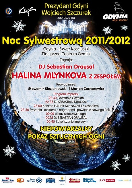 Tradycyjnie zapraszamy mieszkańców, jak i wszystkich przyjaciół Gdyni na miejskiego sylwestra pod chmurką – na placu przed Centrum Gemini. O odpowiedni nastrój zadbają: DJ SEBA – Sebastian Drausal oraz gwiazda wieczoru – Halina Mlynkova z zespołem. Przy ich muzyce wszyscy bawią się doskonale. A przecież o to chodzi! W programie liczne zabawy i konkursy, do wygrania m.in. rejsy do Karlskrony, miejskie kalendarze i gadżety. Nie lada atrakcją tuż po noworocznych życzeniach złożonych mieszkańcom przez prezydenta Gdyni będą wspaniałe fajerwerki, trwające ponad 15 minut, a realizowane przez mistrzów tej profesji. To znakomity pomysł na wspólną zabawę pod chmurką, gdy nastroje są już szampańskie...Program imprezy:- godz. 22.30 – powitanie gdynian;- godz. 22.35 – DJ SEBA;- godz. 23.00 – koncert Haliny Mlynkovej z zespołem;- godz. 23.50 – życzenia, konkursy z nagrodami i powitanie Nowego Roku;- godz. 00.00 – pokaz sztucznych ogni;- godz. 00.15 – DJ SEBA;- godz. 00.45 – zakończenie imprezy. Prowadzenie: Sławomir Siezieniewski i Marian Zacharewicz.Organizatorzy: Miasto Gdynia, Centrum Gemini, Agencja Avanti. W związku z gdyńskim sylwestrem nastąpią zmiany w dotychczasowej organizacji ruchu drogowego. W godz. 18.0 0- 1.20 zamknięta będzie al. Jana Pawła II oraz ul. Waszyngtona od skrzyżowania z ul. Pułaskiego do Skweru Kościuszki. W godz. 22.00 - 1.20 zamknięty zostanie dodatkowo Skwer Kościuszki na odcinku od ul. Borchardta do al. Jan Pawła II oraz wylot z ul. Armii Krajowej w ul. Borchardta Opublikowano: 30.12.2011 00:00 Autor: Michał Kowalski (2011)