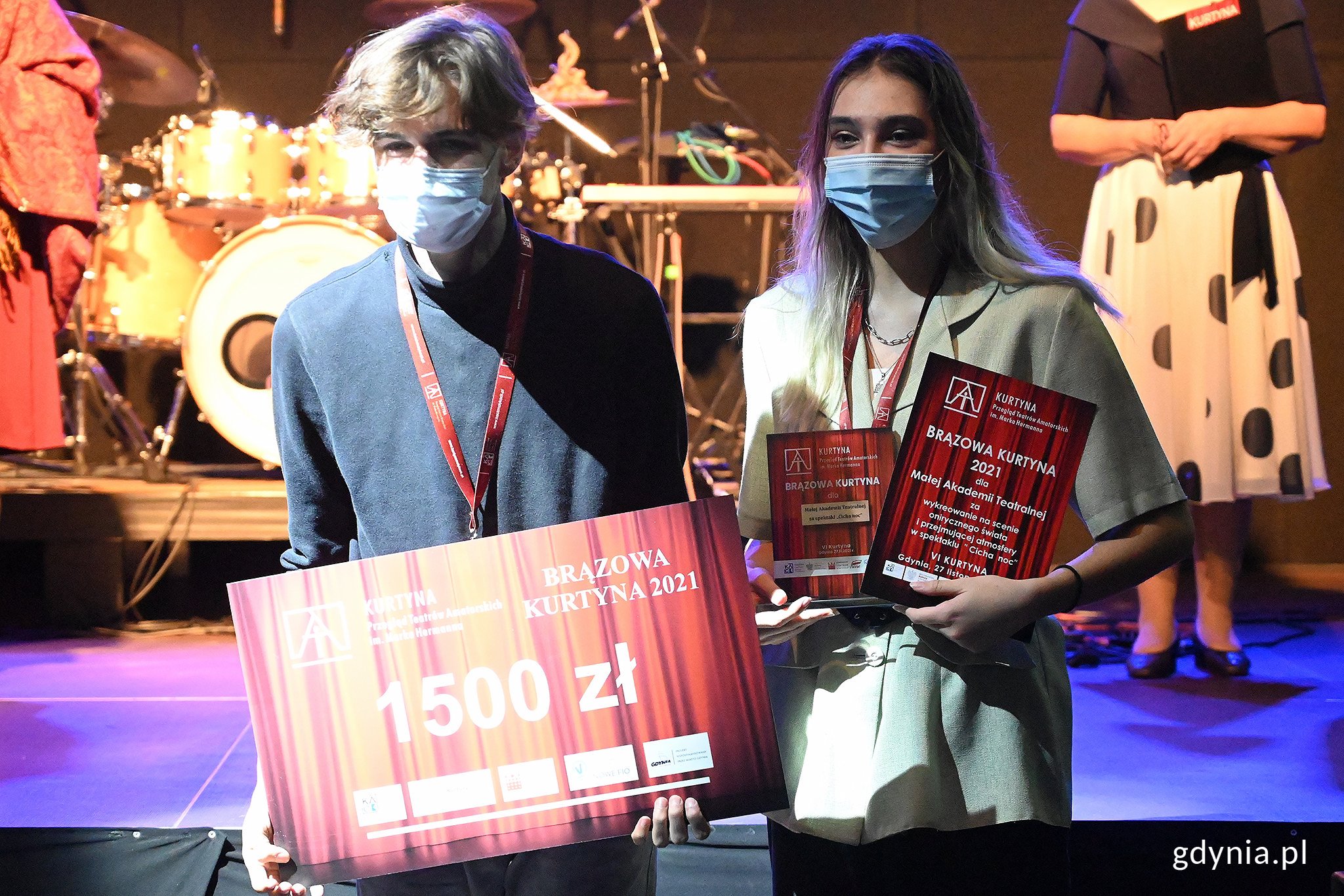 Sobota to siódmy dzień tygodnia, w którym Bóg odpoczywał po swym stwórczym dziele. To też siódmy dzień Przeglądu Teatrów Amatorskich „Kurtyna”, w którym rozdano nagrody 6. edycji Przeglądu, promującego ponadczasowe i uniwersalne ewangeliczne wartości. Przez sześć ostatnich dni dziesięć zróżnicowanych, amatorskich zespołów teatralnych z całego kraju, liczących łącznie 147 artystów, przedstawiało swoje spektakle, pobudzając do refleksji, stawiając pytania o sens życia, pokazując wybór pomiędzy dobrem a złem oraz relacje z Bogiem i drugim człowiekiem. Zaprezentowano 10 spektakli konkursowych oraz pozakonkursowy „Król wschodzącego słońca" w dniu otwarcia w wykonaniu gospodarzy, Grupy Artystycznej Nazaret. - Wśród artystów najliczniej reprezentowani są młodzi ludzie – licealiści i studenci, ale nie zabrakło grupy dziecięcej i kilku grup osób dorosłych oraz grup osób z niepełnosprawnością. Na scenie królowały w tym roku autorskie scenariusze oparte na baśniach, prozie, fragmentach biblijnych lub nawiązujące do prawdziwych postaci i własnych doświadczeń życiowych. "Kurtyna" obfitowała również w różnorodne formy przekazu – klasyczne inscenizacje teatralne, spektakle ruchu scenicznego i gestu, te z bogatą scenografią i rekwizytami i takie, gdzie światło i ciemność towarzyszyło czerni i bieli bez rekwizytów. Ponadto w związku z nieoczekiwaną nieobecnością dwóch finalistów odbyły się godzinne warsztaty muzyczne i aktorskie adresowane do widzów – podsumowuje Przegląd Jarosław Szydłak, prezes Stowarzyszenia KACK. Katarzyna Gruszecka-Spychała, wiceprezydent Gdyni ds. gospodarki, jurorka "Kurtyny" i Jarosław Szydłak, prezes Stowarzyszenia KACK, organizator "Kurtyny". Fot. Michał Puszczewicz Po sześciu dniach konkursowych zmagań na deskach teatru zaaranżowanego w kościele pw. Chrystusa Króla w Małym Kacku, przyszedł czas na Galę Finałową. Siódmego dnia Przeglądu odbyły się koncert zespołu Siewcy Lednicy oraz uroczyste rozdanie nagród 6. "Kurtyny". Koncert zespołu Siewcy Lednicy. Fot. Michał Puszczewicz O tym, do kogo trafiła Złota Kurtyna i pozostałe nagrody zdecydowało Jury w składzie: Katarzyna Gruszecka-Spychała – wiceprezydent Gdyni ds. gospodarki; Maja Garmulewicz – reżyserka oraz scenarzystka; Weronika Łucyk – pedagog teatru, animatorka kultury, specjalistka ds. edukacji Teatru Wybrzeże; Katarzyna Bierecka – śpiewaczka operowa, dyrektor artystyczny Stowarzyszenia Kack; Anna Halasz – powieściopisarka, polonistka, przewodnicząca Jury; Artur Guza – aktor scen muzycznych, wokalista, kierownik muzyczny, kompozytor, aranżer; Marek Woźniak – amator sztuki oraz teatrów, radca prawny. Zwycięzcami 6. Przeglądu Teatrów Amatorskich im. Marka Hermanna „Kurtyna” i laureatami Złotej Kurtyny został Teatr Reduta Śląska z Chorzowa, który przedstawił spektakl „Przycisk”. Laureaci Złotej Kurtyny z Teatru Reduta Śląska. Fot. Michał Puszczewicz - Jednogłośnie nagrodziliśmy spektakl, który bez przesady można ocenić jako wybitny. Nagrodę przyznaliśmy za niezwykłą kompletność dzieła: spektakl cechuje się świetnym scenariuszem, wybitnymi i bardzo równymi kreacjami aktorskimi oraz doskonałą reżyserią. W dodatku porusza palące kwestie i nie daje gotowych odpowiedzi na trudne pytania, lecz zmusza nas do zastanowienia. Jestem pewna, że gdyby trafił na deski któregoś z profesjonalnych teatrów, cieszyłby się dużym powodzeniem u publiczności. Przyznaliśmy także nagrodę specjalna za muzykę dla grupy, która z sukcesem porwała się na przygotowanie musicalu, łącznie z opracowaniem utworów oraz ich wykonaniem instrumentalnym na żywo. W mieście Teatru Muzycznego nie sposób było nie docenić takiego ogromu pracy – mówi Katarzyna Gruszecka-Spychała, wiceprezydent Gdyni ds. gospodarki i jurorka „Kurtyny”. - Drodzy przyjaciele, drodzy gospodarze, z całego serca w imieniu tej nieznośnej grupy dziękuję za gościnność, za serdeczność, za atmosferę, którą odczuwaliśmy na każdym kroku, w każdym miejscu. Było nam z wami cudownie. Bardzo się cieszymy, że wreszcie, po raz pierwszy, mogliśmy zaistnieć w Gdyni. Powodem tej wielkiej radości jest fakt, że stworzyliście nam Państwo okazję do przeżycia historycznej chwili. Reduta Śląska działa 89 lat, a jednym z pierwszych reżyserów Reduty Śląskiej była Danuta Baduszkowa. I podczas naszej obecności tutaj, po raz pierwszy przeżyliśmy historyczny moment, że mogliśmy zwiedzić, poznać wielkie dzieło Pani Danuty. W 1955 roku Danuta Baduszkowa reżyserowała nam spektakl "Henryk VI na łowach", który zdobył wszystkie możliwe nagrody na wszystkich przeglądach i festiwalach. A dzisiaj naszą obecnością chcieliśmy Państwu i Wam Przyjaciele udowodnić, o czym wszyscy wiemy, tylko może nie zawsze pamiętamy, że teatr to nie tylko miejsce zabawy, ale to miejsce refleksji, zadumy i bardzo często poruszanie problemów, o których nie wszyscy mają odwagę mówić. Serdecznie dziękuję! - mówiła odbierając nagrodę Barbara Michalik, prezes Teatru Reduta Śląska. Laureaci Brązowej Kurtyny z Małej Akademii Teatralnej. Fot. Michał Puszczewicz Pozostałe nagrody przypadły: Brązowa Kurtyna dla Małej Akademii Teatralnej z Pruszcza Gdańskiego za spektakl „Cicha noc”, Srebrna Kurtyna dla Teatru Ephata z Gdańska za spektakl „Law story”, Kurtyna Specjalna dla Grupy Teatralnej Dzikie Koty z Kłodzka za spektakl „Miłość zmartwychwstała”, Kurtyna Dla Najlepszej Aktorki dla Wspólnoty Aktorek Grupy Teatralnej Czarne Owieczki ze wsi Pniewite, Kurtyna Dla Najlepszego Aktora dla odtwórcy głównej roli męskiej w spektaklu „Cicha noc” Małej Akademii Teatralnej z Gdańska, Kurtyna Medialna dla Grupy Teatralnej Dzikie Koty z Kłodzka za spektakl „Miłość zmartwychwstała”, Kurtyna Publiczności dla Teatralnej Szóstki z Rumi