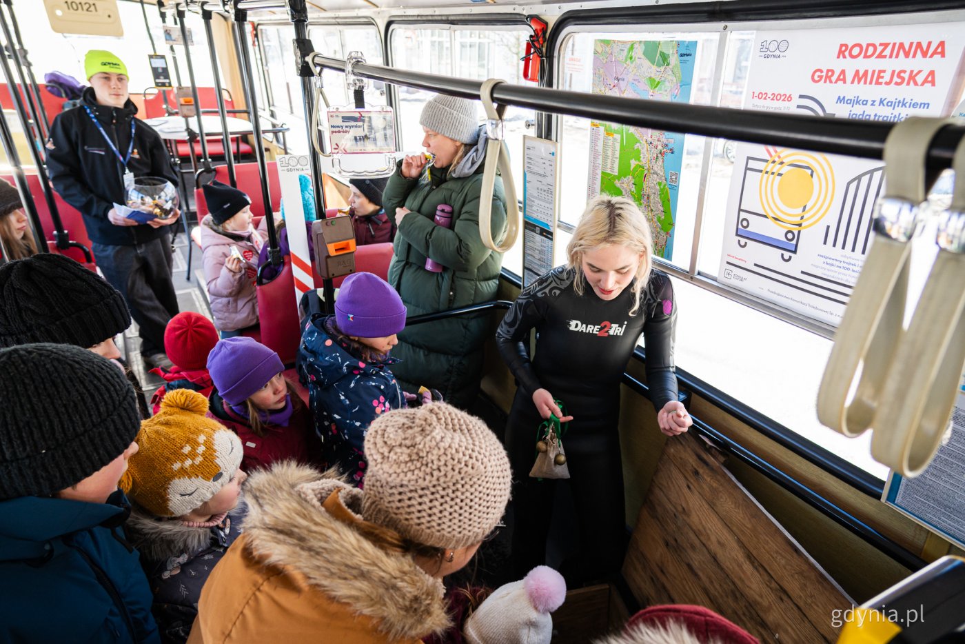 Czy może być bardziej gdyński środek transportu, niż… „trajtek”? To właśnie trolejbusy są podstawą bajki „Majka z Kajtkiem jadą trajtkiem”, która już 7 lutego zaliczy swoją premierę w Konsulacie Kultury. Zanim jednak poznamy całą opowieść, rodziny ruszyły na ulice miasta, żeby w specjalnej grze miejskiej poznać tło tej nawiązującej do 100-lecia Gdyni historii. Od trajtka do trajtka, czyli gra w terenie Odkryj tajemnice Gdyni z Majką i Kajtkiem Zobacz spektakl w Konsulacie Kultury To odsłonięcie historii związanych z dziejami miasta, ale w wersji dla najmłodszych. Dzieci przy okazji bajki usłyszą o tajemniczych zapachach dostępnych tylko w Baltonie, tajemnicach głębin Bałtyku czy poznają kaszubskie wątki z początków wsi Gdynia.W niedzielę (1 lutego) w klimat zbliżającej się premiery bajki „Majka z Kajtkiem jadą trajtkiem” Gdynian wprowadziła specjalna gra miejska z trolejbusami w roli głównej. W kilku punktach miasta stanęły zabytkowe pojazdy, a w każdym z nich można było wcielić się w tytułowych bohaterów przedstawienia, którzy odkrywają gdyńskie tajemnice. Zdjęcia i montaż: Sławomir Okoń Od trajtka do trajtka, czyli gra w terenie Gra miejska to forma, która przede wszystkim angażuje całe rodziny do wspólnej zabawy i aktywności na świeżym powietrzu. Pomimo mroźnej aury, Konsulat Kultury już od samego początku wypełnił się chętnymi, którzy chcieli poznać część fabuły teatralnej bajki.Rejestracja uczestników gry w Konsulacie Kultury. Po lewej widoczna latarnia, którą musieli zapalić na nowo wszyscy chętni (fot. Kamil Złoch)Przypomnijmy, że reżyserowany przez Agnieszkę Płoszajską spektakl dla dzieci po raz pierwszy zostanie wystawiony już 7 lutego (także w Konsulacie Kultury). Będzie jednym z wydarzeń związanych z obchodami 100-lecia Gdyni. Zapowiedzią tej premiery jest właśnie dzisiejsza gra miejska, która nawiązuje do dziejów Gdyni, do historii Gdyni i która, jak można zobaczyć, zaangażowała całą masę rodzin. Konsulat Kultury jest operatorem programu Gdynia Rodzinna i dzisiejsza gra jest elementem właśnie tego programu. Działamy na rzecz rodzin, ale także na rzecz kultury, propagujemy historię i tożsamość naszego miasta – mówi Katarzyna Korzeniewska, dyrektorka Gdyńskiego Centrum Kultury. Na uczestników niedzielnej gry czekały łącznie cztery punkty do odwiedzenia na terenie gdyńskiego Śródmieścia, a w każdym z nich, gdzie stanęły zabytkowe trolejbusy – animatorzy i specjalne zadania do wykonania. Po zebraniu czterech okruchów bursztynu za każde z nich, uczestnicy wspólnie przywrócili światło w latarni, która czekała w Konsulacie Kultury. Nasi animatorzy nawiązują do postaci, ale można też spotkać osoby związane z samym przedstawieniem. Przygotowaliśmy krótkie łamigłówki i fajne, integracyjne zadania, trochę sensoryczne, trochę zręcznościowe, bo grę kierujemy właśnie do rodziców z małymi dziećmi, więc zadania są proste i sympatyczne – wyjaśnia Piotr Milewski z Sirius Game Studio, autor gry miejskiej. Na potrzeby gry skorzystano z pojazdów, które okazjonalnie pojawiają się na ulicach Gdyni i są już dobrze znane miłośnikom komunikacji zbiorowej. To Saurer 4TIILM z 1957 roku, Skoda 9Tr z 1975 roku, ZiU 9 z 1984 roku i najmłodszy Jelcz Pr110E z 1994 roku. Jeden z pojazdów, który był elementem gry (fot. Kamil Złoch)Przemieszczanie się między punktami gry ułatwił też współczesny trolejbus marki Solaris z Przedsiębiorstwa Komunikacji Trolejbusowej w Gdyni, który rozwoził uczestników między kolejnymi zadaniami. Odkryj tajemnice Gdyni z Majką i Kajtkiem Czego dokładnie dotyczy fabuła tytułowej bajki? To muzyczne przedstawienie dla najmłodszych, które jest pełne gdyńskich wątków i nawiązań do historii miasta.Tytułowi bohaterowie, Majka i Kajtek, znają się od dawna. Majka, przebywająca z wizytą w Gdyni, wyrusza w drogę powrotną do domu, a Kajtek postanawia odprowadzić ją na dworzec. Nie wiedzą jednak, że ich trolejbus pojedzie niespodziewanym objazdem. Powodem jest tajemnicze „Światełko” – nieznana, obdarzona niezwykłymi mocami istota, a chcąc znaleźć dla niej miejsce, dzieci wyruszają w magiczną podróż przez historię Gdyni.W czasie niezwykłej trasy poznają ikoniczne postacie z przeszłości miasta, odkrywają sekrety okolic, w tym legendę historycznej latarni na Oksywiu, i przekonują się, że odwaga i dobro potrafią rozświetlić nawet najbardziej nieoczekiwane przygody.Wszystko to przy akompaniamencie oryginalnej muzyki oraz dynamicznej, pełnej fantazji oprawy scenicznej. W obsadzie teatralnej bajki znaleźli się m.in. Aleksandra Rowicka, Mateusz Tarkowski, Angele Villanueva Jara, Kinga Olszańska i Filip Bieliński. Autorem tekstu jest Emil Płoszajski, reżyserką – wspomniana już Agnieszka Płoszajska. Zobacz spektakl w Konsulacie Kultury Kiedy będzie można obejrzeć bajkę „Majka z Kajtkiem jadą trajtkiem” na deskach gdyńskiego Konsulatu Kultury? Pierwsze terminy już w tygodniu jubileuszowych obchodów: 7, 8, 9 i 10 lutego. Wstęp biletowany, a bilety są dostępne m.in. na stronie internetowej Gdyńskiego Centrum Kultury.To nie koniec – już wiadomo, że teatralną bajkę związaną ze stuleciem miasta będzie można też zobaczyć w kolejnych miesiącach: 15, 16 i 17 marca, 31 maja, 1 i 2 oraz 22 i 23 czerwca. Galeria zdjęć Pobierz galerię Uczestnicy gry miejskiej opartej na spektaklu „Majka z Kajtkiem jadą trajtkiem” (fot. Kamil Złoch) Pobierz zdjęcie Gra miejska oparta na spektaklu „Majka z Kajtkiem jadą trajtkiem” (fot. Kamil Złoch) Pobierz zdjęcie Gra miejska oparta na spektaklu „Majka z Kajtkiem jadą trajtkiem” (fot. Kamil Złoch) Pobierz zdjęcie Uczestnicy gry miejskiej opartej na spektaklu „Majka z Kajtkiem jadą trajtkiem” (fot. Kamil Złoch) Pobierz zdjęcie Uczestnicy gry miejskiej oparte