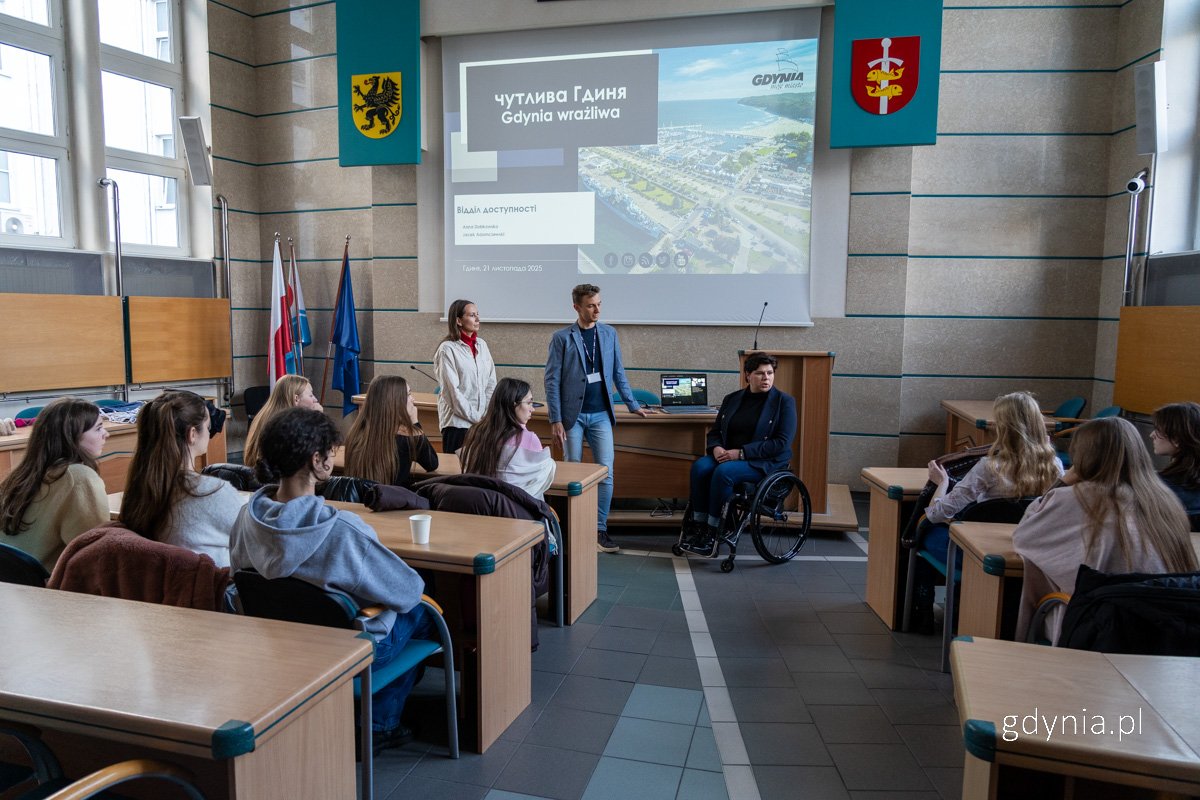 Grupa studentek ukraińskich uczelni gości w listopadzie na Pomorzu w ramach programu Study Tours to Poland. Wizyta ma na celu zapoznanie młodych liderek z najważniejszymi elementami współczesnego życia społecznego, politycznego i gospodarczego w Polsce. W piątek, 21 listopada studentki wzięły udział w spotkaniu z pracownikami Wydziału Dostępności Urzędu Miasta Gdyni, aby lepiej poznać nasze rozwiązania w zakresie aktywnego i niezależnego życia osób z niepełnosprawnościami. Prezentację na temat gdyńskich rozwiązań w zakresie niezależności i równości dla osób z niepełnosprawnościami, ich równego traktowania oraz włączenia społecznego, przygotowali Anna Dobkowska oraz Jacek Adamczewski z Wydziału Dostępności Urzędu Miasta. Gdynia była jednym z pierwszych miast w Polsce, który postawiły na dostępność i równość nie tylko dla osób z niepełnosprawnościami, ale również wszystkich mieszkańców ze szczególnymi potrzebami – podkreśla Anna Dobkowska. – Niezmiernie nas cieszy, że nasze rozwiązania budzą zainteresowanie nie tylko w Polsce, ale również poza granicami. Często i chętnie dzielimy się naszymi dobrymi praktykami: w tym wypadku ze studentami, ale niedawno gościliśmy również wykładowców uczelni wyższych zainteresowanych „Gdynią bez barier". Listopadową wizytę studyjną dla grupy 15 osób studiujących w Ukrainie w ramach programu Study Tours to Poland zorganizowała Fundacja Instytut Równowagi Społeczno-Ekonomicznej. Uczestniczki reprezentują różne uczelnie i kierunki. Pochodzą m.in. z Zaporoża, Lwowa, Kijowa, Łucka i Kropywnyckiego, a ich wspólnym mianownikiem jest aktywność społeczna, zaangażowanie akademickie i bardzo dobre wyniki w nauce – mówi Katarzyna Blasinska, koodynatorka wizyty w ramach Study Tours to Poland. – Wizyta ma na celu zapoznanie młodych liderek z najważniejszymi elementami współczesnego życia społecznego, politycznego i gospodarczego w Polsce. Program obejmuje spotkania z przedstawicielami i przedstawicielkami instytucji publicznych, organizacji społecznych i biznesu, prezentując różne modele działania i współpracy w demokratycznym państwie prawa. Wymiana doświadczeń ma inspirować do refleksji nad możliwymi kierunkami rozwoju społeczeństwa obywatelskiego i lokalnych wspólnot, a w przyszłości wspierać proces odbudowy Ukrainy. Studentki spotkały się już z przedstawicielami Urzędu Marszałkowskiego Województwa Pomorskiego, radnymi i organizacjami społecznymi z Sopotu oraz z młodzieżą. Bardzo ważna była dla nich kwestia dostępności. Z powodu wojny dostępność infrastrukturalna, ale także cyfrowa stają się pilnymi kwestiami rozwoju społecznego na Ukrainie.Niezwykle ciekawe wystąpienie gdyńskich urzędników wzbudziło duże zainteresowanie i stało się przyczynkiem do wielu pytań ze strony młodych gości.Program Study Tours to Poland jest programem wspieranym/koordynowanym w ramach inicjatyw Polsko-Amerykańskiej Fundacji Wolności i organizowanym przez różne polskie NGO. Galeria zdjęć Pobierz galerię Prezentacja Wydziału Dostępności Urzędu Miasta Gdyni, na pierwszym planie Anna Dobkowska oraz Jacek Adamczewski z Wydziału Dostępności Urzędu Miasta (fot. Michał Sałata) Pobierz zdjęcie Prezentacja Wydziału Dostępności, na pierwszym planie Anna Dobkowska oraz Jacek Adamczewski z Wydziału Dostępności Urzędu Miasta (fot. Michał Sałata) Pobierz zdjęcie Studentki z Ukrainy w Urzędzie Miasta (fot. Michał Sałata) Pobierz zdjęcie Studentki z Ukrainy w Urzędzie Miasta (fot. Michał Sałata) Pobierz zdjęcie Studentki z Ukrainy w Urzędzie Miasta (fot. Michał Sałata) Pobierz zdjęcie Warunki pobierania Wszelkie prawa do zdjęć lub grafik prezentowanych w ramach portalu, należą do Prowadzącego portal lub do podmiotów z nim współpracujących i podlegają ochronie prawnej. Prowadzący portal zezwala na kopiowanie i przedstawianie utworów jedynie w celach niekomercyjnych oraz pod warunkiem zachowania go w oryginalnej postaci i zachowaniem kontekstu tematu, do którego zostało wykorzystaneprzez redakcję gdynia.pl. Opublikowane materiały powinny zawsze zawierać źródło, czyli adres strony www.gdynia.pl. Na publikowanie utworów w innych celach wymagana jest zgoda właściciela strony czyli Prowadzącego portal. Opublikowano: 24.11.2025 11:45 Autor: Aneta Marczak (aneta.marczak@gdynia.pl) Zmodyfikowano: 24.11.2025 11:46 Zmodyfikował: Aleksandra Dylejko