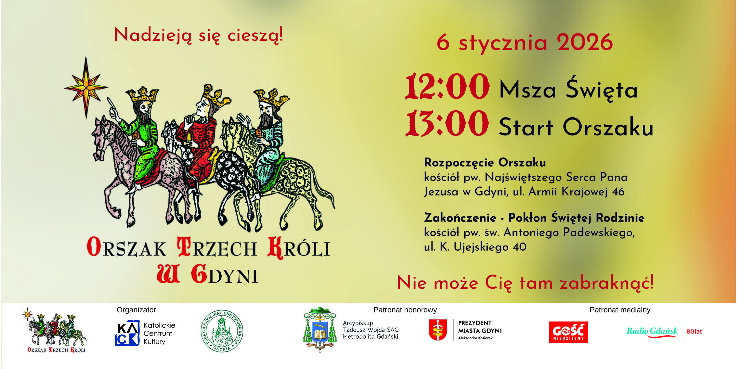 „Nadzieją się cieszą!” to hasło tegorocznego Orszaku Trzech Króli. Jak co roku, 6 stycznia kolorowy przemarsz organizuje Stowarzyszenia Katolickie Centrum Kultury w Gdyni i zaprasza do udziału wszystkich, którzy chcą razem świętować. Gdyński Orszak Trzech Króli wyruszy we wtorek, 6 stycznia o godz. 13:00 po mszy świętej, która o godzinie 12:00 rozpocznie się w kościele pw. Najświętszego Serca Pana Jezusa (ul. Armii Krajowej 46). Przejdzie ulicą Świętojańską do Klasztoru Ojców Franciszkanów (ul. Ujejskiego 40) na Wzgórzu Świętego Maksymiliana. Zapraszamy do udziału w Gdyńskim Orszaku Trzech Króli 6 stycznia – zachęca Jarosław Szydłak, prezes zarządu Stowarzyszenia Katolickie Centrum Kultury w Gdyni. – Niech hasło tegorocznego Orszaku Trzech Króli: „Nadzieją się cieszą!” stanie się bliskie wszystkim uczestnikom wydarzenia. Orszak jak co roku połączy wiele gdyńskich środowisk, szkół i instytucji. Partnerami wydarzenia są gdyńskie parafie Chrystusa Króla i Najświętszego Serca Pana Jezusa, Klasztor Ojców Franciszkanów, gdyńskie szkoły: Zespół Szkół Jezuickich, Zespół Szkół Katolickich oraz Katolicka Szkoła Podstawowa im. św. Rodziny, Teatr Miejski w Gdyni, Pomorski Okręg ZHR, Radio Kaszebe oraz Hospicjum św. Wawrzyńca. Poszczególne sceny Orszaku będą odgrywane przez kilka zespołów artystycznych - zaś ostatnim punktem będzie pokłon Trzech Króli Świętej Rodzinie i wspólne kolędowanie przy Betlejemskiej Szopce u Ojców Franciszkanów.Orszakowi towarzyszyć będzie zbiórka datków na rzecz gdyńskich hospicjów. Wydarzenie objęli patronatem honorowym Aleksandra Kosiorek, prezydent Gdyni oraz ksiądz arcybiskup Tadeusz Wojda SAC - Metropolita Gdański. Patronat medialny nad wydarzeniem objęli Radio Gdańsk oraz Gość Niedzielny.W związku z wydarzeniami, będą występować utrudnienia w ruchu, o których można przeczytać tutaj. Opublikowano: 02.01.2026 09:00 Autor: Aneta Marczak (aneta.marczak@gdynia.pl) Zmodyfikowano: 02.01.2026 16:02 Zmodyfikował: Jakub Winiewski