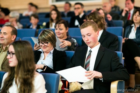 24 czerwca 2015 r., czyli dwa dni przed zakończeniem roku szkolnego w Szkole Muzycznej w Gdyni odbyła się uroczystość uhonorowania najlepszych gdyńskich gimnazjalistów, którzy w swoich szkołach uzyskali najwyższy wynik z egzaminu gimnazjalnego. Gdyńscy gimnazjaliści należą do wojewódzkiej i krajowej czołówki. Ich rezultaty na egzaminach są wyższe od średnich w woj. pomorskim i całym kraju. "Bardzo mocno trzymamy kciuki byście kolejne etapy edukacji przechodzili z takimi sami sukcesami, z takim samym uśmiechem i radością" - gratulował uczniom prezydent Gdyni Wojciech Szczurek. Galę - jak co roku - uświetnił występ uczniów Gdyńskiej Szkoły Muzycznej I i II stopnia. Najlepsi absolwenci z każdego gdyńskiego gimnazjum w roku szkolnym 2014/2015:Piotr Wołodko, Gimnazjum nr 1Bogusława Badziąg, Gimnazjum nr 2Sebastian Włodarczyk, Gimnazjum nr 3Paulina Kowalczyk, Gimnazjum nr 4Wiktoria Zielińska, Gimnazjum nr 5Klara Dargacz, Gimnazjum nr 7Cezary Zaremba, Gimnazjum nr 8Jędrzej Pakólski, Gimnazjum nr 9Konrad Piotrowski, Gimnazjum nr 10Weronika Miazek, Gimnazjum nr 11Magdalena Engler, Gimnazjum nr 12Martyna Moroz, Gimnazjum nr 13Julia Marzec, Gimnazjum nr 14Gabriela Pawełkiewicz, Gimnazjum nr 15Piotr Gardocki, Gimnazjum nr 16Maksymilian Chmielewski, Gimnazjum nr 17Karol Baryła, Gimnazjum nr 18Michał Lewandowski, Gimnazjum nr 19Monika Myśliwy, Gimnazjum nr 20Marianna Kostka, Gimnazjum nr 23Zofia Jankowska, Gimnazjum nr 24Kacper Walentynowicz, Gimnazjum nr 24Natalia Stachowicz, Gimnazjum Ogólnokształcącej Szkoły Sztuk PięknychAgata Rutkowska, Gimnazjum JezuitówEdyta Wiśniewska-Karakiewicz, Prywatne Gimnazjum LIBERMałgorzata Grala, Pierwsze Społeczne Gimnazjum Marta Sochacka, Gimnazjum KatolickiePiotr Kaiser, Gimnazjum Gdyńskiej Szkoły Społecznejfot. Karol Stańczak Opublikowano: 25.06.2015 00:00 Autor: Michał Kowalski (2011)