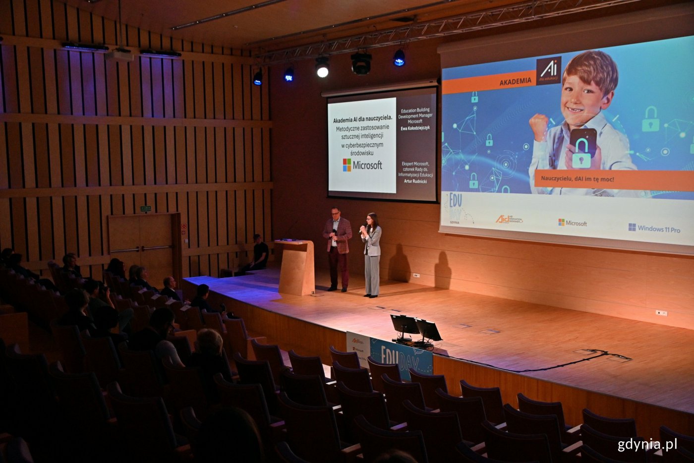 Jak ważne są innowacje i nowoczesne technologie w edukacji? W jaki sposób sztuczna inteligencja wpływa na podniesienie efektywności nauczania? Między innymi o tym rozmawiali uczestnicy tegorocznej odsłony konferencji Edu Day Gdynia. Uczestnicy, a wśród nich nauczyciele, dyrektorzy szkół oraz wszystkie osoby związane z oświatą i edukacją, mogli podczas wydarzenia rozwinąć swoje kompetencje cyfrowe i miękkie oraz wymienić doświadczenia. Konferencja odbyła się 13 grudnia w Pomorskim Parku Naukowo-Technologicznym Gdynia. Wykład inauguracyjny wygłosiła wiceprezydentka Oktawia Gorzeńska. Edu Day Gdynia to wydarzenie, podczas którego można się zainspirować oraz wymienić doświadczenia, a także rozwinąć swoje kompetencje cyfrowe i zdobyć nową wiedzę. W piątek, 13 grudnia w Pomorskim Parku Naukowo-Technologicznym okazję do tego mieli nauczyciele, dyrektorzy szkół i osoby związane z oświatą oraz edukacją. Konferencję po raz trzeci zorganizował Zespół Szkół Ogólnokształcących nr 8 we współpracy z firmami AB Innovation Designer oraz Microsoft Polska.Eksperci zwracali uwagę na to, jak ważna jest umiejętność korzystania z nowych technologii w edukacji. Tegoroczna edycja skupiła się również na: cyberbezpieczeństwie i higienie cyfrowej, wykorzystaniu AI w edukacji, podniesieniu efektów nauczania matematyki z pomocą sztucznej inteligencji oraz zarządzaniu szkołą i nadzorze pedagogicznym z wykorzystaniem nowoczesnych narzędzi. Edu Day to przede wszystkim możliwość rozwijania umiejętności cyfrowych i tych miękkich. Mogliśmy wysłuchać prelekcji, które miały na celu wsparcie dyrektorów i nauczycieli w zakresie np. sztucznej inteligencji – mówi Joanna Szymańska, wicedyrektor Zespołu Szkół Ogólnokształcących nr 8 w Gdyni. Konferencję oficjalnie otworzył Witold Chudyszewicz, dyrektor Zespołu Szkół Ogólnokształcących nr 8 w Gdyni. Spotykamy się tutaj jako pasjonaci edukacji. Wiemy, że świat technologii cały czas prze do przodu. Nasi uczniowie wyprzedzają nas zawsze od krok. Dlatego my, jako edukatorzy, dyrektorzy, nauczyciele, musimy podążać w tym kierunku, starać się nadążać za trendami. Jednak w tematy, które dzisiaj poruszymy, mocno wpisują się kwestie polityki oświatowej, bezpieczeństwa i sztucznej inteligencji. Dziękuję, że Państwo tutaj przybyli. Mam nadzieję, że z tej konferencji każdy wyniesie choć jedną pozytywną rzecz – powiedział dyrektor Chudyszewicz. Następnie wykład inauguracyjny wygłosiła wiceprezydentka Gdyni Oktawia Gorzeńska, która skupiła się na temacie innowacji w edukacji. Bardzo się cieszę, że temat kompetencji cyfrowych jest obecny w naszym mieście. Gdyńska edukacja od lat współpracuje między innymi z firmą Microsoft. Kilka lat temu miałam okazję budować pierwszą w tej części Europy flagową szkołę Microsoftu. Wiem, jak ważne jest wsparcie biznesu i tego środowiska, które na co dzień wspiera placówki oświatowe, żeby świat nam nie uciekł, żebyśmy byli w stanie rozwijać kompetencje cyfrowe. Pomyślałam sobie, że do tego świata technologii wniosę aspekt innowacji, ale taki bardzo humanistyczny. Chodzi o to, żebyśmy byli gotowi, mieli odwagę do tego, aby zmieniać sposoby pracy z uczniami, a z drugiej strony tworzyć warunki do tego, żeby ludzie chcieli próbować, testować, bo wiemy dzisiaj bardzo dobrze, że edukacja powinna się zmieniać – podkreśliła wiceprezydentka Gorzeńska. Nie zabrakło eksperckich prelekcji ani warsztatów. Pokażemy m.in. łączenie z naszą szkołą. Będą tam prowadzone zajęcia z wykorzystaniem sprzętu sztucznej inteligencji. Więc myślę, że jest to nie lada gratka dla wszystkich, którzy chcą zacząć wykonywać taką pracę w szkole. Ponadto podczas popołudniowych sesji warsztatowych, jako nauczycielki z Zespołu Szkół nr 8 w Gdyni, będziemy m.in. opowiadać o tym, jak pracujemy w szkole i zachęcać innych, aby podążali tą drogą – zaznacza Dorota Gorzejewska, wicedyrektor Zespołu Szkół nr 8 w Gdyni. W programie znalazły się m.in. Akademia AI czy studium dobrych praktyk – Laboratorium AI. Nie zabrakło również wystąpień na temat dyrektorów w erze AI, akceleratorów uczenia się Microsoftu i rozwijaniu kompetencji matematycznych w oparciu o AI Microsoft.Od lewej: Artur Rudnicki, ekspert Microsoftu i członek Rady ds. Informatyzacji i Edukacji oraz Ewa Kołodziejczyk, education building development manager Microsoft podczas Edu Day Gdynia 2024 (fot. Magdalena Czernek)Wydarzenie wsparli partnerzy technologiczni: Asus, Dell, HP, Lenovo, MAC Technologie. Konferencję objęli patronatem: marszałek województwa pomorskiego, pomorski kurator oświaty i prezydent Gdyni. Galeria zdjęć Pobierz galerię Prowadzące konferencję Edu Day Gdynia 2024 podczas oficjalnego otwarcia wydarzenia (fot. Magdalena Czernek) Pobierz zdjęcie Uczestnicy konferencji Edu Day Gdynia 2024 w sali konferencyjnej Pomorskiego Parku Naukowo-Technologicznego (fot. Magdalena Czernek) Pobierz zdjęcie Witold Chudyszewicz, dyrektor Zespołu Szkół Ogólnokształcących nr 8 w Gdyni, podczas otwarcia konferencji Edu Day Gdynia 2024 (fot. Magdalena Czernek) Pobierz zdjęcie Uczestnicy konferencji Edu Day Gdynia 2024 w sali konferencyjnej Pomorskiego Parku Naukowo-Technologicznego. Wśród nich m.in. Iwona Tanewska - naczelnik Wydziału Edukacji Urzędu Miasta Gdyni oraz Małgorzata Chudzińska - miejski rzecznik praw ucznia (fot. Magdalena Czernek) Pobierz zdjęcie Jerzy Wiśniewski - dyrektor Wydziału Strategii i Nadzoru Pedagogicznego Kuratorium Oświaty w Gdańsku podczas otwarcia konferencji Edu Day Gdynia 2024 (fot. Magdalena Czernek) Pobierz zdjęcie W pierwszym rzędzie (od lewej): Witold Chudyszewicz - dyrektor Zespołu Szkół Ogólnokształcących nr 8 w Gdyni, Ewa Kołodziejczyk - education building development manager Microsoft podczas Edu Day Gdynia 2024, Jerzy Wiśniewski - d