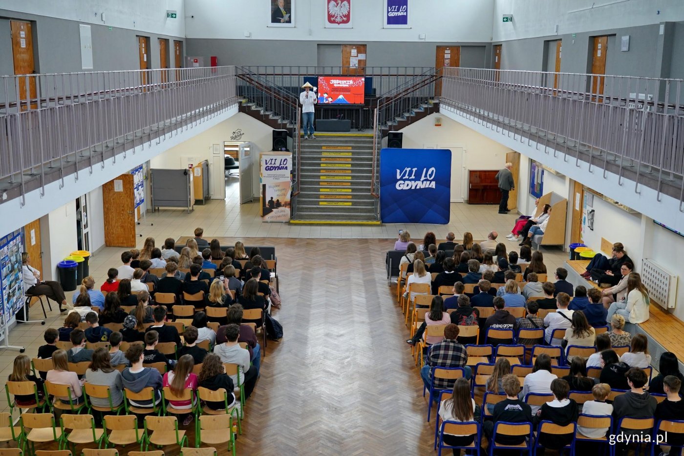 To był dzień pełen inspiracji, pozytywnej energii i impulsów do działania. A VII Liceum Ogólnokształcące ponownie stało się rozmów o motywacji, zdrowiu psychicznym i świadomym rozwoju. Wszystko za sprawą 2. edycji kongresu „Zdrowe Głowy”. W jego ramach uczniowie klas 8 z gdyńskich szkół mogli wysłuchać prezentacji o spełnianiu marzeń, a także dowiedzieć się więcej o podejmowaniu decyzji edukacyjnych czy budowaniu ścieżki rozwoju. Nawet mały impuls może być początkiem czegoś wielkiego – właśnie to chcieli pokazać młodym ludziom, a tym samym zachęcić ich do działania, organizatorzy kongresu młodych „Zdrowe Głowy”. 2. edycja wydarzenia odbyła się we wtorek, 14 kwietnia w VII Liceum Ogólnokształcącym w Gdyni, które jest częścią Zespołu Sportowych Szkół Ogólnokształcących. Wzięli w nim udział uczniowie klas 8 z gdyńskich placówek edukacyjnych, nauczyciele oraz samorządowcy i przedstawiciele Pomorskiego Kuratorium Oświaty. Kongres młodych „Zdrowe Głowy” jest bardzo ważny i cieszę się, że po raz kolejny Zespół Sportowych Szkół Ogólnokształcących podejmuje wyzwanie, żeby go zorganizować. Przede wszystkim dlatego, że jest współorganizowany przez młodych ludzi, czyli faktycznie oni są osią i podmiotem działań. Znamy badania dotyczące młodzieży, więc takie wydarzenia jak to, gdzie warsztaty, prelekcje będą dotyczyć tematu motywacji, tego, jak ustalać cele, jak planować swój rozwój, są bardzo istotne – mówi Oktawia Gorzeńska, wiceprezydentka Gdyni. Wideo i montaż: Dominika Nycz Tegorocznym hasłem kongresu była „MotywAkcja”, bo – jak tłumaczą organizatorzy – młodzi ludzie mają w sobie siłę. Wystarczy ją tylko uruchomić. I udział w wydarzeniu miał być do tego iskrą – wzmocnić młodych w działaniu, uczyć ich dbania o zdrowie psychiczne i pokazać, że nawet w sytuacjach kryzysowych warto szukać sensu i wsparcia. Wydarzenie łączyło inspirujące spotkanie i prelekcję z warsztatami motywacyjno-rozwojowymi. Od wielu lat obserwujemy, z jakimi problemami zmagają się młodzi ludzie. Uczestniczyliśmy w różnych inicjatywach. Psycholog szkolny oraz pedagog szkolny i ja wpadliśmy wspólnie na pomysł realizacji takiego projektu. Nazywamy to kongres „Zdrowe Głowy”. W tym roku motywem przewodnim jest „MotywAkcja”. Chcemy, aby młodzi ludzie zadbali o swój dobrostan, aby dobrze się czuli w przestrzeni. Warsztaty mają pokazać im, że można w dzisiejszym świecie i w realiach bardzo pozytywnych odnajdować swoje cele w życiu. Mamy nadzieję, że te nasze spotkania i zaproszenie młodych osób, takich jak np. podróżnicy, którzy m.in. prezentowali swoje dokonania na Kolosach, zachęcą ich do różnych pozytywnych działań – tłumaczy Marek Prusak, dyrektor VII Liceum w Gdyni. Kongres był przestrzenią rozmów o zdrowiu psychicznym i świadomym rozwoju. Opowieścią o odwadze, drodze i wytrwałości. A także spotkaniem, które zmienia sposób patrzenia na świat. O tym, że mimo lęku warto zrobić pierwszy krok mówił młodzieży Tytus Chmielewski – podróżnik rowerowy i twórca internetowy. Podczas prezentacji „Odwaga, droga i decyzja – jak realizować własne marzenia” opowiedział o swoich wyprawach do Brazylii i Japonii oraz o tym, jak przekuwać marzenia w konkretne decyzje. Tytus Chmielewski – podróżnik rowerowy i twórca internetowy podczas prezentacji na kongresie „Zdrowe Głowy” (fot. Magdalena Czernek) Po części wspólnej przyszedł czas na warsztaty motywacyjno-rozwojowe, które prowadzili nauczyciele VII Liceum Ogólnokształcącego. Miały one zachęcić uczniów do refleksji nad własną ścieżką i wesprzeć ich w podejmowaniu decyzji edukacyjnych. Uważam, że tego typu spotkania są bardzo potrzebne. Uświadamiają nas tak naprawdę, jak się uczyć i motywować siebie do tej nauki. Wyniosłam to, żeby się nie poddawać, żeby stawiać na swoim i że różne otoczenia dają różne sygnały, w jaki sposób mamy odbierać bodźce – mówi Maja Firgon, uczennica klasy III C w VII LO w Gdyni i radna Młodzieżowej Rady Miasta Gdyni.Przede wszystkim szkoła pokazuje, że stawia na uczniów i na to, że widzi problemy, jakie są wśród ludzi młodych. Chce pomagać tym ludziom, chce wspierać, chce motywować do tego, żeby działać, żeby też móc zainspirować innych do tego, że mogą działać i stawiać jednak siebie na pierwszym miejscu – dodaje Sonia Hewelt, absolwentka VII LO w Gdyni. Wydarzenie uświetnił występ cheerleaderek. Galeria zdjęć Pobierz galerię Marek Prusak, dyrektor VII Liceum w Gdyni, otwierający kongres „Zdrowe Głowy” (fot. Magdalena Czernek) Pobierz zdjęcie Młodzież uczestnicząca w kongresie „Zdrowe Głowy” zgromadzona na holu ZSSO w Gdyni (fot. Magdalena Czernek) Pobierz zdjęcie Od lewej: Ireneusz Trojanowicz – wiceprzewodniczący Rady Miasta Gdyni, wiceprezydentka Gdyni Oktawia Gorzeńska, reprezentantka Pomorskiego Kuratorium Oświaty oraz radna miasta Agnieszka Tokarska podczas kongresu „Zdrowe Głowy” (fot. Magdalena Czernek) Pobierz zdjęcie Młodzież uczestnicząca w kongresie „Zdrowe Głowy” zgromadzona na holu ZSSO w Gdyni (fot. Magdalena Czernek) Pobierz zdjęcie Wiceprezydentka Gdyni Oktawia Gorzeńska przemawiająca podczas kongresu „Zdrowe Głowy” (fot. Magdalena Czernek) Pobierz zdjęcie Wiceprezydentka Gdyni Oktawia Gorzeńska przemawiająca podczas kongresu „Zdrowe Głowy” (fot. Magdalena Czernek) Pobierz zdjęcie Cheerleaderki tańczące podczas kongresu „Zdrowe Głowy” (fot. Magdalena Czernek) Pobierz zdjęcie Tytus Chmielewski – podróżnik rowerowy i twórca internetowy podczas prezentacji na kongresie „Zdrowe Głowy” (fot. Magdalena Czernek) Pobierz zdjęcie Tytus Chmielewski – podróżnik rowerowy i twórca internetowy podczas prezentacji na kongresie „Zdrowe Głowy” (fot. Magdalena Czernek) Pobierz zdję