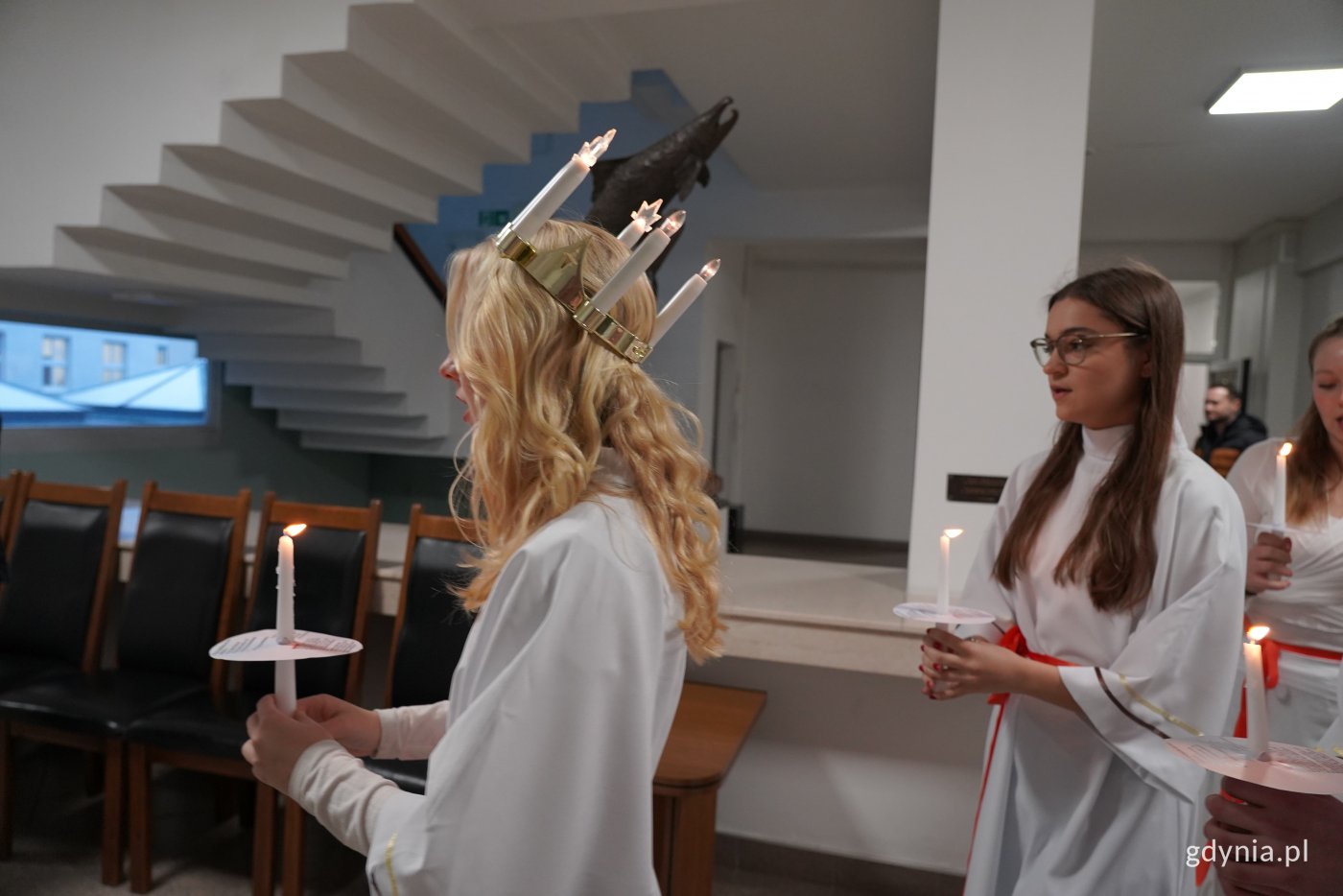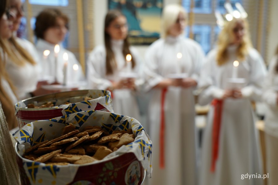 Jednym ze skandynawskich zwyczajów, który po części przyjął się również w Polsce, jest celebrowanie dnia św. Łucji (Luciadagen). Ponoć 13 grudnia to najdłuższa i najmroczniejsza noc w roku, dlatego na czele orszaku podąża Święta Łucja we własnej osobie. Odziana w białą szatę niesie światło, które rozjaśnia ciemność. 13 grudnia korytarze gdyńskiego magistratu rozświetliła procesja dziewcząt i chłopców w białych szatach niosących świece i śpiewających kolędę Sankta Lucia. Prowadziła ich św. Łucja, patronka światła. Tak uczniowie II Liceum Ogólnokształcącego w Gdyni kultywują pochodzącą ze Szwecji tradycję. Przywitała ich wiceprezydent Oktawia Gorzeńska. Było śpiewanie świątecznych pieśni, opowieści o gdyńskiej historii oraz słodkie pierniczki. Goście zostali obdarowani kalendarzami ozdobionymi zdjęciami architektury modernizmu.Uczniowie w gabinecie prezydent Oktawii Gorzeńskiej (fot. Karolina Szypelt)Jak opowiada kontynuatorka akcji i nauczycielka języka szwedzkiego w II Liceum Ogólnokształcącym, Anna Ćwiklińska-Rutka, wzajemne przenikanie się zwyczajów jest efektem trwającej blisko trzy dekady wymiany studenckiej między gdyńską Dwójką a afChapman w Karlskronie. W szkole działa również koło języka szwedzkiego, gdzie młodzież ma okazję poznać bliżej kulturę, tradycję i historię Szwecji. Kult św. Łucji z Syrakuz pochodzi z Włoch, jednak najbardziej okazałą oprawę ma w Skandynawii, głównie w Szwecji i Norwegii, gdzie 13 grudnia organizowane są procesje na cześć patronki. Data ta symbolizuje wydłużający się dzień, w którym św. Łucja przychodzi ze światłem i je rozdaje. Dziewczęta ubrane w białe suknie ze świecami w dłoniach przemierzają ulice. Towarzyszą im chłopcy w spiczastych czapkach (gwiezdni chłopcy). Uczestnicy częstują ludność pierniczkami i kawą, dla pokrzepienia po ciężkiej nocy. Jak na Skandynawię przystało, tradycja tradycją, ale nie należy nikogo wyłączać czy sprawiać, by poczuł się niechciany. Dlatego do wspólnego pochodu zapraszane są dzieci i młodzież różnych wyznań oraz ci, dla których Szwecja nie jest krajem urodzenia. Galeria zdjęć Pobierz galerię 13 grudnia korytarze rozświetliła procesja dziewcząt i chłopców w białych szatach (fot. Karolina Szypelt) Pobierz zdjęcie Korytarze rozświetliła procesja dziewcząt i chłopców w białych szatach (fot. Karolina Szypelt) Pobierz zdjęcie Uczniów przywitała Oktawia Gorzeńska, towarzyszyła jej Honorata Krupka (fot. Karolina Szypelt) Pobierz zdjęcie Uczniów przywitała Oktawia Gorzeńska (fot. Karolina Szypelt) Pobierz zdjęcie Uczniowie w gabinecie Oktawii Gorzeńskiej (fot. Karolina Szypelt) Pobierz zdjęcie Uczniowie w gabinecie Oktawii Gorzeńskiej (fot. Karolina Szypelt) Pobierz zdjęcie Słodkie pierniczki dla pokrzepienia (fot. Karolina Szypelt) Pobierz zdjęcie Słodkie pierniczki dla pokrzepienia (fot. Karolina Szypelt) Pobierz zdjęcie Uczniów przywitała Oktawia Gorzeńska, towarzyszyła jej Honorata Krupka (fot. Karolina Szypelt) Pobierz zdjęcie Słodkie pierniczki dla pokrzepienia (fot. Karolina Szypelt) Pobierz zdjęcie Oktawia Gorzeńska wręczyła uczniom gdyńskie kalendarze (fot. Karolina Szypelt) Pobierz zdjęcie Odziana w białą szatę niesie światło, które rozjaśnia ciemność (fot. Karolina Szypelt) Pobierz zdjęcie Na zdjęciu od lewej: Anna Ćwiklińska-Rutka, Oktawia Gorzeńska, uczniowie II LO oraz Honorata Krupka (fot. Karolina Szypelt) Pobierz zdjęcie Odziana w białą szatę niesie światło, które rozjaśnia ciemność (fot. Karolina Szypelt) Pobierz zdjęcie Odziana w białą szatę niesie światło, które rozjaśnia ciemność (fot. Karolina Szypelt) Pobierz zdjęcie Odziana w białą szatę niesie światło, które rozjaśnia ciemność (fot. Karolina Szypelt) Pobierz zdjęcie Warunki pobierania Wszelkie prawa do zdjęć lub grafik prezentowanych w ramach portalu, należą do Prowadzącego portal lub do podmiotów z nim współpracujących i podlegają ochronie prawnej. Prowadzący portal zezwala na kopiowanie i przedstawianie utworów jedynie w celach niekomercyjnych oraz pod warunkiem zachowania go w oryginalnej postaci i zachowaniem kontekstu tematu, do którego zostało wykorzystaneprzez redakcję gdynia.pl. Opublikowane materiały powinny zawsze zawierać źródło, czyli adres strony www.gdynia.pl. Na publikowanie utworów w innych celach wymagana jest zgoda właściciela strony czyli Prowadzącego portal. Opublikowano: 13.12.2024 14:45 Autor: Karolina Szypelt (karolina.szypelt@gdynia.pl) Zmodyfikowano: 13.12.2024 14:45 Zmodyfikował: Małgorzata Omachel - Kwidzińska