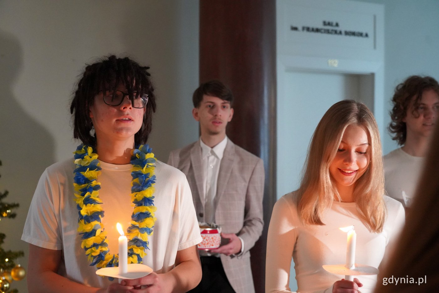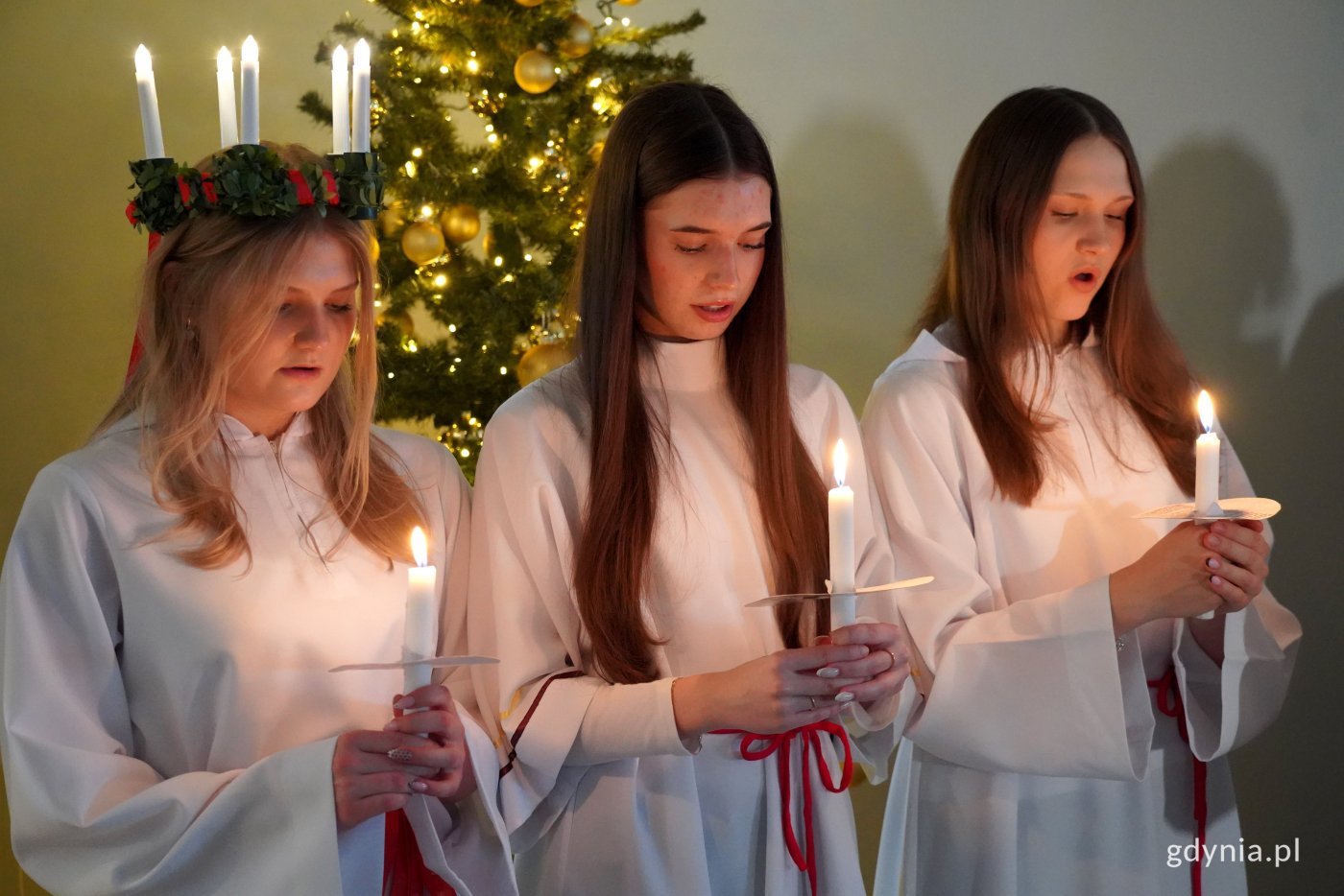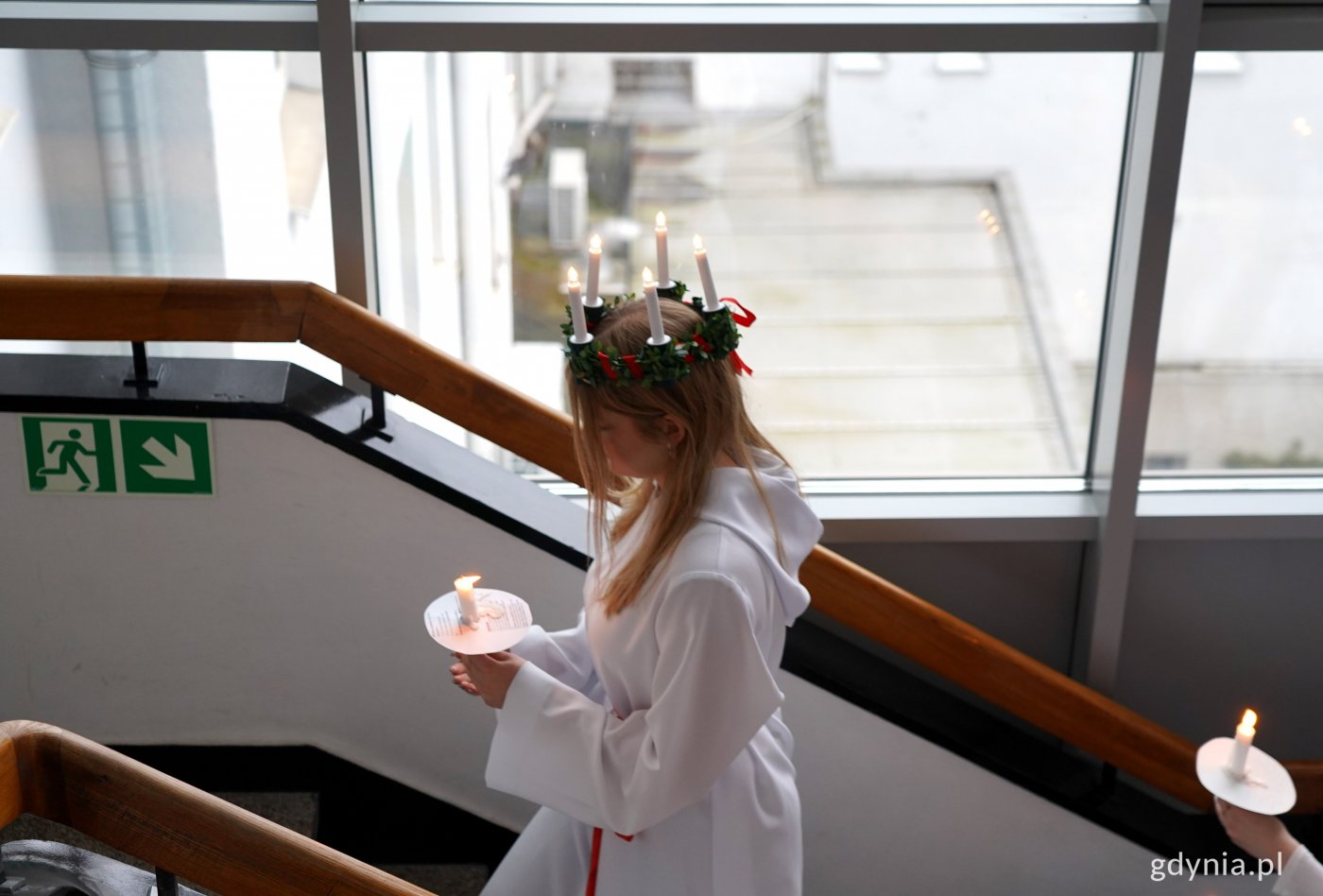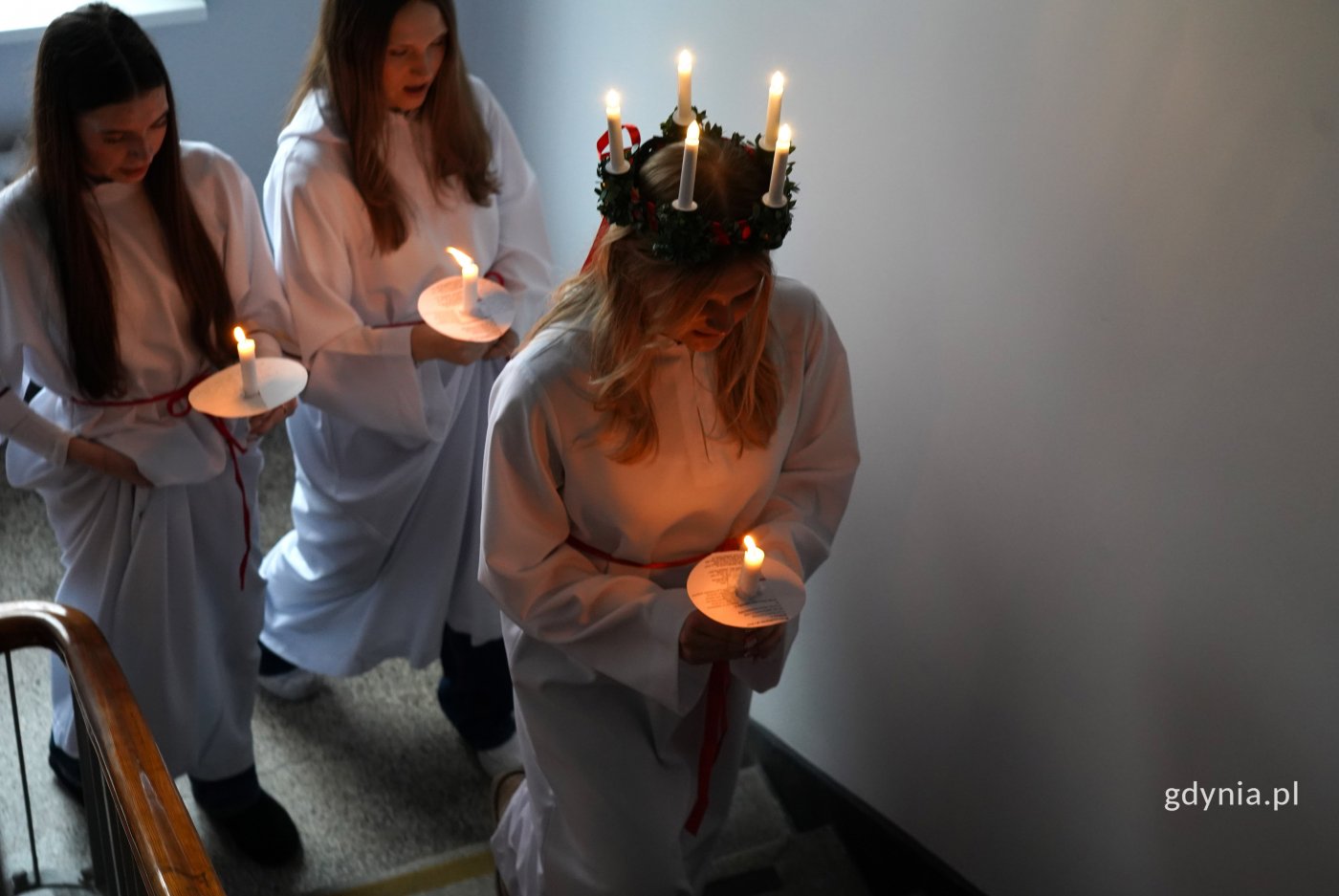 12 grudnia korytarze gdyńskiego magistratu rozświetliła procesja dziewcząt i chłopców w białych szatach niosących świece i śpiewających kolędę Sankta Lucia. Prowadziła ich św. Łucja, patronka światła. Były szwedzkie pieśni adwentowe i słodkie pierniczki. Tak uczniowie II Liceum Ogólnokształcącego kultywują pochodzącą ze Szwecji tradycję. Dwa nadmorskie miasta, które łączy więcej niż linia promowa – tak pokrótce można można opisać Gdynię i Karlskronę. Dzięki trwającej ponad 30 lat wymianie uczniowskiej młodzież II LO przesiąka kulturą i zwyczajami. Jednym z ulubionych skandynawskich zwyczajów, który przenieśli na polski grunt, jest celebrowanie dnia św. Łucji (Luciadagen). Ponoć 13 grudnia to najdłuższa i najmroczniejsza noc w roku, dlatego na czele orszaku podąża Święta Łucja we własnej osobie. Odziana w białą szatę niesie światło, które rozjaśnia ciemność.Orszak św. Łucji przywitała wiceprezydentka Oktawia Gorzeńska. Było śpiewanie świątecznych pieśni, rozmowy wokół edukacji oraz słodkie pierniczki. Goście zostali obdarowani drobnymi upominkami.Uczniowie II LO z nauczycielką j. szwedzkiego Anną Ćwiklińską-Rutką w gabinecie wiceprezydentki Oktawii Gorzeńskiej (fot. Karolina Szypelt)Jak opowiada kontynuatorka akcji i nauczycielka języka szwedzkiego w II Liceum Ogólnokształcącym, Anna Ćwiklińska-Rutka, wzajemne przenikanie się zwyczajów jest efektem trwającej ponad trzy dekady wymiany studenckiej między gdyńską Dwójką a afChapman w Karlskronie. W szkole działa również koło języka szwedzkiego, w którym młodzież ma okazję poznać bliżej kulturę, tradycję i historię Szwecji. Video i montaż: Przemysław DopkeKult św. Łucji z Syrakuz pochodzi z Włoch, jednak najbardziej okazałą oprawę ma w Skandynawii, głównie w Szwecji i Norwegii, gdzie 13 grudnia organizowane są procesje na cześć patronki. Data ta symbolizuje wydłużający się dzień, w którym św. Łucja przychodzi ze światłem i je rozdaje. Dziewczęta ubrane w białe suknie ze świecami w dłoniach przemierzają ulice. Towarzyszą im chłopcy w spiczastych czapkach (gwiezdni chłopcy). Uczestnicy częstują pierniczkami i kawą, dla pokrzepienia po ciężkiej nocy. Jak na Skandynawię przystało, tradycja tradycją, ale nie należy nikogo wyłączać czy sprawiać, by poczuł się niechciany. Dlatego do wspólnego pochodu zapraszane są dzieci i młodzież różnych wyznań oraz ci, dla których Szwecja nie jest krajem urodzenia. Galeria zdjęć Pobierz galerię Na zdjęciu uczniowie w orszaku św. Łucji (fot. Karolina Szypelt) Pobierz zdjęcie Na zdjęciu uczniowie w orszaku św. Łucji (fot. Karolina Szypelt) Pobierz zdjęcie Orszak św. Łucji przywitała wiceprezydentka Oktawia Gorzeńska (fot. Karolina Szypelt) Pobierz zdjęcie Jedna z uczennic w roli Łucji (fot. Karolina Szypelt) Pobierz zdjęcie Uczniowie oraz koordynatorka akcji, nauczycielka j. szwedzkiego, Anna Ćwiklińska-Rutka z wizytą u wiceprezydent Oktawii Gorzeńskiej (fot. Karolina Szypelt) Pobierz zdjęcie Słodkie pierniczki dające energię po długiej nocy to element tradycji (fot. Karolina Szypelt) Pobierz zdjęcie Tak uczniowie II Liceum Ogólnokształcącego kultywują pochodzącą ze Szwecji tradycję (fot. Karolina Szypelt) Pobierz zdjęcie Tak uczniowie II Liceum Ogólnokształcącego kultywują pochodzącą ze Szwecji tradycję (fot. Karolina Szypelt) Pobierz zdjęcie Tak uczniowie II Liceum Ogólnokształcącego kultywują pochodzącą ze Szwecji tradycję (fot. Karolina Szypelt) Pobierz zdjęcie Tak uczniowie II Liceum Ogólnokształcącego kultywują pochodzącą ze Szwecji tradycję (fot. Karolina Szypelt) Pobierz zdjęcie Tak uczniowie II Liceum Ogólnokształcącego kultywują pochodzącą ze Szwecji tradycję (fot. Karolina Szypelt) Pobierz zdjęcie Orszak św. Łucji w urzędzie (fot. Karolina Szypelt) Pobierz zdjęcie Orszak św. Łucji w urzędzie (fot. Karolina Szypelt) Pobierz zdjęcie Orszak św. Łucji w urzędzie (fot. Karolina Szypelt) Pobierz zdjęcie Orszak św. Łucji w urzędzie (fot. Karolina Szypelt) Pobierz zdjęcie Warunki pobierania Wszelkie prawa do zdjęć lub grafik prezentowanych w ramach portalu, należą do Prowadzącego portal lub do podmiotów z nim współpracujących i podlegają ochronie prawnej. Prowadzący portal zezwala na kopiowanie i przedstawianie utworów jedynie w celach niekomercyjnych oraz pod warunkiem zachowania go w oryginalnej postaci i zachowaniem kontekstu tematu, do którego zostało wykorzystaneprzez redakcję gdynia.pl. Opublikowane materiały powinny zawsze zawierać źródło, czyli adres strony www.gdynia.pl. Na publikowanie utworów w innych celach wymagana jest zgoda właściciela strony czyli Prowadzącego portal. Opublikowano: 12.12.2025 14:30 Autor: Karolina Szypelt (karolina.szypelt@gdynia.pl) Zmodyfikowano: 12.12.2025 16:36 Zmodyfikował: Karolina Szypelt