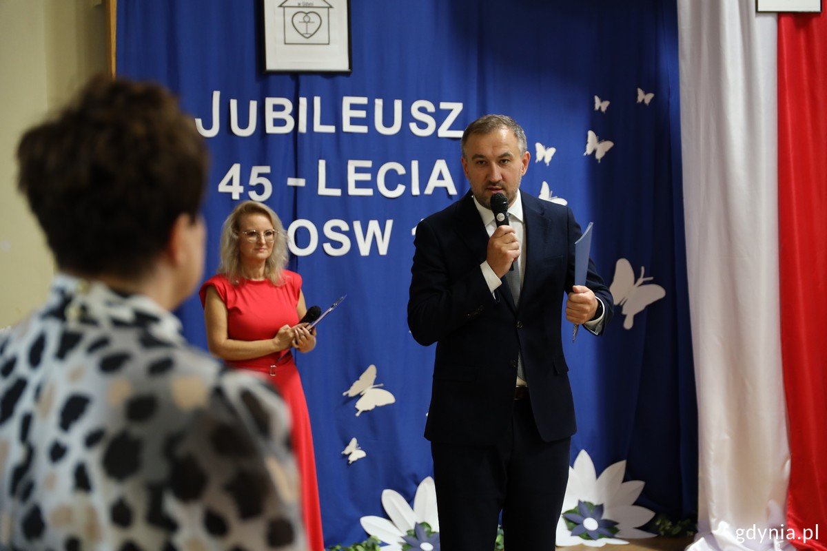 To była bardzo wzruszająca uroczystość. Podopieczni Specjalnego Ośrodka Szkolno-Wychowawczego nr 1 Gdyni świętowali swój 45. jubileusz. Były kwiaty, życzenia i występy artystyczne w wykonaniu dzieci. Nie zabrakło też listy z marzeniami, o której opowiedziała dyrektorka placówki – Alicja Spica. Specjalny Ośrodek Szkolno-Wychowawczy nr 1 mieści się przy ul. płk. Stanisława Dąbka 277 w Gdyni. To placówka dla uczniów posiadających orzeczenie o potrzebie kształcenia specjalnego, z niepełnosprawnością intelektualną w stopniu umiarkowanym lub znacznym oraz ze sprzężeniami (niewidzenie, niedowidzenie, niedosłuch, niesłyszenie, niepełnosprawność ruchowa).W tym roku placówka obchodzi swój 45. jubileusz. Z tej okazji 8 października w szkole odbyła się uroczystość, w której wzięli udział m.in. wiceprezydent Gdyni Tomasz Augustyniak, naczelniczka Wydziału Edukacji UMG Iwona Tanewska, dyrektorzy innych gdyńskich szkół i przedszkoli oraz rodzice i absolwenci SOSW nr 1. O piękną oprawę artystyczną zadbali uczniowie i ich nauczyciele. Wideo i montaż: Sławomir Okoń Bardzo dziękuję wszystkim nauczycielom, wychowawcom, dyrektorom i całemu personelowi administracyjnemu placówki. Robicie ogromną robotę – dziękował podczas uroczystości Tomasz Augustyniak, wiceprezydent Gdyni.Specjalnemu Ośrodkowi Szkolno-Wychowawczemu nr 1 w Gdyni przyświeca dbanie o to dobro uczniów. Dzisiaj oglądaliśmy występy uczniów i to, co potrafią – jacy są otwarci i jak potrafią ze sobą rozmawiać. To jest efekt ciężkiej pracy nauczycieli i pracowników – dodaje Iwona Tanewska, naczelniczka Wydziału Edukacji UMG. Jubileuszowe uroczystości prowadziły Alicja Spica, dyrektorka placówki oraz wicedyrektorki – Marta Rewers i Beata Kręciewska. Na zdj. wicedyrektorki SOSW nr 1 Marta Rewers i Beata Kręciewska (fot. Magda Śliżewska) Dla mnie, osoby kierującej ośrodkiem od 20 lat, to jest niezwykle wzruszający dzień. Dzień, w którym widzimy całokształt pracy kadry pedagogicznej, pracowników administracji i obsługi. Mogliśmy zobaczyć, jak wiele umiejętności, wiadomości, talentów mają nasi uczniowie. Jestem niezwykle wzruszona w związku z tym, że nasza praca przynosi wymierne efekty – mówiła dyrektorka Alicja Spica. W ośrodku wychowankowie o specjalnych potrzebach edukacyjnych otrzymują fachową pomoc wyspecjalizowanej kadry pedagogicznej w oparciu o wszechstronne nowoczesne metody i formy pracy oraz z zastosowaniem narzędzi wysokiej technologii. Ze względu na specyfikę placówki kształcenia specjalnego, organizacja pracy dydaktyczno-wychowawczej nacechowana jest wszechstronną, specjalistyczną pomocą psychologiczno-pedagogiczną, indywidualizacją, życzliwością, umiejętnym stopniowaniem trudności, przyjazną atmosferą. Ośrodek dysponuje nowoczesną bazą dydaktyczną i sportowo-rekreacyjną. Ma pracownie, gabinety, sale lekcyjne, kuchnię stołówkę, szklarnię, boisko, plac zabaw, bieżnię, piękny teren zielony, internat dla ośmiorga wychowanków.Uczniowie rozwijają swoje talenty sportowe, teatralne, muzyczne, plastyczne, taneczne, recytatorskie zgodnie z indywidualnymi preferencjami i możliwościami. Mają okazję wyjazdów na zawody i turnieje sportowe, przeglądy teatralne i festiwale muzyczne. Uczniowie uczestniczą w różnorodnych konkursach, odnosząc w nich sukcesy. Wzrasta ich poczucie własnej wartości, sprawczości i odpowiedzialności.W ośrodku prowadzone są również zajęcia wczesnego wspomagania rozwoju – dla dzieci posiadających opinię o wczesnym wspomaganiu rozwoju. Jak podkreśla dyrektor Alicja Spica, absolwenci placówki zdobywają tutaj przede wszystkim kompetencje społeczne i komunikacyjne. Takie, które dają im możliwość samodzielnego funkcjonowania w życiu społecznym na miarę możliwości integracji ze środowiskiem.Na zdj. m.in. dyrektorka SOSW nr 1 Alicja Spica (fot. Magda Śliżewska) W naszym ośrodku wszyscy bardzo mocno włączają się w proces edukacyjny, wychowawczy i opiekuńczy, również Rada Rodziców, która współpracuje z nami dla dobra swoich dzieci, a naszych uczniów. Razem tworzymy zgraną społeczność szkolną i z takimi ludźmi, o tak otwartym sercu, takiej empatii, otwartości i tolerancji, można zyskać bardzo wiele. Możemy zbudować lepszy świat. – podsumowuje pani Alicja Spica. Galeria zdjęć Pobierz galerię Na zdj. m.in. (od lewej): dyrektorka Alicja Spica, wiceprezydent Tomasz Augustyniak, naczelniczka Wydziału Edukacji Iwona Tanewska i Dorota Gospodarczyk z Wydziału Edukacji (fot. Magda Śliżewska) Pobierz zdjęcie Na zdj. m.in. dyrektorka SOSW nr 1 Alicja Spica oraz poczet sztandarowy (fot. Magda Śliżewska) Pobierz zdjęcie Poczet sztandarowy (fot. Magda Śliżewska) Pobierz zdjęcie 45. jubileusz Specjalnego Ośrodka Szkolno-Wychowawczego nr 1 (fot. Magda Śliżewska) Pobierz zdjęcie 45. jubileusz Specjalnego Ośrodka Szkolno-Wychowawczego nr 1 (fot. Magda Śliżewska) Pobierz zdjęcie 45. jubileusz Specjalnego Ośrodka Szkolno-Wychowawczego nr 1 (fot. Magda Śliżewska) Pobierz zdjęcie 45. jubileusz Specjalnego Ośrodka Szkolno-Wychowawczego nr 1 (fot. Magda Śliżewska) Pobierz zdjęcie 45. jubileusz Specjalnego Ośrodka Szkolno-Wychowawczego nr 1 (fot. Magda Śliżewska) Pobierz zdjęcie Na zdj. m.in. wiceprezydent Gdyni Tomasz Augustyniak (fot. Magda Śliżewska) Pobierz zdjęcie 45. jubileusz Specjalnego Ośrodka Szkolno-Wychowawczego nr 1 (fot. Magda Śliżewska) Pobierz zdjęcie Warunki pobierania Wszelkie prawa do zdjęć lub grafik prezentowanych w ramach portalu, należą do Prowadzącego portal lub do podmiotów z nim współpracujących i podlegają ochronie prawnej. Prowadzący portal zezwala na kopiowanie i przedstawianie utworów jedynie w celach niekomercyjnych oraz pod warunkiem zachowania go w oryginalnej postaci i zachowaniem kontekstu tematu, do którego zostało wykorzystaneprzez redakcję gdynia.pl. 