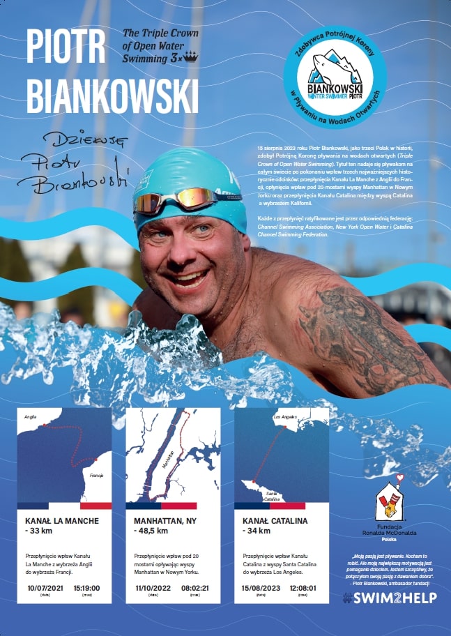 Piotr Biankowski jako trzeci Polak w historii oraz 314 osoba na świecie oficjalnie zdobył Potrójną Koronę pływania na wodach otwartych (Triple Crown of Open Water Swimming). W jej skład wchodzą trzy najważniejsze odcinki: Kanał La Manche, Kanał Catalina oraz opłynięcie wyspy Manhattan w Nowym Jorku. Piotr Biankowski przepłynął Kanał La Manche, z wybrzeża Anglii do wybrzeża Francji w dniu 10 lipca 2021 r. Przeprawa trwała 15 godzin i 19 minut. Kolejno, 11 października 2022 roku opłynął wyspę Manhattan pod 20-mostami Nowego Jorku, co zajęło mu 8 godzin i 2 minuty. Ostatnim, elementem do uzyskania korony było przepłynięcie Kanału Catalina z wyspy Catalina do wybrzeży Los Angeles. Ten odcinek Piotr Biankowski pokonał 15 sierpnia 2023 roku w 12 godzin i 8 minut.Plakat informujący o zdobyciu przez Piotra Biankowskiego Potrójnej Korony Open waterPiotr Biankowski od 2018 roku jest Ambasadorem Fundacji Ronalda McDonalda a jego przeprawy połączone z charytatywnymi zbiórkami na wsparcie jej funkcjonowania w Polsce.Przepłynięcie Kanału La Manche Piotr Biankowski dedykował drugiemu Domowi Ronalda McDonalda, w którym mieszkają bezpłatnie rodzice w czasie długiej choroby dziecka i pobytu w szpitalu. Podczas opłynięcia wyspy Manhattan zebrane środki przeznaczone zostały na zakup nowych drzwi do nowego Trzeciego Domu Fundacji Ronalada McDonalda. Tegoroczna, podwójna przeprawa przez Kanał Catalina, którą Piotr Biankowski podjął wraz z pływaczką ekstremalną Aleksandrą Kabelis dedykowana została Mobilnemu Ambulansowi Fundacji Ronalda McDonalda. Dzięki wsparciu darczyńców pływacy zebrali środki na przyjazd Ambulansu, który bezpłatnie badać będzie dzieci w wieku od 9 miesięcy do 6 roku życia w celu wykrywania zmian USG.Piotr Biankowski jest organizatorem największej imprezy zimowego pływania w Polsce – Gdynia Winter Swimming Cup. Już w styczniu 2024 roku zawody odbędą się w formule Pucharu Świata federacji IWSA. Opublikowano: 28.12.2023 10:01 Autor: Piotr Suchenia (p.suchenia@gdyniasport.pl) Zmodyfikowano: 28.12.2023 11:13 Zmodyfikował: Agnieszka Janowicz