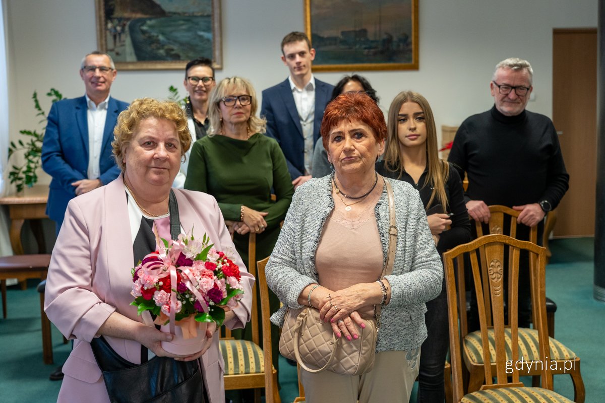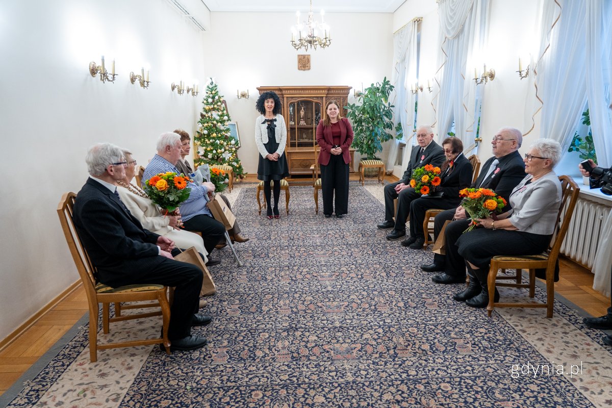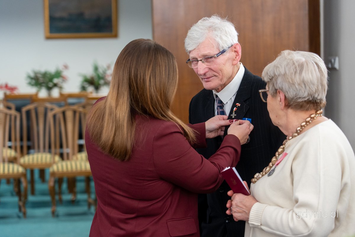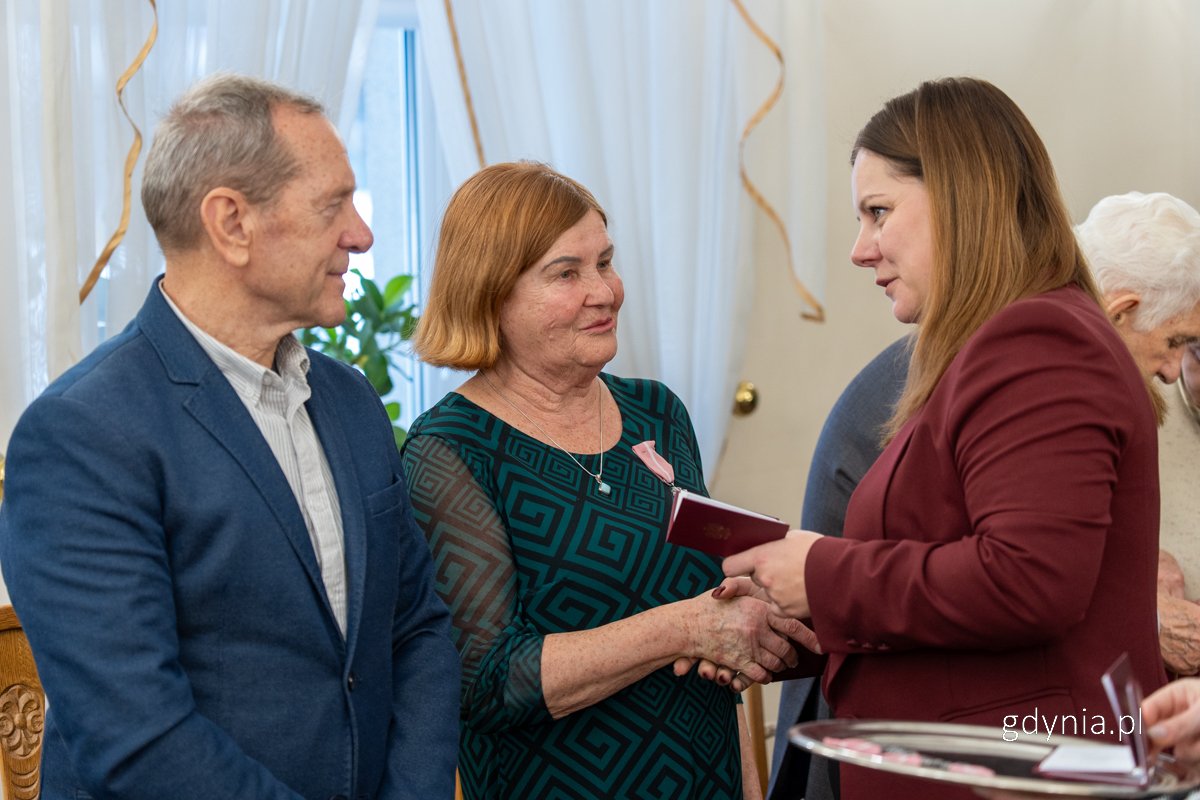 W sali ślubów Urzędu Stanu Cywilnego w Gdyni odbyła się dziś wyjątkowa uroczystość, podczas której 16 par świętowało złote gody: 50-lecie pożycia małżeńskiego. Aleksandra Kosiorek, prezydent Gdyni, uhonorowała małżonków Medalami za Długoletnie Pożycie Małżeńskie. Prezydent Gdyni Aleksandra Kosiorek wręczyła dziś, w imieniu Prezydenta RP Karola Nawrockiego, Medale za Dłogoletnie Pożycie Małżeńskie. Mówiła, że pary z tak imponującym stażem są nie tylko świadectwem trwałości małżeństwa, ale również inspiracją dla młodszych pokoleń, które dopiero uczą się, czym jest prawdziwe partnerstwo.Uroczystość miała ciepły, rodzinny charakter. Aby każdej parze poświęcić należytą uwagę, spotkania odbyły się w Urzędzie Stanu Cywilnego o godzinie 13:00, 14:00 oraz 15:00. W Sali Ślubów nie brakowało wzruszeń, uśmiechów i dumy, z jaką bliscy towarzyszyli jubilatom w tym szczególnym dniu.Prezydent Gdyni, przekazując medale, składała każdej parze osobiste gratulacje i życzenia kolejnych wspólnych lat w zdrowiu, spokoju i miłości. Jak zaznaczała, pół wieku razem to dowód na to, że wzajemny szacunek, cierpliwość i bliskość są wartościami, które nie tracą na znaczeniu.Jubilaci uhonorowani medalami przez prezydent Gdyni Aleksandrę Kosiorek (fot. Michał Sałata)O godz. 13:00 medale odebrali: Barbara i Zbigniew Bartykowscy, Janina i Eligiusz Cieślikowie, Ewa i Maciej Gajdowie, Maria i Bronisław Gomółkowie, Krystyna i Kazimierz Kiełbasowie, Janina i Marian Wołczowie. Jubilaci z godz. 13:00 z prezydent Gdyni Aleksandrą Kosiorek oraz Inocentą Nycz, kierownik USC w Urzędzie Miasta Gdyni (fot. Michał Sałata)O godz. 14:00 medale odebrali: Jolanta i Wiesław Kozakowie, Anna i Wiesław Krasoniowie, Elżbieta i Edwin Makowscy, Halina i Paweł Okrojowie, Zofia i Kazimierz Orpelowie, Józefa i Stanisław Pecynowie. Jubilaci z godz. 14:00 z prezydent Gdyni Aleksandrą Kosiorek oraz Inocentą Nycz, kierownik USC w Urzędzie Miasta Gdyni (fot. Michał Sałata)O godz. 15:00 medale odebrali: Jadwiga i Krzysztof Piórowie, Grażyna i Aleksander Pułowie, Grażyna i Cezary Staniszewscy, Hilaria i Marian Żurkowie. Jubilaci z godz. 15:00 z prezydent Gdyni Aleksandrą Kosiorek oraz Inocentą Nycz, kierownik USC w Urzędzie Miasta Gdyni (fot. Michał Sałata)Jubileuszową ceremonię uświetnił krótki koncert skrzypcowy w wykonaniu Angeliki Kwiek, uczennicy Szkoły Muzycznej w Gdyni, przy akompaniamencie Macieja Gałązki. Wszystkim jubilatom składamy serdeczne gratulacje i życzymy kolejnych lat wspólnej drogi – w zdrowiu, miłości i codziennej radości. Galeria zdjęć Pobierz galerię Złote gody gdyńskich par. Na zdjęciu prezydent Gdyni Aleksandra Kosiorek oraz Inocenta Nycz, kierownik USC (fot. Michał Sałata) Pobierz zdjęcie Złote gody gdyńskich par. Medale wręczała Aleksandra Kosiorek, prezydent Gdyni (fot. Michał Sałata) Pobierz zdjęcie Złote gody gdyńskich par. Medale wręczała Aleksandra Kosiorek, prezydent Gdyni (fot. Michał Sałata) Pobierz zdjęcie Złote gody gdyńskich par (fot. Michał Sałata) Pobierz zdjęcie Złote gody gdyńskich par (fot. Michał Sałata) Pobierz zdjęcie Złote gody gdyńskich par (fot. Michał Sałata) Pobierz zdjęcie Złote gody gdyńskich par (fot. Michał Sałata) Pobierz zdjęcie Złote gody gdyńskich par (fot. Michał Sałata) Pobierz zdjęcie Złote gody gdyńskich par. Na zdjęciu prezydent Gdyni Aleksandra Kosiorek oraz Inocenta Nycz, kierownik USC (fot. Michał Sałata) (fot. Michał Sałata) Pobierz zdjęcie Złote gody gdyńskich par (fot. Michał Sałata) Pobierz zdjęcie Złote gody gdyńskich par. Medale wręczała Aleksandra Kosiorek, prezydent Gdyni (fot. Michał Sałata) Pobierz zdjęcie Złote gody gdyńskich par. Medale wręczała Aleksandra Kosiorek, prezydent Gdyni (fot. Michał Sałata) Pobierz zdjęcie Złote gody gdyńskich par. Medale wręczała Aleksandra Kosiorek, prezydent Gdyni (fot. Michał Sałata) Pobierz zdjęcie Złote gody gdyńskich par (fot. Michał Sałata) Pobierz zdjęcie 12 stycznia 2026 roku w sali ślubów Urzędu Stanu Cywilnego w Gdyni odbyła się wyjątkowa uroczystość, podczas której 16 par świętowało złote gody, czyli 50-lecie pożycia małżeńskiego. Na zdjęciu prezydent Gdyni Aleksandra Kosiorek i Inocenta Nycz, kierownik Urzędu Stanu Cywilnego (fot. Michał Sałata) Pobierz zdjęcie Złote gody gdyńskich par. Medale wręczała Aleksandra Kosiorek, prezydent Gdyni (fot. Michał Sałata) Pobierz zdjęcie Złote gody gdyńskich par (fot. Michał Sałata) Pobierz zdjęcie Złote gody gdyńskich par (fot. Michał Sałata) Pobierz zdjęcie Warunki pobierania Wszelkie prawa do zdjęć lub grafik prezentowanych w ramach portalu, należą do Prowadzącego portal lub do podmiotów z nim współpracujących i podlegają ochronie prawnej. Prowadzący portal zezwala na kopiowanie i przedstawianie utworów jedynie w celach niekomercyjnych oraz pod warunkiem zachowania go w oryginalnej postaci i zachowaniem kontekstu tematu, do którego zostało wykorzystaneprzez redakcję gdynia.pl. Opublikowane materiały powinny zawsze zawierać źródło, czyli adres strony www.gdynia.pl. Na publikowanie utworów w innych celach wymagana jest zgoda właściciela strony czyli Prowadzącego portal. Opublikowano: 12.01.2026 16:30 Autor: Michał Sałata (michal.salata@gdynia.pl) Zmodyfikowano: 12.01.2026 16:40 Zmodyfikował: Aleksandra Dylejko