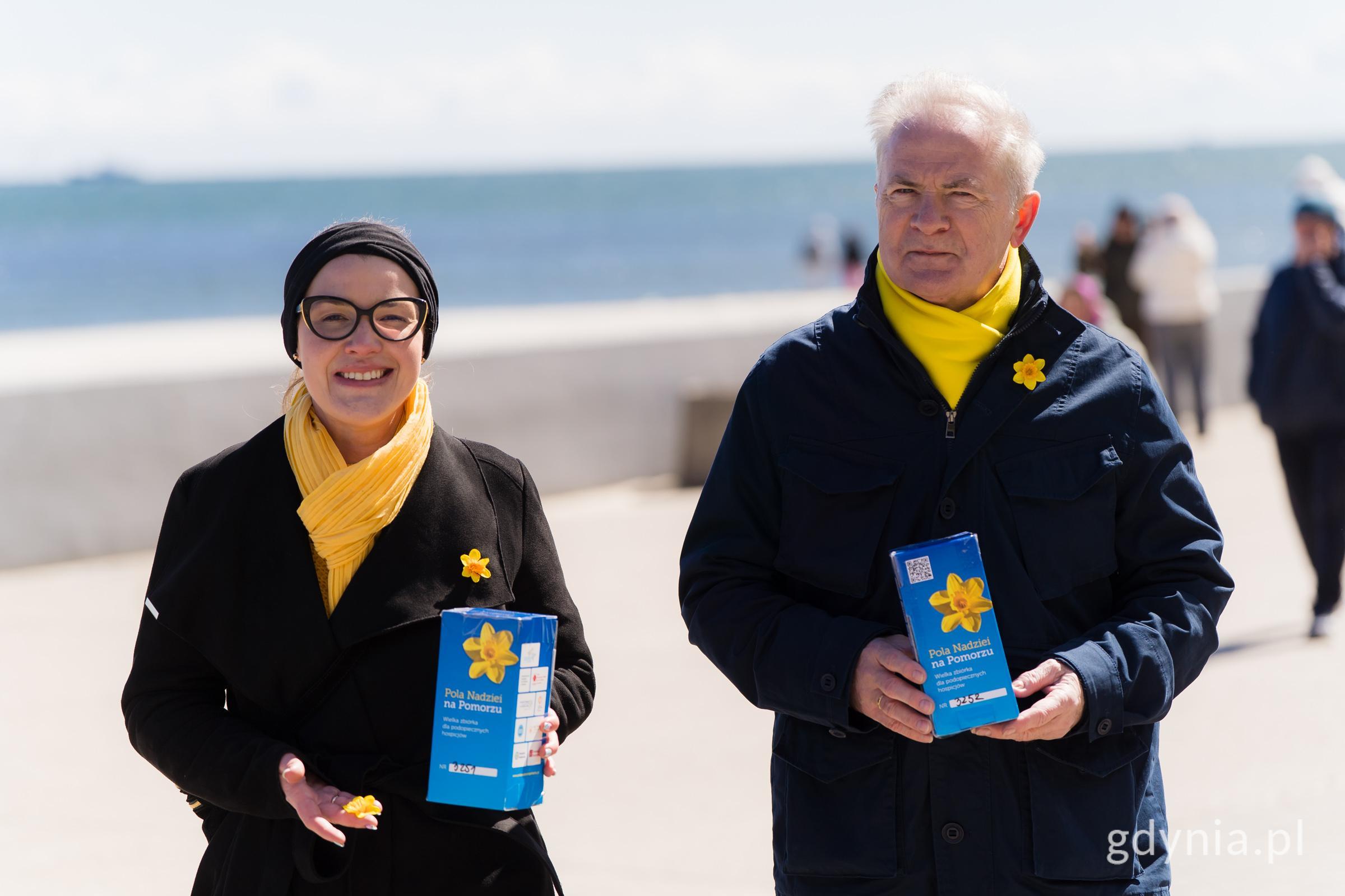 Ponad 300 wolontariuszy kwestowało dziś na ulicach w Gdyni na rzecz Hospicjum im. Świętego Wawrzyńca oraz Hospicjum dla Dzieci „Bursztynowa Przystań”. Wśród moich byli m.in. parlamentarzyści, radni, nauczyciele, studenci i uczniowie. To nasza lokalna odsłona ogólnopolskiej akcji „Pola Nadziei”, w ramach której solidarnie niesiemy pomoc najbardziej potrzebującym. „Pola Nadziei” to wyjątkowa akcja charytatywna, której symbolem jest żonkil – kwiat nadziei, troski i pamięci. Jej celem jest wspieranie hospicjów oraz zwrócenie uwagi na potrzeby osób ciężko chorych i u kresu życia.W Gdyni, podobnie jak w całym kraju, co roku wolontariusze sadzą cebulki żonkili jesienią, a wiosną, gdy kwiaty zakwitają, organizowane są zbiórki, marsze, wydarzenia edukacyjne i spotkania integrujące lokalną społeczność. Młodzież kwestująca w Galerii Szperk (fot. Michał Puszczewicz) W tym roku wolontariusze z żonkilami pojawiali się na ulicach miasta oraz w centrach handlowych w niedzielę, 26 kwietnia. Wśród nich są tacy, którzy w „Polach Nadziei” uczestniczą od samego początku i co roku kwestują w kwietniu.Wśród kwestujących dziś na ulicach naszego miasta można było spotkać między innymi senatora Sławomira Rybickiego, posłanka Wioletę Tomczak, przewodniczącego Rady Miasta Gdyni Tadeusza Szemiota, radnych miasta: Monikę Strzałkowską, Agnieszkę Tokarską, Dominika Aziewicza, radnych dzielnic: Izabelę Radzimińską i Macieja Wojnickiego. Kwestuję w Gdyni od piętnastu lat, trudno mi już sobie wyobrazić kwiecień bez symbolicznych, żółtych żonkili – mówi Sławomir Rybicki, senator RP. – Uważam, że w każdym człowieku jest ogrom dobra, empatii, wystarczy tylko pozwolić mu rozkwitnąć, by mogło nieść nadzieję innym. Z hospicjum sprawa jest szczególna, bo dziś kwestujemy, ofiarowując swój czas, serce i wsparcie tym, którzy tego najbardziej potrzebują. Jutro życie może sprawić, że to my lub nasi bliscy będziemy potrzebowali takiej samej troski, obecności i pomocy. Dlatego warto być razem dziś. Warto nieść dobro. Senator Sławomir Rybicki i posłanka Wioleta Tomczak podczas kwesty (fot. Paweł Budziński) „Pola Nadziei" przypominają nam, że siła wspólnoty rodzi się z wrażliwości na potrzeby drugiego człowieka – podkreśla Tadeusz Szemiot, przewodniczący Rady Miasta Gdyni. – Akcja taka jak „Pola Nadziei", gdy wszyscy solidarnie działamy z myślą o najbardziej potrzebujących, jest niezwykle budująca dla wszystkich, którzy biorą w niej udział. Stanowi wspaniały przykład dla młodych ludzi, którzy licznie wyszli dziś na ulicę w żółtych koszulkach i kwestują na rzecz hospicjów. Na zdjęciu m.in.: Tadeusz Szemiot, przewodniczący Rady Miasta Gdyni, radne miasta: Monika Strzałkowska i Agnieszka Tokarska, radni dzielnicowi: Izabela Radzimińska i Maciej Wojnicki, a także Krzysztof i Wojciech Jankowscy (fot. Paweł Budziński) Wśród osób, które „Pola Nadziei” wspierają od samego początku, są również Krzysztof Jankowski, dyrektor Zespołu Szkolno-Przedszkolnego nr 3 w Gdyni i Wojciech Jankowski, dyrektor Gdyńskiego Ośrodka Doskonalenia Nauczycieli. Nie mogło nas tu nie być – przyznają zgodnie. – Jesteśmy z „Polami Nadziei” od samego początku i przez te wszystkie lata nauczyliśmy się, że pomaganie zmienia nie tylko tych, którym niesiemy wsparcie, ale przede wszystkim nas samych. Widzieliśmy łzy wzruszenia, wdzięczność i ludzką dobroć, która rodzi się wtedy, gdy ktoś wyciąga rękę do drugiego człowieka. Dziś nadal tu jesteśmy, bo wiemy, że każdy gest ma znaczenie. Nigdy nie wiemy, kiedy sami będziemy potrzebować czyjegoś serca, obecności i nadziei. Ogromnym zainteresowaniem „Polami Nadziei” w Gdyni poruszeni są pracownicy Stowarzyszenia Hospicjum im. św. Wawrzyńca. Z całego serca dziękujemy wszystkim wolontariuszom, tym, którzy są z nami od lat i tym, którzy przyszli dziś rano do hospicjum po raz pierwszy – mówi Kinga Mielnicka, koordynatorka wolontariatu w Hospicjum im. św. Wawrzyńca w Gdyni. – Za waszą obecność, za uważność, za to chciało wam się wstać w tę wietrzną niedzielę i zostawiliście na chwilę swoje sprawy, aby być tu z nami z myślą o naszych podopiecznych. Zbiórki na ulicach były częścią akcji, która trwała w całym mieście. Przed południem do Gdyni zawitała również Żonkilowa Sztafeta, która tradycyjnie już wystartowała z Pucka. Motocykliści odwiedzili Hospicjum im. św. Wawrzyńca w Gdyni, gdzie przekazali flagę gdyńskim motocyklistom. Ci wyruszyli do Sopotu i f do Gdańska, gdzie odbyła się Żonkilowa Parada. Motocykliści Żonkilowej Sztafety przed Hospicjum im. św. Wawrzyńca w Gdyni (fot. Michał Puszczewicz) „Pola Nadziei” kończą się w niedzielę, a przed nami jeszcze podsumowanie ofiarności mieszkańców miasta.„Pola Nadziei” na Pomorzu organizują: Fundacja Hospicyjna prowadząca Hospicjum dla Dzieci i Dorosłych im. ks. E. Dutkiewicza SAC w Gdańsku, Hospicjum Pomorze Dzieciom, Pomorskie Hospicjum dla Dzieci, Dom Hospicyjny Caritas im. Św. Józefa w Sopocie, Stowarzyszenie Hospicjum im. św. Faustyny w Sopocie, Stowarzyszenie Hospicjum im. św. Wawrzyńca w Gdyni – wraz z domem hospicyjnym dla dzieci „Bursztynowa Przystań”, Puckie Hospicjum pw. św. Ojca Pio oraz Dom Hospicyjny w Pruszczu Gdańskim.„Pola Nadziei” to międzynarodowa kampania, która narodziła się w Wielkiej Brytanii. Polska historia „Pól Nadziei” zaczęła się w 1998 roku w Krakowie, dzięki Hospicjum św. Łazarza. W 2003 roku akcja nabrała charakteru ogólnopolskiego i od tej pory jest organizowana w kilkudziesięciu miastach. Galeria zdjęć Pobierz galerię Parada motocyklistów dotarła do Hospicjum im. św. Wawrzyńca w Gdyni (fot. Michał Puszczewicz) Pobierz zdjęcie Motocykliści Żonkilowej Sztafety (fot. Michał Puszczewicz) Pobierz zdjęcie 