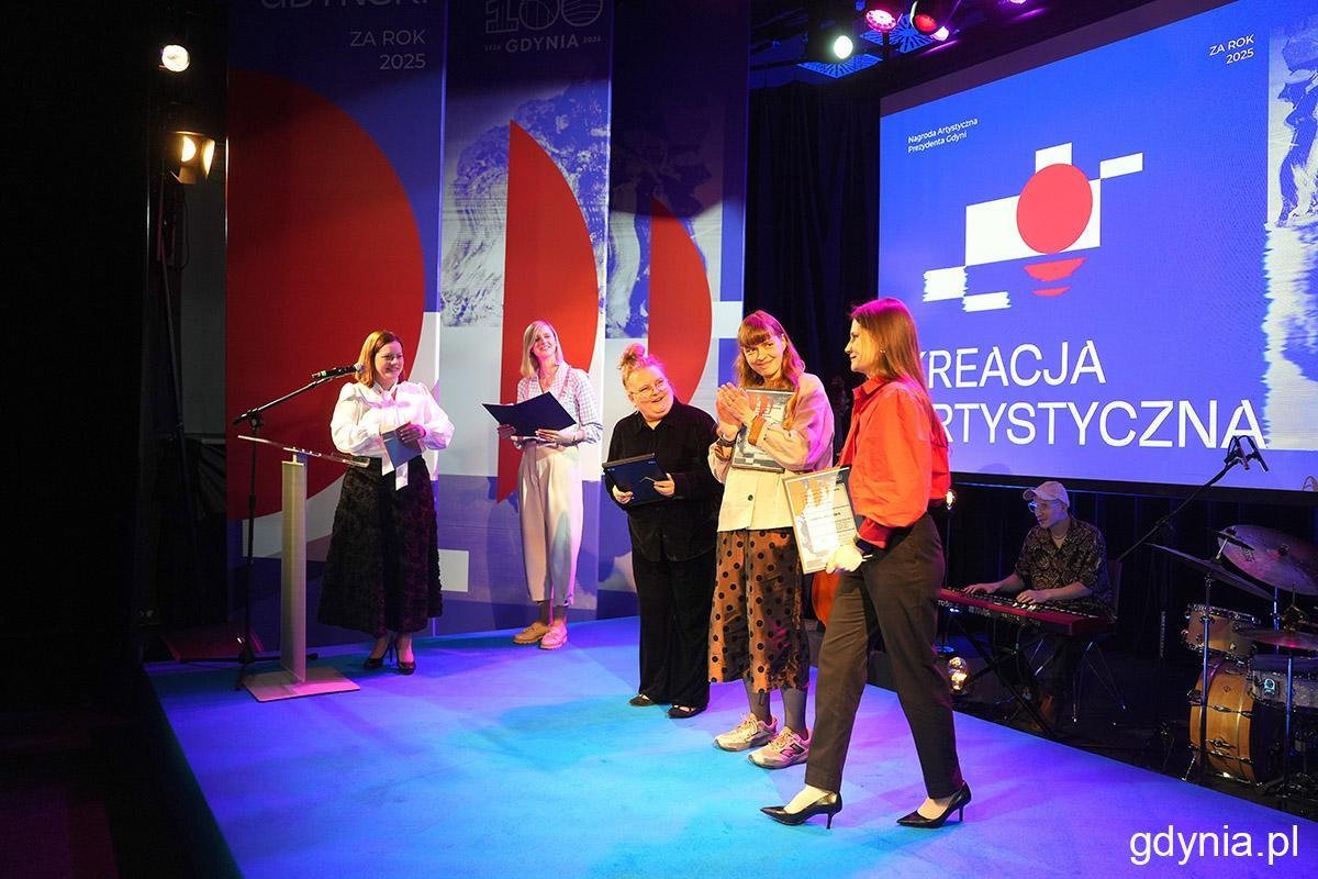 Poznaliśmy laureatów 30. edycji Galionów Gdyńskich. To osoby, które przez ostatni rok wywarły największy wpływ na kształt kultury w naszym mieście. Nagrody i wyróżnienia trafiły do autorów najlepszych kreacji artystycznych, animatorów kultury, debiutantów, mecenasów kultury i artystów z pokaźnym dorobkiem. W poniedziałek, 13 kwietnia w Konsulacie Kultury spotkały się osoby, które na co dzień budują i tworzą gdyńskie środowisko kulturalne. Gala wręczenia Galionów Gdyńskich, czyli nagród artystycznych prezydent Gdyni, to okazja do podsumowania dorobku ostatnich miesięcy wśród lokalnych twórców, artystów, stowarzyszeń, instytucji i organizacji.Wśród gości na widowni pojawili się również: prezydent Gdyni Aleksandra Kosiorek, dyrektor zarządzający ds. kultury i aktywności mieszkańców Mariusz Bzdęga, radni miasta: Dominik Aziewicz, Larysa Kramin, Joanna Zielińska i Agnieszka Tokarska.Wszyscy nominowani odebrali z rąk prezydent Gdyni pamiątkowe dyplomy, a laureaci – statuetki zaprojektowane przez Marka Habrata. Galę prowadziła Małgorzata Piontke, a o oprawę muzyczną zadbał zespół Dead Vistula. Wideo i montaż: Przemysław Dopke Za nami 30. jubileuszowa gala wręczenia Nagród Prezydenta Miasta Gdyni Galionów Gdyńskich, czyli nagród w różnych kategoriach kulturalnych. Laureatów z poprzednich edycji jest aż 126. To ogromna porcja porządnej, gdyńskiej, inspirującej kultury, więc warto zapoznać się z dorobkiem każdej z tych osób. Wszystkim nominowanym i laureatom serdecznie gratuluję. No i cóż, czekamy na więcej wydarzeń, więcej sztuki i inspiracji – podkreśla Aleksandra Kosiorek, prezydent Gdyni.Rok 2026 to rok ważnych decyzji dla kultury. Między innymi uruchomiliśmy Gdyński Fundusz Filmowy, Stypendia Artystyczne Prezydent Miasta Gdyni. Wraca do nas Festiwal R@Port, który będzie realizowany przez Teatr Miejski. Przyszłość naszego miasta to przyszłość kultury, a oczywiście kultury nie byłoby bez naszych wspaniałych artystów, bez środowisk artystycznych, które dzisiaj mieliśmy okazję uhonorować – dodaje Mariusz Bzdęga, dyrektor zarządzający ds. kultury i aktywności mieszkańców Urzędu Miasta Gdyni. Galiony Gdyńskie przyznawane są w czterech kategoriach: „Kreacja artystyczna” – dla gdyńskich twórców lub artystów prezentujących swoje dokonania w Gdyni, „Animacja kultury” – dla animatorów organizujących życie kulturalne w mieście, „Debiut artystyczny” – dla artystów debiutujących w roku ubiegłym, „Mecenat kultury” – wyróżnienie za wspieranie rozwoju kultury w mieście. O tym, do kogo trafiły tegoroczne Galiony Gdyńskie zdecydowała kapituła w składzie: Tadeusz Szemiot, przewodniczący Rady Miast Gdyni, Karin Moder, dyrektor Muzeum Miasta Gdyni, Dominik Aziewicz, radny Gdyni i przewodniczący Komisji Kultury Rady Miasta Gdyni, Maja Wagner, naczelnik Wydziału Kultury Urzędu Miasta Gdyni i przewodnicząca kapituły, Bernadeta Rąbalska z Wydziału Kultury Urzędu Miasta Gdyni oraz przedstawiciele środowisk związanych z działalnością artystyczną: Paulina Pohl-Pluta, Cyprian Ożóg-Orzegowski i Kamil Wicik. Nagrody za 2025 rok otrzymali: Hanna Shumska (artystka sztuk wizualnych) w kategorii „Kreacja artystyczna” – za projekt „Rekonfiguracje”, który w subtelny i introspektywny sposób eksploruje tematy nostalgii oraz pamięci zbiorowej i transformacji tożsamości, w kategorii „Animacja kultury” przyznano dwie równorzędne nagrody: Fundacji Bochińskich – za wybitne osiągnięcia w budowaniu środowiska kultury designu w Gdyni łączące edukację, archiwizację i profesjonalizację młodych twórców oraz Krzysztofowi Dąbrowskiemu – za konsekwentne popularyzowanie muzyki klasycznej i filmowej poprzez festiwal Gdynia Classica Nova oraz cykl Niedziela Melomana i koncerty w ramach projektu Muzyka Promenadowa, Paweł Podolski w kategorii „Debiut artystyczny” – za pełnometrażowy debiut filmowy „Życie dla początkujących”, stanowiący świeżą i odważną interpretację kina gatunkowego, nasyconą gdyńską tożsamością i wrażliwością społeczną, INVEST KOMFORT w kategorii „Mecenat kultury” – za wieloletnie wspieranie kluczowych gdyńskich projektów kulturalnych, w tym umożliwienie realizacji wystawy „Alicja Wyszogrodzka. Polskie Projekty Polscy Projektanci” w Muzeum Miasta Gdyni. Natomiast tegoroczny Galion Gdyński za całokształt twórczości otrzymała Ewa Ignaczak – za długoletni, konsekwentny wkład w rozwój społecznie zaangażowanego i wrażliwego teatru off-owego na terenie Gdyni, jak i całego Pomorza. O nagrodzie Przypomnijmy, że Galion Gdyński przyznawany jest od 1995 roku. Trafia w ręce artystów i działaczy kultury, którzy swoimi osiągnięciami wyróżnili się na tle środowiska gdyńskiego. Nagroda ma uhonorować twórców i zespoły za wkład w rozwój miasta i umożliwianie odbiorcom spotkania się ze sztuką na najwyższym poziomie. Galeria zdjęć Pobierz galerię Prezydent Gdyni Aleksandra Kosiorek podczas gali rozdania Galionów Gdyńskich (fot. Mirosław Pieślak) Pobierz zdjęcie Dyrektor zarządzający ds. kultury i aktywności mieszkańców Mariusz Bzdęga podczas gali rozdania Galionów Gdyńskich (fot. Mirosław Pieślak) Pobierz zdjęcie Nominowani do nagrody w kategorii „Debiut artystyczny”: Michał Cierzniak i Aniela Kucińska oraz laureat Paweł Podolski w towarzystwie prezydent Gdyni Aleksandry Kosiorek (fot. Mirosław Pieślak) Pobierz zdjęcie Reżyser Paweł Podolski, laureat w kategorii „Debiut artystyczny” (fot. Mirosław Pieślak) Pobierz zdjęcie Na scenie m.in. nominowani do nagrody w kategorii „Kreacja artystyczna” oraz laureatka Hanna Shumska w towarzystwie prezydent Gdyni Aleksandry Kosiorek (fot. Mirosław Pieślak) Pobierz zdjęcie Hanna Shumska, laureatka w kategorii „Kreacja artystyczna” (fot. Mirosław Pieślak) Pobierz