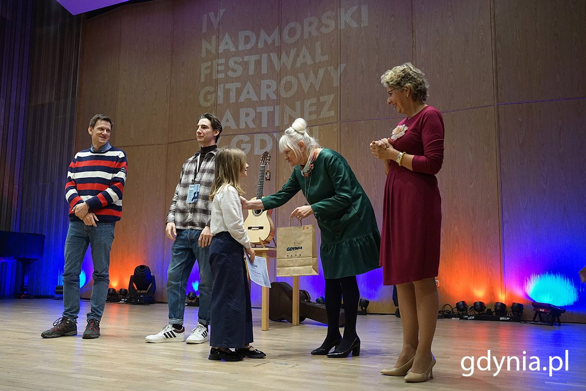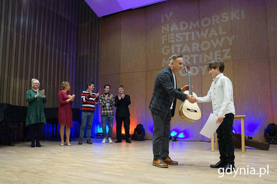 Młodzi, utalentowani, z ogromną pasją do muzyki – tacy są uczestnicy IV Nadmorskiego Festiwalu Gitarowego Martinez. Jury wyłoniło najlepszych gitarzystów młodego pokolenia. Krzysztof Ginelli, Nadia Czerska, Maksymilian Śliwiński, Izabela Maciaszczyk zostali laureatami tegorocznego konkursu. Festiwal Martinez to wydarzenie od lat przyciągające młodych, utalentowanych gitarzystów, którzy są uczniami szkół muzycznych 1 i 2 stopnia. To największy tego rodzaju konkurs skupiający zdolnych muzyków z całej Polski. Festiwal rozpoczął się w czwartek, 7 listopada koncertem „Dos Recuerdos”. Zespół łączy lirykę gitary klasycznej z ognistym brzmieniem flamenco. Festiwal cieszy się dużym zainteresowaniem, tak też w tym roku wpłynęła rekordowa liczba zgłoszeń. W sobotę, 9 listopada jury wyłoniło tegorocznych laureatów. Jurorami konkursu byli wybitni pedagodzy i instrumentaliści: Andrzej Grygier i Marek Pasieczny, pod przewodnictwem Mateusza Kowalskiego – znakomitego gitarzysty młodego pokolenia.Na zdjęciu m.in. Iwona Tanewska, naczelnik edukacji podczas wręczania nagród laureatowi (fot. Mirosław Pieślak)Jury konkursu wyłoniło laureatów IV Nadmorskiego Festiwalu Gitarowego Martinez: Krzysztof Ginelli z Poznańskiej Ogólnokształcącej Szkoły Muzycznej I st. im. H. Wieniawskiego zajął pierwsze miejsce w gr. I. Uczeń kształci się pod okiem Piotra Kosmowskiego. I miejsce ex aequo w gr. II otrzymali: Nadia Czerska uczęszczająca do Państwowego Zespółu Szkół Muzycznych im. A. Rubinsteina w Bydgoszczy zajęła pierwsze miejsce ex aequo w gr. II. Laureatkę przygotowywał Piotr Kaźmierczak. Maksymilian Śliwiński uczeń Poznańskiej Ogólnokształcącej Szkoły Muzycznej I st. nr 1 im. H. Wieniawskiego. Laureat przygotowywał Piotr Kosmowski. I miejsce w gr. III Izabela Maciaszczyk, uczennica Państwowej Ogólnokształcącej Szkoły Muzycznej II st. im. F. Chopina w Krakowie zajęła I miejsce w gr. III. Laureatkę przygotowywała Joanna Baran-Nosiadek. Tegoroczne Grand Prix zdobył Krzysztof Ginelli z Poznańskiej Ogólnokształcącej Szkoły Muzycznej I st. im. H. Wieniawskiego. Laureata przygotował Piotr Kosmowski.Wyróżniony został Tomasz Tamulewicz uczęszczający do Szkoły Muzycznej I i II stopnia im. Z. Noskowskiego w Gdyni, kształcący w klasie Magdaleny Jendy-Kujawy.Konkurs organizowany jest pod honorowym patronatem Prezydenta Miasta Gdyni Aleksandry Kosiorek. Galeria zdjęć Pobierz galerię Laureat festiwalu (fot. Mirosław Pieślak) Pobierz zdjęcie Uczestnik konkursu (fot. Mirosław Pieślak) Pobierz zdjęcie Na zdjęciu: Iwona Tanewska, naczelnik edukacji (fot. Mirosław Pieślak) Pobierz zdjęcie Instrumenty (fot. Mirosław Pieślak) Pobierz zdjęcie Na zdjęciu: Iwona Tanewska, naczelnik edukacji podczas wręczenia nagród (fot. Mirosław Pieślak) Pobierz zdjęcie Uczestniczka konkursu (fot. Mirosław Pieślak) Pobierz zdjęcie Warunki pobierania Wszelkie prawa do zdjęć lub grafik prezentowanych w ramach portalu, należą do Prowadzącego portal lub do podmiotów z nim współpracujących i podlegają ochronie prawnej. Prowadzący portal zezwala na kopiowanie i przedstawianie utworów jedynie w celach niekomercyjnych oraz pod warunkiem zachowania go w oryginalnej postaci i zachowaniem kontekstu tematu, do którego zostało wykorzystaneprzez redakcję gdynia.pl. Opublikowane materiały powinny zawsze zawierać źródło, czyli adres strony www.gdynia.pl. Na publikowanie utworów w innych celach wymagana jest zgoda właściciela strony czyli Prowadzącego portal. Opublikowano: 09.11.2024 19:55 Autor: Magdalena Starnawska (magdalena.starnawska@gdynia.pl) Zmodyfikowano: 09.11.2024 20:13 Zmodyfikował: Magdalena Starnawska