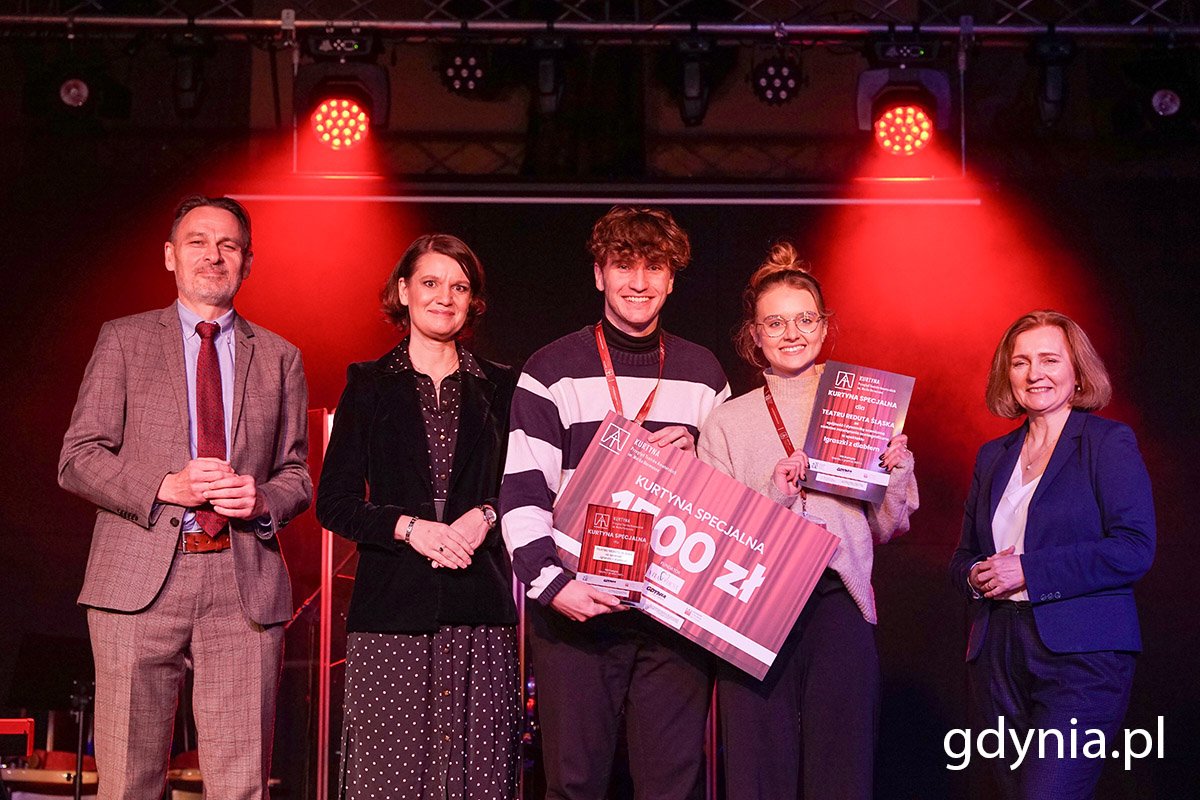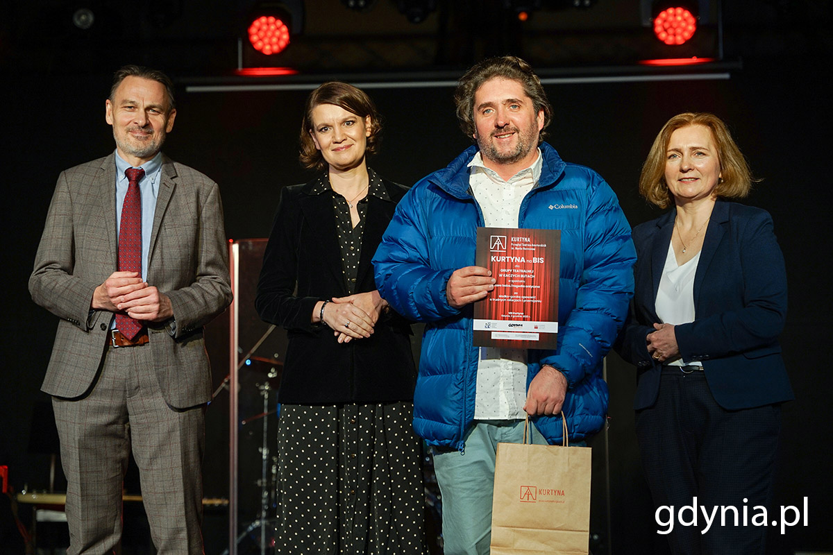 „Istny cyrk” w wykonaniu Grupy „Przebudzeni” z Ostródy nie tylko zachwycił publiczność VIII edycji przeglądu „Kurtyna”, ale również jury. Sztuka, opowiadająca o codzienności osób z niepełnosprawnościami, o przełamywaniu przez nie barier i walce o szczęście, o niezależność, napisana w oparciu o autentyczne przeżycia członków grupy, rozbiła tegoroczny bank „Kurtyny”. VIII edycja „Kurtyny”, czyli Przeglądu Teatrów Amatorskich im. Marka Hermanna w Gdyni Małym Kacku już za nami. Wydarzenie, zorganizowane przez Stowarzyszenie Katolickie Centrum Kultury w Gdyni Małym Kacku, trwało od 26 listopada. Widzowie w tym czasie obejrzeli spektakle szesnastu finalistów. Poziom przedstawień w tym roku był wyjątkowo wysoki. Na to również zwróciła uwagę Katarzyna Gruszecka-Spychała, wiceprezydentka Gdyni ds. gospodarki, członkini jury przeglądu. Finał VIII edycji „Kurtyny” - Przeglądu Teatrów Amatorskich im. Marka Hermanna w Gdyni Małym Kacku. Fot. Mirosław Pieślak - Ta „Kurtyna” była wyjątkowa. Po każdej jestem zachwycona, ale jeszcze po żadnej nie mogłam powiedzieć, że poziom spektakli był aż tak niezmiernie wysoki. Myślę, że również po raz pierwszy mieliśmy do czynienia z tak dużym zróżnicowaniem i to bardzo dobrze wróży temu przeglądowi. On pewnie długo zachowa w nazwie amatorski, bo taka jest przecież jego idea, ale sam przegląd staje się coraz bardziej profesjonalny. Ja jestem niezwykle dumna z tego, że taka impreza ma miejsce w Gdyni i oczywiście cieszę się, że nie tylko my, gdynianie, ją doceniamy, ale także zdobywa bardzo prestiżowe nagrody – powiedziała nam Katarzyna Gruszecka-Spychała. Tegoroczna „Kurtyna” zachwyciła Jak powiedział Jarosław Szydłak, Prezes Stowarzyszenia Katolickie Centrum Kultury w Gdyni Małym Kacku, organizator przeglądu, w tym roku poprzeczka została ustawiona wyjątkowo wysoko. Miało to związek z przyznaniem krótko przed festiwalem nagrody Prezydenta RP „Dla dobra wspólnego”. Finał VIII edycji „Kurtyny” - Przeglądu Teatrów Amatorskich im. Marka Hermanna w Gdyni Małym Kacku. Na zdj. m.in. Katarzyna Gruszecka-Spychała, wiceprezydentka Gdyni ds. gospodarki. Fot. Mirosław Pieślak - Za nami finał VIII „Kurtyny”, niezwykłej, bo była odpowiedzią na poprzeczkę, która została nam tuż przed „Kurtyną” postawiona, kiedy odbieraliśmy nagrodę Prezydenta RP „Dla dobra wspólnego”. Takie nagrody są wyzwaniem, podniesieniem poprzeczki. Tegoroczna „Kurtyna” przez grupy, które zakwalifikowały się do finału, temu zadaniu sprostała – podkreślił Jarosław Szydłak. Finał VIII edycji „Kurtyny” - Przeglądu Teatrów Amatorskich im. Marka Hermanna w Gdyni Małym Kacku. Fot. Mirosław Pieślak Dodał, że to nie był festiwal, w którym po dwóch czy trzech spektaklach można było typować, kto wygra, kto nie. - O wygranej zdecydowały detale. Tegoroczny festiwal był niesamowity pod względem choćby takiej atmosfery relacji międzyludzkich. Wielu przyjaciół odwiedziło Kurtynę, również odwiedził nas prezydent Wojciech Szczurek, który w tygodniu, między obowiązkami, wpadł do nas. Wierzymy, że IX jeszcze nie, ale X edycja „Kurtyny” może już wyjdzie z murów kościelnych i odbędzie się ona w Katolickim Centrum Kultury, którego budowa trwa w Centrum Nowej Kultury. Marzymy dalej, idziemy do przodu – zapowiedział Jarosław Szydłak. Wielki sobotni finał Finałowy tydzień zakończył się w sobotę, 2 grudnia. Uroczystej gali rozdania nagród towarzyszyła oprawa artystyczna studentów Państwowego Policealnego Studium Wokalno-Aktorskiego im. D. Baduszkowej w Gdyni. Wśród gości gali byli m.in. Katarzyna Gruszecka-Spychała wiceprezydent Gdyni i Wojciech Kaczmarczyk, Dyrektor Narodowego Instytutu Wolności, którzy skierowali słowa uznania do tegorocznych laureatów oraz pogratulowali organizatorom ósmej już edycji przeglądu. W tym roku na zwycięzców czekały nagrody o łącznej wartości 24 tys. zł. Pięć „Kurtyn Specjalnych” – każda o wartości 1,5 tys. zł - trafiło do: Teatru Reduta Śląska z Chorzowa, Teatru Krzesiwo z Warszawy, Grupy Teatralnej Bez Przesady z Ostródy, Teatru w Sadzie z Kowali koło Gdańska, Zespołu Niepospolite Ruszenie z Tuchlina. Jury wyróżniło również Pawła Zaufala i Tadeusza Wojciaszka z Teatru Ubogich z Katowic – dwóch indywidualistów współtworzących spektakl „Zbrodnia i Kara”. Laueraci VIII edycji „Kurtyny”. Fot. Mirosław Pieślak Gdyńska Kurtyna dla teatru z Łap „Gdyńska Kurtyna” o wartości 3 tys. zł, ufundowana przez prezydenta Gdyni Wojciecha Szczurka trafiła do Teatru Kaprys z Łap. Natomiast „Kurtyna medialna”, przyznawana od kilku lat przez Ekipę Medialną, trafiła do Alicji Wojnarowskiej. Finałowa trójka „Brązowa Kurtyna” o wartości 2 tys. zł, ufundowana przez Franciszkański Sekretariat Misyjny z Gdyni trafiła do Grupy Teatralnej w Kaczych Butach. Natomiast ze „Srebrną Kurtyną” o wartości 3 tys. zł, ufundowaną przez Narodowy Instytut Wolności Centrum Rozwoju Społeczeństwa Obywatelskiego, wyjechała z Gdyni Alicja Wojnarowska z Dębicy. Laueraci VIII edycji „Kurtyny”. Fot. Mirosław Pieślak Teatr „Przebudzeni” zwycięzcą VIII „Kurtyny” Zwycięzcą VIII edycji „Kurtyny” i zdobywcą „Złotej Kurtyny” 2023 o wartości 5 tys. zł, ufundowanej przez Alicję i Jarosława Biereckich został Teatr "Przebudzeni" z Ostródy za spektakl pt. „Istny Cyrk”. Laueraci VIII edycji „Kurtyny”. Fot. Mirosław Pieślak Nie tylko jury przyznawało nagrody, ale również widzowie. To oni właśnie zdecydowali o jednej z nagród - „Kurtynie Publiczności” o wartości 1 tys. zł, sponsorowanej przez Stowarzyszenie KACK Mały Kack - dla Teatru Reduta Śląska z Chorzowa. Dodatkowo, jeden z widzów ufundował dwie nagrody pn. „Nagroda Jednego Widza”, dla Teatru Kaprys z Łap