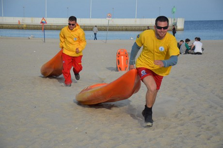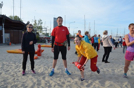 Na plaży uczestnicy Gdyńskiego Poruszenia mogli na własnej skórze poznać trud ratowniczej codzienności. Prowadzący przygotowali serię nietypowych ćwiczeń z wykorzystaniem różnych rekwizytów niezbędnych w fachu ratownika. Były więc specjalne łódki, deski, liny i wiele, wiele innych. Nie zabrakło odrobiny sportowej rywalizacji, jednak całości przyświecał jeden cel - dobrze się bawić. I zadanie to zrealizowano w 100%. Warto dodać, że przez cały czas trwania rozgrzewki wyspecjalizowany ratownik opowiadał o różnych interesujących kwestiach związanych z ratownictwem wodnym, więc spotkanie miało też walor edukacyjny.