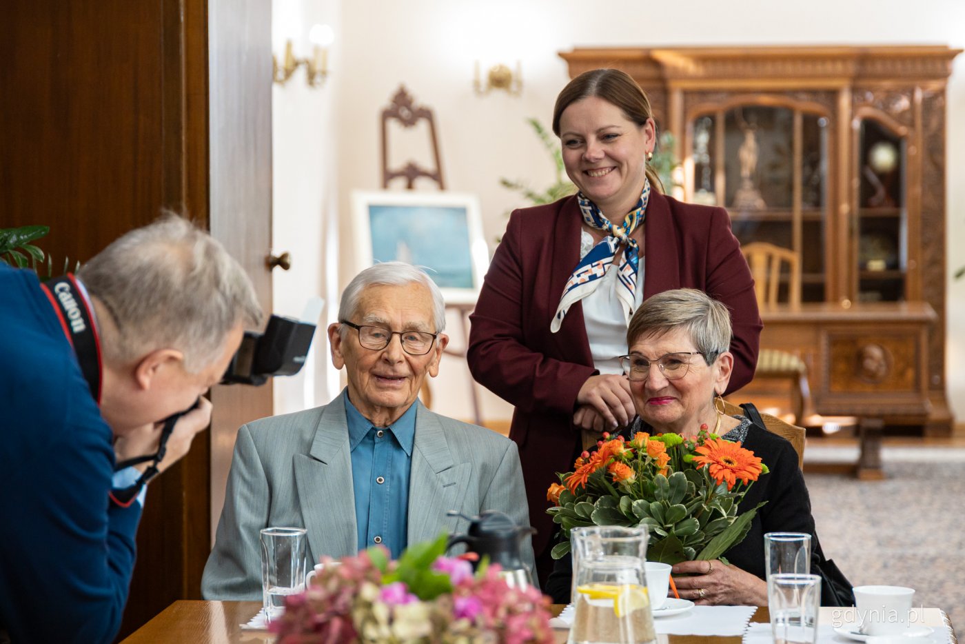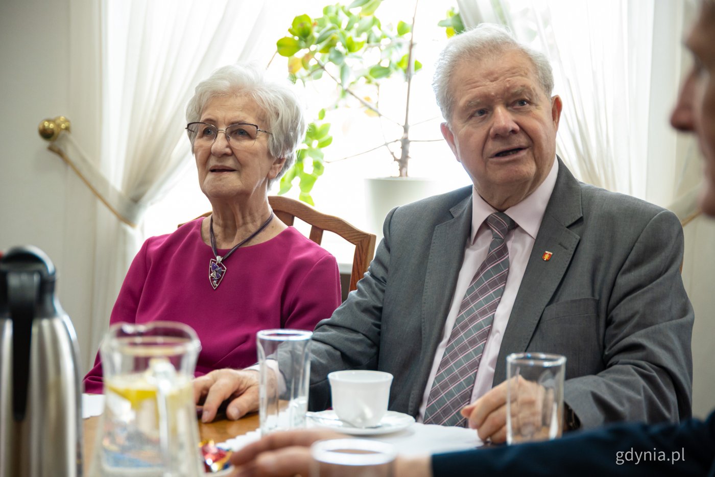 Ponad sześć dekad wspólnej codzienności, troski, radości i przezwyciężania trudności – takie historie napisały pary małżeńskie, które spotkały się z prezydent Gdyni Aleksandrą Kosiorek. W ciepłej, rodzinnej atmosferze uczczono ich niezwykłe jubileusze, pełne wzruszeń i wdzięczności. W Urzędzie Stanu Cywilnego w Gdyni odbyło się wyjątkowe spotkanie z okazji jubileuszu długoletniego pożycia małżeńskiego. Na zaproszenie prezydent Aleksandry Kosiorek przybyły trzy pary świętujące 60-lecie małżeństwa oraz jedna para z imponującym stażem 65 lat. W wydarzeniu uczestniczyły również rodziny i najbliżsi jubilatów. Wśród uhonorowanych znaleźli się: Zuzanna i Bogumił Dzióbkowie – 60-lecie małżeństwa, Regina i Józef Lisowscy – 60-lecie małżeństwa, Joanna i Edmund Piórowie – 60-lecie małżeństwa, Barbara i Mieczysław Steinkowie – 65-lecie małżeństwa. Prezydent Gdyni, Aleksandra Kosiorek oraz naczelnik Urzędu Stanu Cywilnego w Gdyni, Inocenta Nycz powitały jubilatów oraz ich bliskich, wręczyły kwiaty, dyplomy oraz upominki. Serdecznie gratuluję tak imponującego jubileuszu. To jest niesamowite – z drugą osobą przez całe życie iść ramię w ramię. Wiem, że była to podróż ekscytująca, która trwa i będzie trwać, ale wiem też, że nie brakowało trudności. Cieszę się, że Państwo z uśmiechem je przetrwali i dzięki temu dziś możecie dzielić się swoim doświadczeniem. Będziemy mieli co przekazywać naszym dzieciom i wnukom – receptę na długie pożycie i sukces– mówiła prezydent Aleksandra Kosiorek. Prezydent Gdyni Aleksandra Kosiorek oraz naczelnik Urzędu Stanu Cywilnego Inocenta Nycz (fot. Kamil Złoch)Po części oficjalnej wszyscy zasiedli przy wspólnym stole. Wśród rozmów i wspomnień jubilaci zdradzali swoją receptę na długie i szczęśliwe małżeństwo. Podkreślali, że kluczem jest bycie drużyną, troska o siebie nawzajem, nieustanne patrzenie w tym samym kierunku i to, by nawet w trudnych chwilach złapać się za rękę i razem iść do przodu, bo partnera nie można tracić z oczu. Ich słowa i życiowe doświadczenia są piękną lekcją dla młodszych pokoleń – dowodem, że miłość, szacunek i wsparcie mogą prowadzić przez całe życie, a ich wartość warto przekazywać dzieciom, wnukom i kolejnym pokoleniom. Galeria zdjęć Pobierz galerię Jubilaci obchodzący 60. rocznicę pożycia małżeńskiego (fot. Kamil Złoch ) Pobierz zdjęcie Prezydent Gdyni Aleksandra Kosiorek z jubilatami, obchodzącymi 60 rocznicę pożycia małżeńskiego (fot. Kamil Zoch) Pobierz zdjęcie Prezydent Gdyni Aleksandra Kosiorek wręczyła wszystkim świętującym parom kwiaty oraz upominki (fot. Kamil Zoch) Pobierz zdjęcie Prezydent Gdyni Aleksandra Kosiorek z jubilatami obchodzącymi 65 rocznice pożycia małżeńskiego (fot. Kamil Zoch) Pobierz zdjęcie Warunki pobierania Wszelkie prawa do zdjęć lub grafik prezentowanych w ramach portalu, należą do Prowadzącego portal lub do podmiotów z nim współpracujących i podlegają ochronie prawnej. Prowadzący portal zezwala na kopiowanie i przedstawianie utworów jedynie w celach niekomercyjnych oraz pod warunkiem zachowania go w oryginalnej postaci i zachowaniem kontekstu tematu, do którego zostało wykorzystaneprzez redakcję gdynia.pl. Opublikowane materiały powinny zawsze zawierać źródło, czyli adres strony www.gdynia.pl. Na publikowanie utworów w innych celach wymagana jest zgoda właściciela strony czyli Prowadzącego portal. Opublikowano: 20.10.2025 16:30 Autor: Zofia Marczak (zofia.marczak@gdynia.pl)
