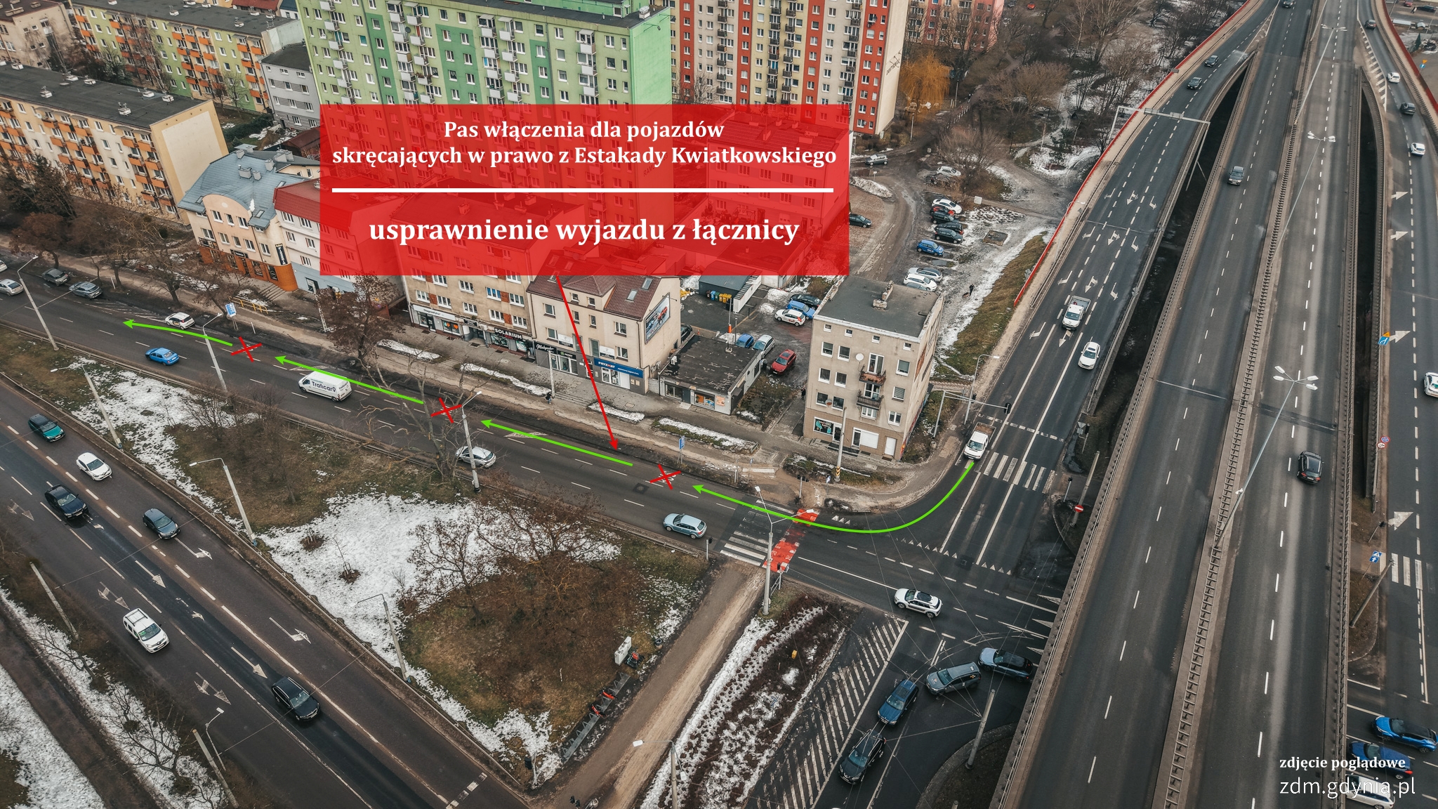 20 marca o godz. 20:00 zamknięty zostanie główny ciąg Estakady Kwiatkowskiego w rejonie węzła Kwiatkowskiego-Hutnicza. Zgodnie z projektem remontu jest to konieczne do przeprowadzenia prac przy przegubie P-31 – elemencie konstrukcyjnym, którego stan techniczny zakwalifikowano jako awaryjny. Zmiany obowiązywać będą do końca czerwca. Przypomnijmy: podczas przeglądów technicznych wykryto poważne uszkodzenia elementów nośnych w rejonie przegubu P-31. Stwierdzono spękania wsporników, na których oparte są łożyska przęseł, zarysowania powierzchni bocznych i spodnich, wykwity wapienne oraz miejscową korozję zbrojenia. Część pęknięć sięga w głąb konstrukcji.W listopadzie 2025 roku pod estakadą zamontowano systemowe podpory stalowe, które odciążyły uszkodzony fragment i umożliwiały bezpieczne utrzymanie ruchu, również pojazdów ciężarowych – przy ograniczeniu prędkości do 30 km/h. Było to działanie zabezpieczające. Teraz konieczna jest naprawa konstrukcji. Podpory zamontowane w listopadzie zabezpieczyły konstrukcję, ale to działanie doraźne. Element pracuje w stanie awaryjnym i wymaga ingerencji konstrukcyjnej. Tych prac nie da się prowadzić bez zamykania obiektu – nie ma tu półśrodków – mówi Michał Felon, dyrektor Zarządu Dróg Miejskich w Gdyni. – Zamknięcie estakady pozwala wykonać naprawę kompleksowo, razem z wymianą dylatacji, zamiast wracać do tego miejsca w kolejnych latach. Co obejmie remont Remont dotyczy elementu konstrukcyjnego pracującego w stanie awaryjnym. Prace obejmą m.in. rozbiórkę uszkodzonych wsporników w rejonie oparcia łożysk oraz odtworzenie elementów betonowych i montaż nowych łożysk. Wymieniona zostanie także zużyta dylatacja, a w jej miejscu pojawi się nowa dylatacja palczasta. Roboty przewidują również wykonanie systemu odwodnienia, odbudowę kap chodnikowych i pasów rozdziału oraz odtworzenie izolacji i warstw bitumicznych. Roboty prowadzone będą z zachowaniem technologii betonowania i wymaganych czasów wiązania materiałów. Tego procesu nie da się bezpiecznie skrócić.Szacowany koszt remontu to około 2,2 mln zł. Od 20 marca wieczorem – całkowite zamknięcie głównego ciągu Schemat organizacji ruchu po zamknięciu głównego ciągu Estakady Kwiatkowskiego (fot. Marcin Mielewski / Zarząd Dróg Miejskich)Od 20 marca, od godz. 20:00: ruch głównym ciągiem estakady w rejonie węzła Kwiatkowskiego-Hutnicza zostanie całkowicie wyłączony, cały ruch zostanie skierowany na łącznice przy ul. Hutniczej, pod estakadą ruch będzie utrzymany z ograniczeniami prędkości, podczas montażu i demontażu podpór będą chwilowe zatrzymania ruchu na ul. Osada Kolejowa. Z analiz systemu TRISTAR wynika, że w godzinach szczytu estakadą przejeżdża nawet 2500 pojazdów na godzinę w jednym kierunku i ponad 2000 w przeciwnym. Skierowanie tak dużego ruchu na łącznice i skrzyżowanie z ul. Hutniczą oznacza większe utrudnienia i korki dla kierowców – niezależnie od zmian w organizacji ruchuZarząd Dróg Miejskich w Gdyno apeluje do kierowców o rozsądne planowanie podróży i wcześniejsze zapoznanie się z utrudnieniami. Z łącznic powinny korzystać wyłącznie pojazdy, które rzeczywiście muszą wjechać lub zjechać w tym rejonie. Ruch tranzytowy powinien wybierać alternatywne trasy.Wprowadzone zostaną również zmiany poprawiające przepustowość: zjazd z estakady dwoma pasami w obu kierunkach (obecnie odbywa się jednym pasem w każdym kierunku), zmiana układu relacji na wlocie łącznicy od strony ul. Morskiej – lewy pas do jazdy w lewo i na wprost, prawy wyłącznie na wprost, umożliwienie jednoczesnego przejazdu obu łącznic poprzez zmianę programu sygnalizacji świetlnej. Mimo tych działań należy liczyć się z poważnymi utrudnieniami, szczególnie w porannym szczycie komunikacyjnym.Sytuacja będzie monitorowana na bieżąco, a programy sygnalizacji świetlnej będą korygowane w zależności od natężenia ruchu.Estakada Kwiatkowskiego (fot. Marcin Mielewski) Współpraca z sąsiednimi samorządami Przedstawiciele Gdyni, Rumi i gminy Kosakowo podczas spotkania dotyczącego organizacji ruchu w czasie remontu Estakady Kwiatkowskiego (fot. Marcin Mielewski / Zarząd Dróg Miejskich)O planowanym remoncie i zmianach w organizacji ruchu poinformowano samorządy w Rumi oraz gminie Kosakowo. Podczas wspólnego spotkania z Zarządem Dróg Miejskich omówiono skalę utrudnień, kluczowe miejsca ustawienia tablic informujących o remoncie oraz możliwe objazdy. Celem jest dotarcie z informacją do jak największej liczby kierowców jeszcze przed wjazdem do Gdyni oraz rozłożenie ruchu na drogi alternatywne w sposób ograniczający zatory w newralgicznych punktach. Dodatkowe zmiany jeszcze przed zamknięciem Jeszcze przed zamknięciem głównego ciągu, w dniach 9-13 marca, wprowadzone zostaną zmiany organizacyjne.Estakada Kwiatkowskiego (fot. Marcin Mielewski / Zarząd Dróg Miejskich)Za odcinkiem leśnym, aż do końca Estakady Kwiatkowskiego obowiązywać będzie prędkość 50 km/h.Decyzja wynika z potrzeby poprawy bezpieczeństwa i ochrony konstrukcji. Dodatkowo przeprowadzone pomiary hałasu wykazały przekroczenia dopuszczalnych norm w rejonie ul. Stoigniewa i Dantyszka.Dotychczasowe oznakowanie dopuszczające 70 km/h zostanie zdemontowane. Zmiany na zjeździe do ul. Morskiej Estakada Kwiatkowskiego (fot. Marcin Mielewski / Zarząd Dróg Miejskich)Likwidacja odcinka buspasa na ul. Morskiej, za estakadą w kierunku Chyloni, przyniesie zmiany dla kierowców zjeżdżających z Estakady Kwiatkowskiego. Skręcający w prawo zyskają tam pas włączenia, który pozwoli płynniej włączać się do ruchu podczas nadawania sygnału S-2, czyli tzw. zielonej strzałki. Rozwiązanie ma usprawnić rozładowywanie kolejki pojazdów tworzącej się na łącznicy zjazdowej.Po zamknięciu głównego ciągu cały ruch zostanie skierowany na łącznice, dlat