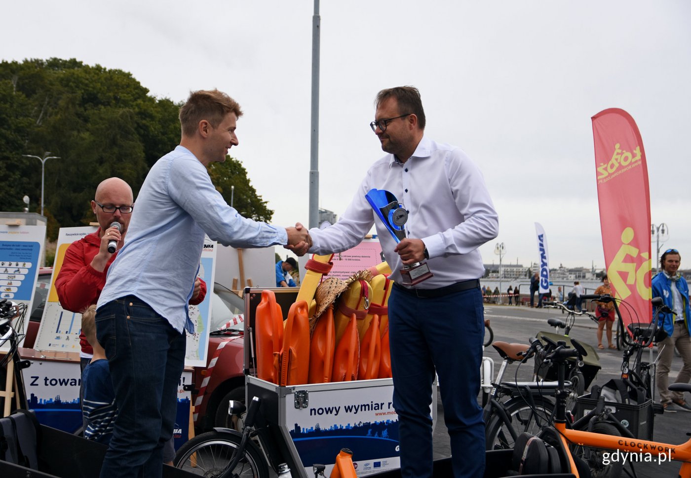 Pokazują, że tak naprawdę nie ma rzeczy, których nie da się zrobić przy pomocy roweru - od mobilnego hydraulika, przez transporter dla dzieci aż po skrzynie do przewożenia towarów, domowych zwierząt czy produktów z własnej działalności gospodarczej. Do Gdyni ściągnęli miłośnicy rowerów towarowych z całej Polski i nie tylko. Trwa już piąta edycja Ogólnopolskiego Zlotu Rowerów Towarowych!Ich widok na ulicach powoli przestaje już zadziwiać gdynian, bo od kilku miesięcy rowery towarowe działają w praktyce – zarówno na potrzeby miejskich instytucji, jak i prywatnych przedsiębiorców. Są impulsem, który może zmienić podejście do mobilności w mieście i oprócz Gdyni ich potencjał zauważyły też inne polskie miasta. Tzw. cargo bike’i z całego kraju zjechały na weekend do Gdyni, a ich właściciele i fani uczestniczą w Ogólnopolskim Zlocie Rowerów Towarowych. W sobotę, pierwszego dnia zlotu wszyscy spotkali się na Skwerze Arki Gdynia.- Mamy gości z całej Polski, ale też z zagranicy, chociażby z Bremy, z polskich miast Warszawa, Łódź, Lublin, Kraków czy Katowice. Bardzo dużo osób, które są zainteresowane i już jeżdżą rowerami cargo, przywieźli też swoje, więc można pojeździć na różnych pojazdach. W Gdyni też mamy 12 „swoich”, służbowych rowerów, można wszystkie z nich przetestować - mówi Alicja Pawłowska z Referatu Projektów Unijnych i Zarządzania Mobilnością gdyńskiego Urzędu Miasta. - Jest bardzo dużo rodzajów rowerów cargo. Są przeznaczone do przewożenia ładunków, mogą to być zarówno towary, jak i osoby, są też takie, które dostosowano np. do przewożenia zwierząt – wymienia. Jeden z głównych celów zlotu to promowanie nowego środka transportu, który przełamuje stereotypy i udowadnia, że nie ma rzeczy, których… nie można zrobić na rowerze. To zarówno gotowe konstrukcje dużych producentów, ale też częściowe samodzielne przeróbki, które pozwalają przystosować rowery do codziennych potrzeb. W Gdyni pojawiło się kilkadziesiąt różnych pojazdów, niekiedy bardzo różnych od tych, które już od kilku miesięcy poruszają się po mieście.- Rowery towarowe już zmieniły nasze życie, korzystają z nich firmy. To rowery ekologiczne, bardzo szybkie i pakowne, a przede wszystkim wszędzie dojadą. To powoduje, że jako miasto bardzo mocno będziemy promować ten środek lokomocji – mówi Marek Łucyk, wiceprezydent Gdyni ds. rozwoju. - Bardzo lekko się jeździ, mamy tzw. dopalacz, czyli silnik elektryczny, co powoduje, że żadna górka nie jest przeszkodą. Tak samo przy zapakowaniu dużej ilości rzeczy, chociażby książek, bo rowerów używa też nasza biblioteka, powoduje, że jest to czysta przyjemność – dodaje wiceprezydent.- Rowery pokazują, że jest inna możliwość na mobilność. To już nie tylko rekreacja czy transport z domu do pracy i szkoły, ale również transport towarowy. To coś, co w wielu głowach jest nie do pomyślenia, a jednak można. Są rowery dostosowane do przewozu większych rzeczy, cięższych gabarytów, kilkorga dzieci. Rower to znakomity środek transportu w mieście, nie tylko pod względem korzyści finansowych, ale i zdrowotnych. Nie stoimy w korku, nie tracimy czasu, nie zanieczyszczamy powietrza, nie generujemy hałasu – podkreśla Jakub Furkal, pełnomocnik prezydenta Gdyni ds. komunikacji rowerowej.W Gdyni już wkrótce jazdy rowerami towarowymi będą mogli spróbować także wszyscy mieszkańcy.- W ciągu miesiąca chcemy uruchomić wypożyczalnię dla mieszkańców. Obecnie wypożyczalnia działa dla gdyńskich przedsiębiorców i cieszy się dużym zainteresowaniem. Mieszkańcy też już czekają, zgłaszają się do nas i są zainteresowani wypróbowaniem rowerów, szczególnie osoby, które chcą dowozić dzieci do szkoły i przedszkoli. Wypożyczalnię uruchomimy w ramach unijnego projektu City Changer Cargo Bike. W ramach projektu udało nam się także zakupić dwa dodatkowe rowery Urban Arrow. Sama je testowałam i są naprawdę wygodne, a dla dzieci to dodatkowa atrakcja – mówi Alicja Pawłowska z Referatu Projektów Unijnych i Zarządzania Mobilnością.W ramach pierwszego dnia Ogólnopolskiego Zlotu Rowerów Towarowych w Gdyni można było skorzystać z testów rowerów, zapoznać się także z tzw. handbike’ami oraz poznać więcej szczegółów dotyczących unijnych projektów. Była też bardziej aktywna część zlotu, w której rowery cargo sprawdziły się w wyścigach ze sprzętem ratowniczym na pokładzie. Na koniec pierwszego dnia uczestnicy wzięli udział we wspólnym przejeździe rowerowym ze Skweru Arki Gdynia, przez Orłowo do woonerfu na ulicy Abrahama.Na niedzielę, drugi dzień zlotu zaplanowano część warsztatową dla uczestników. W gdyńskim InfoBoksie będą dyskutować m.in. na temat obszarów rozwoju wykorzystania rowerów towarowych w Polsce czy dobrych praktykach z polskich miast połączonych ze zwiększaniem świadomości społecznej na temat rowerów cargo. Galeria zdjęć Pobierz galerię Ogólnopolski Zlot Rowerów Towarowych w Gdyni, fot. Kamil Złoch Pobierz zdjęcie Ogólnopolski Zlot Rowerów Towarowych w Gdyni, fot. Kamil Złoch Pobierz zdjęcie Ogólnopolski Zlot Rowerów Towarowych w Gdyni, fot. Kamil Złoch Pobierz zdjęcie Ogólnopolski Zlot Rowerów Towarowych w Gdyni, fot. Kamil Złoch Pobierz zdjęcie Ogólnopolski Zlot Rowerów Towarowych w Gdyni, fot. Kamil Złoch Pobierz zdjęcie Ogólnopolski Zlot Rowerów Towarowych w Gdyni, fot. Kamil Złoch Pobierz zdjęcie Ogólnopolski Zlot Rowerów Towarowych w Gdyni, fot. Kamil Złoch Pobierz zdjęcie Ogólnopolski Zlot Rowerów Towarowych w Gdyni, fot. Kamil Złoch Pobierz zdjęcie Ogólnopolski Zlot Rowerów Towarowych w Gdyni, fot. Kamil Złoch Pobierz zdjęcie Ogólnopolski Zlot Rowerów Towarowych w Gdyni, fot. Kamil Złoch Pobierz zdjęcie Ogólnopolski Zlot Rowerów Towarowych w Gdyni, fot. Kamil Złoc