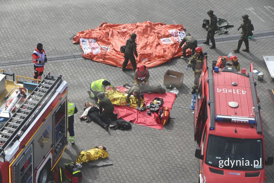 Gasili płonący samochód, neutralizowali skażenie chlorem i prowadzili działania zabezpieczające w Publicznym Terminalu Portowym. Przedstawiciele jedenastu służb i instytucji 10 kwietnia br. wzięli udział w ćwiczeniach „Wspólny Patrol 25”. „Wspólny Patrol 25” to ćwiczenia służb organizowane przez wojsko. Są to różnego rodzaju epizody, które odbywają się w całej Polsce. W Gdyni ma miejsce epizod chemiczny, a w pozostałych częściach Polski równolegle w różnych dniach odbywają się inne, m.in. z zagrożeniami biologicznymi, radiacyjnymi oraz chemicznymi innego rodzaju – mówił st. kpt. Mateusz Szultka, dowódca Jednostki Ratowniczo-Gaśniczej nr 1 w Gdyni Śródmieściu oraz Specjalistycznej Grupy Ratownictwa Chemiczno-Ekologicznego przy Komendzie Miejskiej PSP w Gdyni. Ćwiczenia Krajowego Systemu Wykrywania Skażeń i Alarmowania „Wspólny Patrol 25” odbyły się równocześnie w całym województwie pomorskim i poświęcone były działaniom w przypadku wystąpienia zagrożenia skażeniami chemicznymi, biologicznymi czy też promieniotwórczymi. Ich celem było doskonalenie procedur dotyczących uruchamiania poszczególnych systemów KSWSiA. Gdyńska część ćwiczeń, czyli epizod praktyczny w Publicznym Terminalu Promowym, obejmowała postępowanie w przypadku skażenia chlorem. Dzisiejsze ćwiczenia mają przede wszystkim pomóc nam w doskonaleniu reagowania na sytuacje kryzysowe. Trenujemy przede wszystkim reagowanie i współdziałanie służb, służb administracji publicznej, samorządowych, jak również z Państwowej Straży Pożarnej, Policji, wszystkich praktycznie straży i inspekcji, które działają podczas zdarzeń kryzysowych – mówił Robert Ronduda, naczelnik Wydziału Zarządzania Kryzysowego i Ochrony Ludności UM Gdyni. Zgodnie ze scenariuszem pozorowanego zdarzenia w wyniku kolizji dwóch pojazdów, w tym jednego przewożącego pojemniki z chlorem, z jednego z pojemników zaczął się wydostawać gaz. Służby przy użyciu syren ogłosiły stan zagrożenia, a następnie przystąpiono do zabezpieczania terenu, ewakuacji okolicznych budynków oraz usuwania niebezpiecznej substancji. Na koniec, znów przy użyciu syren, odwołano zagrożenie. Podczas epizodu przećwiczono wiele procedur, takich jak udzielenie pomocy osobom poszkodowanym w wypadku, usunięcie skażenia chlorem przez przygotowanych do tego ratowników, dekontaminacja sprzętu użytego do akcji i uczestniczącego w niej personelu, zabezpieczenie miejsca zdarzenia oraz ewakuacja osób w jego otoczeniu. W ćwiczenia zaangażowane były: Centralny Ośrodek Analizy Skażeń w Warszawie, Pomorski Urząd Wojewódzki w Gdańsku, Zarząd Morskiego Portu Gdynia S.A., Urząd Morski w Gdyni, Urząd Miasta Gdyni, Komenda Wojewódzka Państwowej Straży Pożarnej w Gdańsku, Komenda Miejska Państwowej Straży Pożarnej w Gdyni, 7. Pomorska Brygada Obrony Terytorialnej, Wojewódzki Inspektorat Ochrony Środowiska w Gdańsku, Komenda Miejska Policji w Gdyni, Komenda Straży Miejskiej w Gdyni. Odbywające się na Pomorzu ćwiczenia to element większych manewrów, obejmujących swoim zasięgiem całą Polskę. Ich organizacja jest efektem współpracy wielu instytucji rządowych i samorządowych, a także służb z całego kraju. Ćwiczenia „Wspólny Patrol” odbywają się co 3 lata i skupiają się przede wszystkim na postępowaniu wobec zagrożeń biologicznych, radiacyjnych i chemicznych. Obecna edycja zaplanowana była na wrzesień 2024 r., ale została przesunięta na kwiecień 2025 r. z uwagi na wrześniową powódź na południu Polski. Galeria zdjęć Pobierz galerię Przygotowanie miejsca zdarzenia do ćwiczeń (fot. Jakub Winiewski) Pobierz zdjęcie Strażacy gaszący płonący samochód osobowy (fot. Jakub Winiewski) Pobierz zdjęcie Strażacy niosący kukłę imitującą poszkodowanego kierowcę samochodu osobowego (fot. Jakub Winiewski) Pobierz zdjęcie Policja zabezpieczająca drogę w pobliżu miejsca zdarzenia (fot. Jakub Winiewski) Pobierz zdjęcie Samochody Inspekcji Ochrony Środowiska (fot. Jakub Winiewski) Pobierz zdjęcie Strażacy przygotowujący miejsce do udzielenia pomocy poszkodowanym oraz żołnierze zabezpieczający akcję (fot. Jakub Winiewski) Pobierz zdjęcie Żołnierze pomagali strażakom w przygotowaniu miejsca do udzielenia pomocy poszkodowanym (fot. Jakub Winiewski) Pobierz zdjęcie Strażacy przygotowujący komorę do dekontaminacji dla ratowników neutralizujących chlor (fot. Jakub Winiewski) Pobierz zdjęcie Późna faza ćwiczeń, widoczny polowy punkt udzielania pomocy medycznej oraz autobus do ewakuacji osób przebywających w miejscu zdarzenia (fot. Jakub Winiewski) Pobierz zdjęcie Warunki pobierania Wszelkie prawa do zdjęć lub grafik prezentowanych w ramach portalu, należą do Prowadzącego portal lub do podmiotów z nim współpracujących i podlegają ochronie prawnej. Prowadzący portal zezwala na kopiowanie i przedstawianie utworów jedynie w celach niekomercyjnych oraz pod warunkiem zachowania go w oryginalnej postaci i zachowaniem kontekstu tematu, do którego zostało wykorzystaneprzez redakcję gdynia.pl. Opublikowane materiały powinny zawsze zawierać źródło, czyli adres strony www.gdynia.pl. Na publikowanie utworów w innych celach wymagana jest zgoda właściciela strony czyli Prowadzącego portal. Opublikowano: 10.04.2025 16:00 Autor: Jakub Winiewski (jakub.winiewski@gdynia.pl) Zmodyfikowano: 14.04.2025 10:31 Zmodyfikował: Paweł Jałoszewski