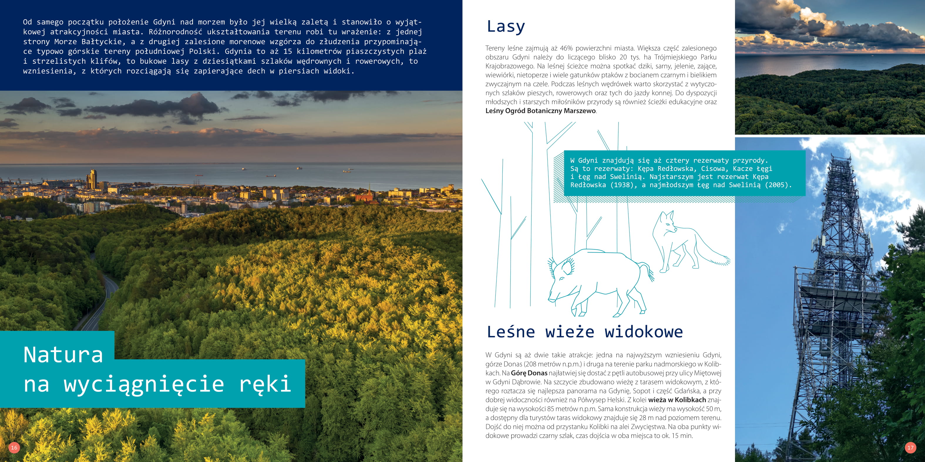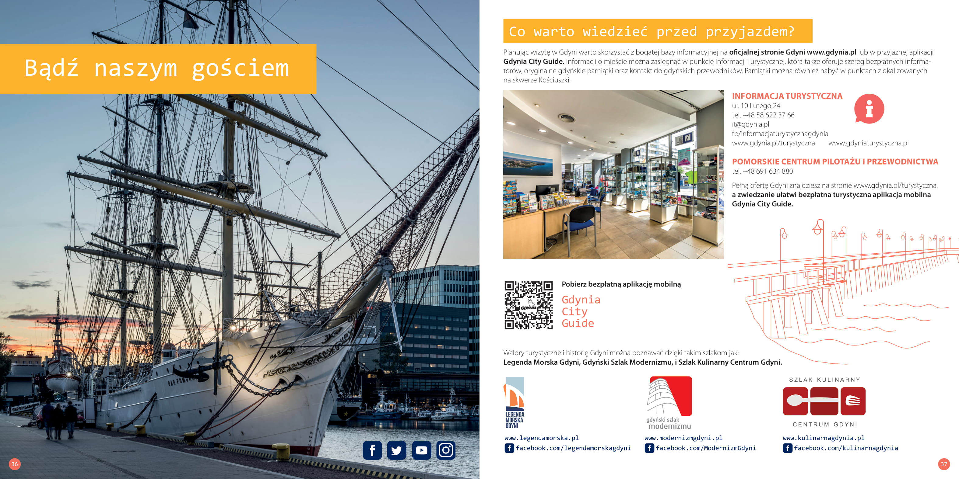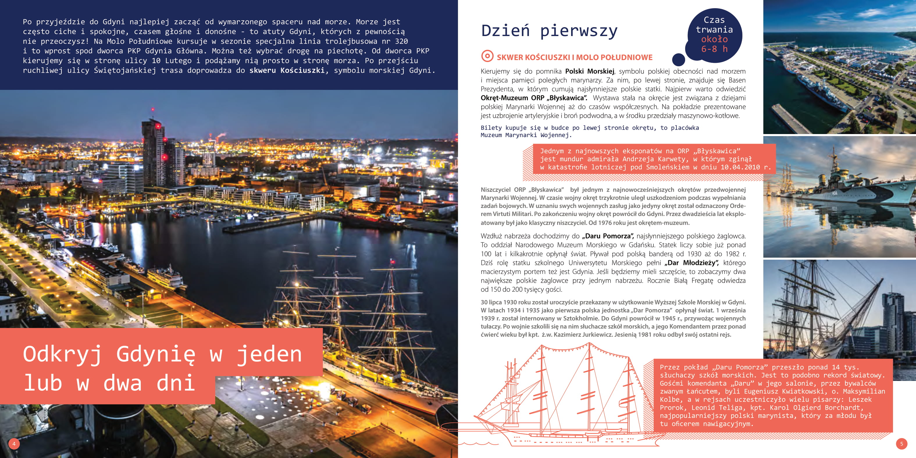 Jakie są największe atrakcje Gdyni? Czy da się ją zwiedzić w jeden lub dwa dni? Jakie lokalne wydarzenia warto zapisać sobie w kalendarzu? Nowy „Przewodnik po Gdyni” to prawdziwe kompendium wiedzy, nie tylko dla turystów! Tegoroczny „Przewodnik po Gdyni” to kolejne opracowanie w ramach serii nowych wydawnictw promujących miasto. Publikacja została przygotowana w języku polskim i angielskim. Jest dostępna w dwóch wersjach interaktywnych: na urządzenia mobilne oraz w wersji desktop (do wyświetlania na ekranie komputera). Klikając wybrany odnośnik, czytelnik przeniesie się bezpośrednio na stronę www, profil na Facebooku czy miejsce w Google Maps.Elektroniczna forma przewodnika to jednak nie wszystko. Wkrótce zostanie wydana również jego drukowana wersja. Będzie ona liczyć 84 strony. - „Przewodnik po Gdyni” to kolejna pozycja z nowej serii wydawnictw promujących miasto. Polecamy w nim największe gdyńskie atrakcje, ale też mniej znane symbole morskiej Gdyni i mnóstwo ciekawostek, które pozwolą spojrzeć na miasto świeżym okiem. Nie mogło zabraknąć informacji o kaszubskich korzeniach Gdyni i o okrętach na lądzie, czyli perłach gdyńskiego modernizmu. Gdynia to także kilometry pięknych, piaszczystych plaż oraz wspaniałe tereny leśne, które stanowią 46% jej powierzchni, i aż cztery rezerwaty przyrody, dlatego w sposób szczególny zachęcamy do aktywnego korzystania ze ścieżek edukacyjnych, wytyczonych szlaków pieszych i rowerowych czy odwiedzenia Leśnego Ogrodu Botanicznego w Marszewie - mówi Katarzyna Gruszecka-Spychała, wiceprezydent Gdyni ds. gospodarki. Poczuj smak szczęścia! Z przewodnika warto skorzystać zarówno wtedy, gdy Gdynię odwiedzamy tylko podczas weekendu ("Odkryj Gdynię w jeden lub w dwa dni"), jak i wtedy, gdy zdecydujemy się pozostać w mieście z morza i z marzeń na dłużej. To kompletny poradnik, dzięki któremu możemy poznać najciekawsze lokalne atrakcje, wydarzenia, ludzi oraz miejsca. Gdynia - tu chce się żyć! Dowiedz się, dlaczego gdynianie są najbardziej zadowoleni z miasta, w którym żyją! Gdynia to miasto dla wszystkich. Swoje miejsce znajdą tu zarówno rodziny z dziećmi, jak i osoby starsze, mające problemy z poruszaniem się czy z niepełnosprawnościami. Natura na wyciągnięcie ręki Dzięki swojemu położeniu Gdynia jest miastem wyjątkowo atrakcyjnym zarówno dla miłośników piaszczystych plaż, strzelistych klifów, jak i leśnych szlaków wędrownych i rowerowych. Różnorodne ukształtowanie terenu sprawia, że z jednej strony mieszkańcy mają dostęp do Morza Bałtyckiego, a z drugiej - do morenowych wzniesień, które do złudzenia przypominają te z typowo górskich terenów na południu Polski. Bądź naszym gościem Na szczególną uwagę odwiedzających Gdynię zasługuje rozdział „Bądź naszym gościem”. Co warto wiedzieć jeszcze przed przyjazdem? Jak dojechać do Gdyni i jak się po niej przemieszczać? Gdzie się zatrzymać? A gdzie wybrać się na zakupy? Na wszystkie te pytania mamy gotową odpowiedź. Przewodnik po Gdyni. Spis treści: Odkryj Gdynię w jeden lub w dwa dni (s. 4) TOP 12. Wybrane atrakcje Gdyni (s. 9) Zapisz w kalendarzu (s. 12) Natura na wyciągnięcie ręki (s. 16) Miejsca ze smakiem (s. 19) Ludzie i miejsca (s. 23) Po pierwsze – jakość życia (s. 27) Tu się robi biznes (s. 32) Bądź naszym gościem (s. 36) Mapa - TOP 12 (s. 40) /storage/uzytkownicy/p.jaloszewski@gdynia.pl/2021/2021-03-03 Poczuj smak szczescia/PrzewodnikGdynia_Desktop PL 05-03-2021 v1.pdf Do pobrania Przewodnik po Gdyni - PL - wersja DESKTOP pdf11647kb Przewodnik po Gdyni - PL - wersja MOBILE pdf11737kb Przewodnik po Gdyni - PL pdf36704kb Gdynia City Guide - EN - DESKTOP pdf11677kb Gdynia City Guide - EN - MOBILE pdf11775kb Gdynia City Guide - EN pdf36699kb Opublikowano: 18.03.2021 10:17 Autor: Paweł Jałoszewski (pawel.jaloszewski@gdynia.pl) Zmodyfikowano: 14.05.2021 14:49 Zmodyfikował: Paweł Jałoszewski