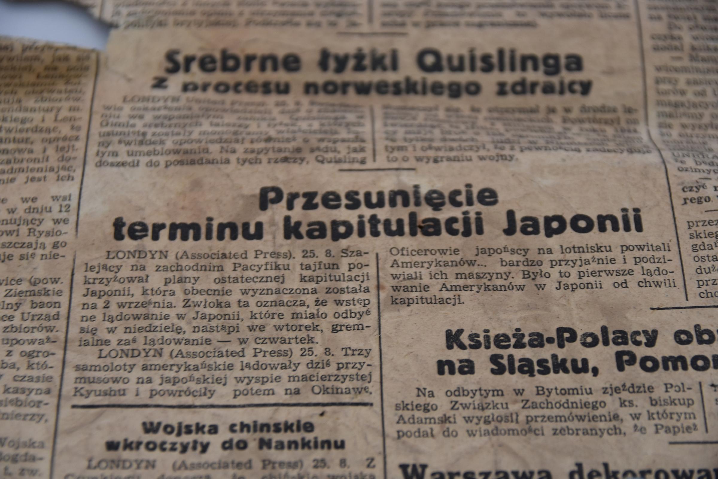 Ciekawego znaleziska dokonali pracownicy magistratu wykonujący prace konserwatorskie w budynku Urzędu Miasta Gdyni. W jednym z pokojów, pod warstwą tynku, wepchnięty jako wypełniacz pustej przestrzeni przy framudze, tkwił prawdziwy prasowy wehikuł czasu.- To gazety wydane w pierwszych dniach i miesiącach po zakończeniu wojny. „Dziennik Bałtycki”, „Gazeta Pomorska”, a nawet taki periodyk jak „Gazeta Armii Czerwonej”. Kopalnia wiedzy o tym, czym żyli nasi ojcowie i dziadowie w ’45 roku ubiegłego wieku – mówi Jerzy Zając, dyrektor urzędu, do którego, jako słynącego z zamiłowania do pamiątek historii, pracownicy niezwłocznie pożółkłe papiery przynieśli.Gazety odnalezione w ścianie nie są w najlepszym stanie, jednak czytać się dają. Ale jeśli wziąć pod uwagę, ile czasu przeleżały wciśnięte pod framugę, nie ma co narzekać. Kruchość kartek i rudy odcień dodają tylko uroku poszukiwaniom przeszłych dni gdynian.Artykuły pierwszej potrzeby dla ludności pracującej„Artykuły UNRRA na rynku” – donosi „Dziennik Bałtycki” z 26 sierpnia 1945 roku. Ponieważ w sklepach ukazały się artykuły z transportu UNRRA – niewielka ilość luksusowych (wedle autora tekstu) artykułów takich jak np. śliwki kalifornijskie, pasztety, konserwy rybne, kawa prasowana itp., Ministerstwa Aprowizacji i Handlu wyjaśnia: „ze względu na zbyt wysoką cenę w stosunku do ich wartości odżywczej i ze względu na ograniczoną ich ilość nie zostały przeznaczone do podziału systemem kartkowym dla ludności pracującej, a dochód z ich sprzedaży zostanie przeznaczony na zakup artykułów pierwszej potrzeby, jakie zostaną przydzielone ludności pracującej na zasadzie systemu kartkowego”. No bo przecież – pasztet czy ryba w puszce? Po co drażnić niepotrzebnie podniebienie „pustą kalorią”, lepiej poprzestać na margarynie i marmoladzie z buraków. Dziś dietetycy mogliby mieć zgoła odmienne zdanie.„Dziennik Bałtycki” w sierpniu 1945 roku pisał m.in. o tym jak marszałek Rokossowski występował przeciw bezprawiu, informując, że nakazuje on natychmiast zwrócić zabrane ludności polskiej podczas przemarszu wojsk Armii Czerwonej i Wojska Polskiego zbiory oraz inwentarz żywy i martwy. Zabory takie, jak przytacza gazeta, miały miejsce m.in. w majątku Kowal gm. Łostowice, gdzie żołnierze rozkazem dowódcy jednostki za niepobieranie warzyw dla kasyna we Wrzeszczu, mieli być karani."Dziennik Bałtycki", wydanie z 1945 roku, fot. Michał Kowalski Informacje ze świataCo w tym czasie działo się na świecie? „Dziennik Bałtycki” pisze m.in. o srebrnych łyżkach Quislinga „z procesu norweskiego zdrajcy”, które zostały odnalezione wraz ze srebrnymi talerzami w jego majątku z usuniętymi monogramami właścicieli, o przesunięciu kapitulacji Japonii i o księżach Polakach, którzy obsadzą diecezje na Śląsku, Pomorzu i w Prusach. A także o niemieckich uczonych i technikach w Ameryce – ci, którzy pracowali przy niemieckich projektach wojennych zostali wezwani do kontynuowania prac w Stanach Zjednoczonych. Jak skończą, mają wrócić do Niemiec. Ci pracujący nad bronią jądrową, jak podkreśla gazeta, nie będą mieli dostępu do osiągnięć amerykańskich naukowców.Wrześniowy (13 września 1945) numer „Dziennika Bałtyckiego” również sporo miejsca poświęca temu, co słychać w świecie szerokim. Pisze o tajnych obradach pięciu w Londynie objętych całkowitą blokadą informacji, o kłopotach mieszkaniowych Leopolda - króla belgijskiego, który miał na wygnaniu zająć dom wypoczynkowy pod Genewą, a mieszkańcy nie chcą na to pozwolić i o słusznym rozkazie brytyjskiej kwatery głównej RAF, która zakazała swoim żołnierzom ustępowania chodnika żołnierzom Wehrmachtu. Dowiadujemy się też o amerykańskich próbach wykorzystania napędu atomowego w lokomotywach oraz, wcale nie większym drukiem, na dole strony o kapitulacji Japonii na południowym wschodzie i w Indiach.Oprócz tego, w wydaniu mamy obszerny wywiad z komandorem Józefem Poznańskim, dyrektorem Głównego Urzędu Morskiego, w którym jawi nam się obraz polskich portów tuż po wojnie. „Wszystko trzeba było zaczynać od nowa, a raczej gorzej niż od nowa, gdyż trzeba było usunąć gruzy, wraki i zniszczenia, zanim można było w ogóle zacząć organizować i odbudowywać.” – mówi dyrektor w wywiadzie. – „Żadnej jednostki pływającej, żadnego magazynu czy budynku administracyjnego zdatnych do natychmiastowego użytku. Wszędzie góry śmiecia i zwały zamrożonego sprzętu, który naniosła zawierucha działań wojennych, jakie przeszły przez nasze porty”. Czytamy też, że nasze huty pracują deficytowo i o problemach z białym chlebem na kartki: „Rozważana jest zmiana systemu wypieku chleba kartkowego, nie odpowiadającego potrzebom i życzeniom ludności. Znaczna część chleba zawiera bezwartościowe domieszki. Ministerstwo zamierza przejść na wypiek chleba białego pytlowego o 70 zamiast 96 procent przemiału mąki”. Gazeta podaje również, że w takim wypadku cena chleba miała by być wyższa, a przydziały niższe. Ale są też dobre informacje jak powrót z ZSRR 1700 internowanych za udział w akcjach AK. Dziennik pisze, że transport przybył już do kraju, a internowani zostaną objęci dekretem o amnestii. Palaczom będzie się żyło lepiej „W ramach umowy handlowej polsko-radzieckiej Polski Monopol Tytoniowy otrzyma ze Związku Radzieckiego 3 miliony kg surowca, w zamian za towary dostarczane przez Polskę.” – pisze „Wolna Polska. Gazeta Armii Czerwonej dla ludności Polski” z piątku 31 sierpnia 1945 roku. Zdaniem autora dzięki umowie: „głód tytoniowy załagodzony będzie w ciągu najbliższych dwóch miesięcy, dzięki otrzymanym surowcom i krajowym zbiorom, które dadzą około 8 milionów kg surowca”. Poprawi się też jakość, a ceny spadną. Produkcja