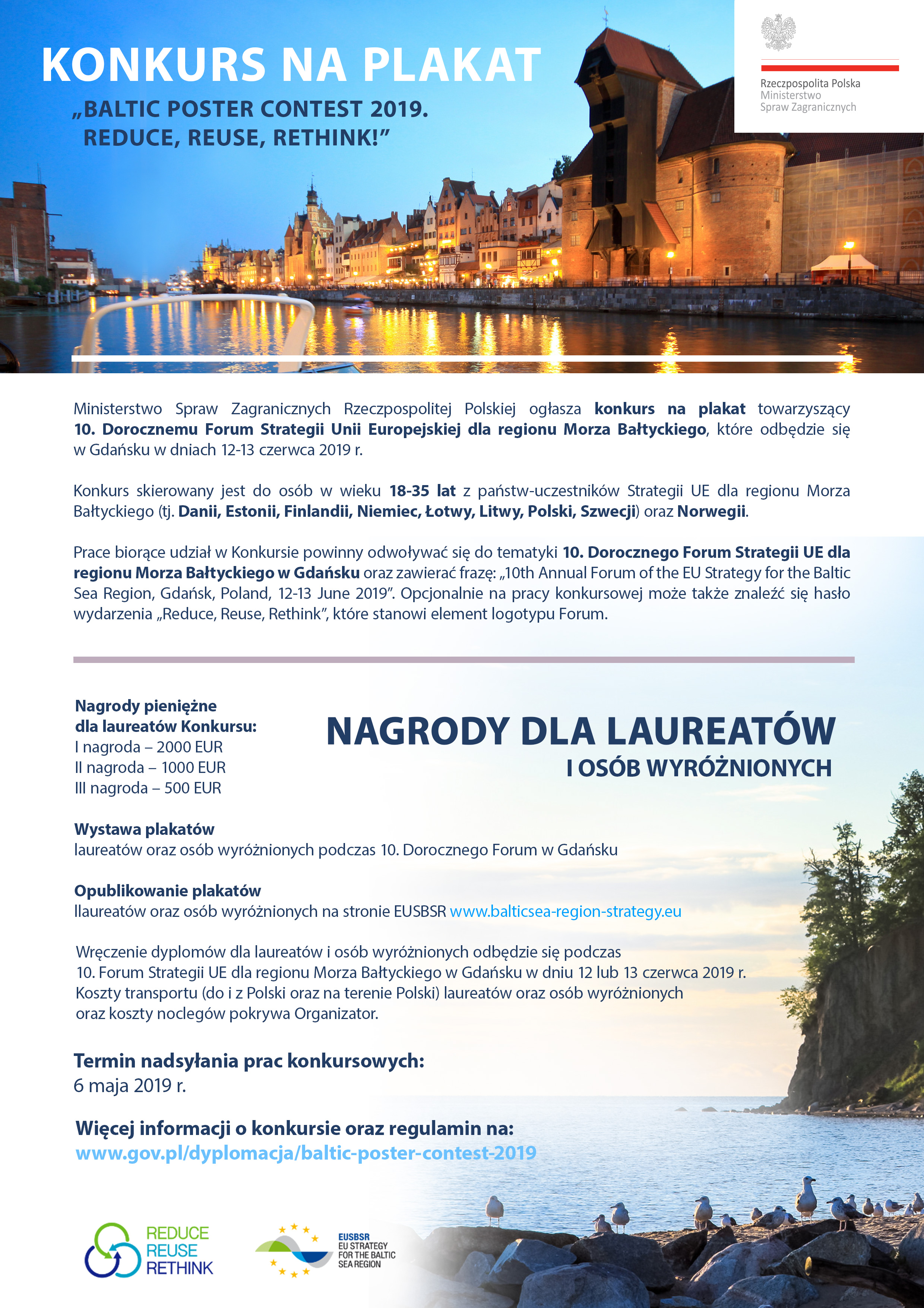 Polska będzie gospodarzem 10. Forum Strategii Unii Europejskiej dla regionu Morza Bałtyckiego. W tym roku odbędzie się ono 12 i 13 czerwca w Gdańsku. Z tej okazji Ministerstwo Spraw Zagranicznych organizuje międzynarodowy konkurs na stworzenie plakatu towarzyszącego i promującego to wydarzenie. Ma on nawiązywać do tematyki forum. Jest o co walczyć, bo autorzy najlepszych prac otrzymają nagrody pieniężne. Zdobywca pierwszego miejsca dostanie 2 tysiące euro. Zgłoszenia do konkursu „Baltic Poster Contest 2019. Reduce, Reuse, Rethink!” można przesyłać do 6 maja. Strategia Unii Europejskiej dla regionu Morza Bałtyckiego powstała w 2009 roku. Jest nią objętych osiem państw członkowskich Unii Europejskiej: Dania, Estonia, Finlandia, Niemcy, Łotwa, Litwa, Polska oraz Szwecja. Jej główny cel to zacieśnianie współpracy w regionie Morza Bałtyckiego oraz podjęcie wspólnych działań na rzecz ochrony środowiska, zwiększania dobrobytu w regionie oraz wzmocnienie połączeń infrastrukturalnych. Każdego roku organizowane jest wspólne forum strategii. Uczestniczy w nim około 1000 osób zaangażowanych we współpracę w regionie Morza Bałtyckiego: przedstawiciele rządów państw członkowskich, agencji rządowych, organizacji pozarządowych, instytutów badawczych, ośrodków akademickich, organizacji międzynarodowych oraz środowisk biznesowych. Tym razem spotkanie odbędzie się w Polsce. 10. edycję Forum Strategii Unii Europejskiej dla regionu Morza Bałtyckiego zaplanowano 12 i 13 czerwca w Gdańsku. Głównym tematem rozmów będzie gospodarka obiegu zamkniętego oraz gospodarka współdzielenia w kontekście wyzwań demograficznych i środowiskowych w regionie Morza Bałtyckiego. Forum organizują: Urząd Marszałkowski Województwa Pomorskiego oraz Baltic Sea States Subregional Co-operation pod przewodnictwem Norwegii, we współpracy z Ministerstwem Spraw Zagranicznych RP oraz Komisją Europejską. Z okazji tego wydarzenia Ministerstwo Spraw Zagranicznych ogłosiło konkurs na plakat bałtycki, który będzie promował Forum. Ma on charakter międzynarodowy. A to dlatego, że mogą wziąć w nim udział osoby, w wieku od 18 do 35 lat, z Polski, Danii, Estonii, Finlandii, Niemiec, Łotwy, Litwy, Szwecji (tj. z państw należących do Strategii UE dla regionu Morza Bałtyckiego) oraz Norwegii.Zasady konkursu są proste. Wystarczy stworzyć plakat, który będzie nawiązywał do tematyki Forum. Praca musi być wykonana samodzielnie przez osobę zgłaszającą się do konkursu. Na plakacie powinna znaleźć się fraza: „10th Annual Forum of the EU Strategy for the Baltic Sea Region, Gdańsk, Poland, 12-13 June 2019”. Zamiast tego można także użyć hasła: „Reduce, Reuse, Rethink”, które stanowi element logotypu Forum.Każdy uczestnik może zgłosić maksymalnie trzy prace. Należy przesyłać tylko takie projekty, których nigdzie wcześniej nie publikowano i nie były zgłaszane do jakiegokolwiek innego konkursu.Prace konkursowe można przesyłać do 6 maja na adres mailowy: ddpk.sekretariat@msz.gov.pl. Plakat musi mieć 70 cm szerokości i 100 cm wysokości. Gotowy projekt należy zapisać w pliku jpg, w rozdzielczości 72 dpi i przestrzeni barwnej CMYK. Jeśli rozmiar pliku przekracza 10 MB, praca powinna zostać przesłana przez WeTransfer. W mailu zgłoszeniowym, oprócz pracy konkursowej, trzeba również załączyć skany oświadczeń oraz wypełnionego i podpisanego formularza zgłoszeniowego (wszystkie pliki oraz regulamin konkursu do ściągnięcia poniżej).Nadesłane prace oceni Komisja Konkursowa złożona z ekspertów z zakresu sztuk pięknych oraz przedstawicieli organizatora, czyli Ministerstwa Spraw Zagranicznych. Oceni ona czytelność komunikatu, walory estetyczne i kompozycyjne każdego projektu. Jurorzy wyłonią 3 laureatów konkursu. Przyznają też maksymalnie 7 wyróżnień. Lista zwycięzców zostanie ogłoszona najpóźniej 15 maja. Wyniki konkursu będą opublikowane na stronie internetowej Ministerstwa Spraw Zagranicznych, na oficjalnej stronie Strategii UE dla regionu Morza Bałtyckiego: https://www.balticsea-region-strategy.eu/ oraz na stronie 10. Dorocznego Forum https://strategyforum2019.eu/. Jest o co walczyć. Autor najlepszego plakatu otrzyma 2 tysiące euro. Zdobywca drugiego miejsca dostanie tysiąc euro. Natomiast nagroda za trzecią lokatę wynosi 500 euro. Dodatkowo zwycięskie oraz wyróżnione prace będzie można zobaczyć na specjalnej wystawie podczas 10. Forum Strategii UE dla regionu Morza Bałtyckiego w Gdańsku. Zostaną też opublikowane na stronie https://www.balticsea-region-strategy.eu/. Do pobrania Regulamin konkursu „Baltic Poster Contest 2019. Reduce, Reuse, Rethink!” pdf510kb Formularz zgłoszeniowy do konkursu pdf149kb Oświadczenie uczestnika pdf146kb Oświadczenie dotyczące praw autorskich pdf145kb Opublikowano: 23.04.2019 08:12 Autor: Magdalena Czernek (magdalena.czernek@gdynia.pl) Zmodyfikowano: 23.04.2019 08:24 Zmodyfikował: Agnieszka Janowicz