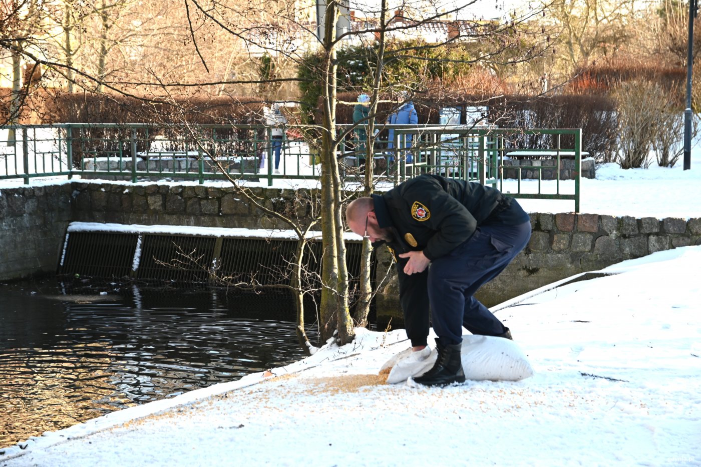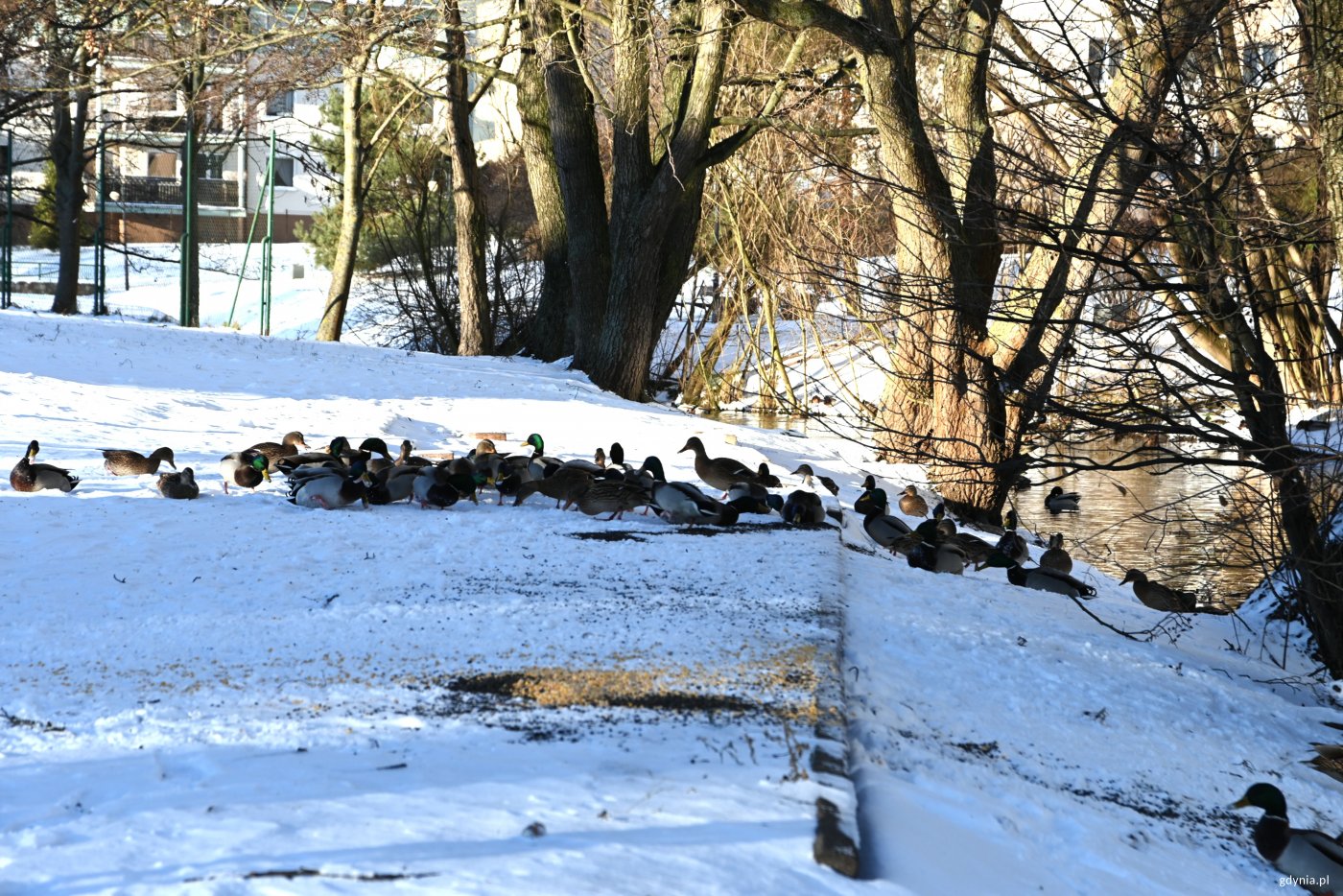 Mroźna i śnieżna zima to dla Ekopatrolu Straży Miejskiej w Gdyni czas intensywnej pracy. Strażnicy codziennie dokarmiają zwierzęta i obserwują te, które w poszukiwaniu pożywienia przybywają do miasta. Tej zimy w lasach w pobliżu Wiczlina i Marszewa pojawiły się wilki. Wilki to nowi goście w tym sezonie w Gdyni. Pierwszego osobnika tego gatunku zarejestrowała fotopułapka w lesie w okolicach ulicy Marszewskiej, niedługo później kolejna, tym razem w lasach w pobliżu Wiczlina. To fotopułapki Straży Miejskiej, które monitorują zdarzenia w lasach na terenie Gdyni – opowiada Leonard Wawrzyniak, rzecznik prasowy Straży Miejskiej w Gdyni. – Wilki zaobserwowaliśmy w końcówce ubiegłego roku, one dość szybko się przemieszczają, być może są już daleko. Wilki w Gdyni się zdarzają coraz częściej, ale to nic dziwnego, ponieważ populacja tych drapieżników rośnie w całej Polsce. Wilki, wbrew mitom, nie polują na ludzi, są dość ostrożne i wolą trzymać się w lesie. W Gdyni, ze względu na jej unikatowe położenie, na terenach leśnych i nadmorskich żyje wiele gatunków dzikich zwierząt. Niektóre, gdy spadnie dużo śniegu i obniży się temperatura, potrzebują wsparcia. Wśród nich są na przykład łabędzie, które ze względu na łagodne zimy coraz częściej nie odlatują do ciepłych krajów; kaczki, które szczególnie upodobały sobie gdyńskie zbiorniki wodne oraz mniejsze ptaki, którym w mieście trudniej znaleźć sobie pożywienie zimą. To z myślą o nich Ekopatrol każdego roku zamawia kilkanaście worków zboża i kukurydzy. W tym roku przygotowaliśmy trzynaście worków i już rozpoczęliśmy dokarmianie ptaków wodnych – dodaje Leonard Wawrzyniak. – Jeszcze niedawno mieliśmy karmniki w stałych miejscach, ale zrezygnowaliśmy z nich ze względu na dziki. Teraz rozsypujemy ziarno bezpośrednio na plaży, na bulwarze, w pobliżu zbiorników w Parku Kilońskim i, gdy jest taka potrzeba, na Dąbrowie. Ptaki szybko przyzwyczajają się do nas i biegną nam na przywitanie. Niezwykle ważne jest, aby nie dokarmiać ptaków chlebem, który szybko pleśnieje i jest dla nich niebezpieczny. W tym roku na szczęście nie musieliśmy jeszcze leczyć łabędzi zatrutych chlebem, ale w ubiegłych latach to się zdarzało. Łabędziom nie jest łatwo przetrwać mroźną zimę bez pomocy ludzi. Ostatnio jeden z przedstawicieli tego gatunku, znacznie większy niż popularne łabędzie nieme, łabędź krzykliwy wylądował zmęczony w jednym z przydomowych ogródków i nie miał wystarczająco dużo miejsca, aby wziąć rozbieg i polecieć dalej. To była trudna interwencja, ze względu na jego rozmiary i znaczną siłę – wspomina strażnik. – Udało nam się go odłowić i przetransportować w miejsce, w którym mógł rozwinąć skrzydła i odlecieć. Problemy mają również bociany, które zdecydowały się zostać w Polsce i którym trudno przezimować bez pomocy ludzi. W tym roku jest ich nieco mniej, ale mamy informacje o bocianie, który nie odleciał, a próbuje przezimować na Wiczlinie. Nie udało nam się go jednak namierzyć, co może oznaczać, że radzi sobie, być może ktoś mu pomaga – dodaje Leonard Warzyniak. Chore łabędzie i bociany trafiają do lecznicy weterynaryjnej, z którą współpracuje Ekopatrol, a stamtąd w razie potrzeby do Pomorskiego Ośrodka Rehabilitacji Dzikich Zwierząt Ostoja.Ekopatrol zachęca do dokarmiania ptaków i tradycyjnie apeluje: róbmy to mądrze. Rady, jak dokarmiać ptaki, aby im nie szkodzić, można znaleźć w tym artykule.Ekopatrol to szczególna formacja gdyńskiej Straży MiejskiejInterwencje podjęte przez gdyński Ekopatrol to działania związane z ochroną środowiska, m.in. kontrole zbiorników bezodpływowych, nadzór nad wycinką drzew i krzewów oraz sprawdzanie, czy jest ona legalna, ale także odławianie chorych, rannych lub egzotycznych zwierząt błąkających się po Gdyni. Ekopatrol czuwa pod numerem telefonu 986, codziennie od godz. 7:00 do 19:00. Galeria zdjęć Pobierz galerię Ptaki dokarmiamy w Gdyni gdy spadnie śnieg (fot. Aneta Marczak) Pobierz zdjęcie Ptaki lubią kukurydzę i ziarna (fot. Aneta Marczak) Pobierz zdjęcie Doakrmianiem ptaków zajmują się strażnicy w Ekopatrolu (fot. Aneta Marczak) Pobierz zdjęcie Ptaki zimą potrzebują wspacia (fot. Aneta Marczak) Pobierz zdjęcie Ptaki zimą potrzebują wspacia (fot. Aneta Marczak) Pobierz zdjęcie Warunki pobierania Wszelkie prawa do zdjęć lub grafik prezentowanych w ramach portalu, należą do Prowadzącego portal lub do podmiotów z nim współpracujących i podlegają ochronie prawnej. Prowadzący portal zezwala na kopiowanie i przedstawianie utworów jedynie w celach niekomercyjnych oraz pod warunkiem zachowania go w oryginalnej postaci i zachowaniem kontekstu tematu, do którego zostało wykorzystaneprzez redakcję gdynia.pl. Opublikowane materiały powinny zawsze zawierać źródło, czyli adres strony www.gdynia.pl. Na publikowanie utworów w innych celach wymagana jest zgoda właściciela strony czyli Prowadzącego portal. Opublikowano: 05.01.2026 13:31 Autor: Aneta Marczak (aneta.marczak@gdynia.pl) Zmodyfikowano: 05.01.2026 15:38 Zmodyfikował: Jakub Winiewski