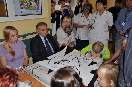 18 września 2014 r. uśmiechy gwiazd 39. Festiwalu Filmowego w Gdyni trafiły do małych pacjentów szpitala Św. Wincentego a Paulo. Zanieśli je aktorka Sonia Bohosiewicz, prezydent miasta Gdyni Wojciech Szczurek, Pełnomocnik Prezydenta Miasta ds. rodziny Beata Szadziul i twórca Światowego Archiwum Uśmiechu, Marek Wysoczyński. Specjalnie na tę okazję powstały uśmiechnięte naklejki zaprojektowane przez Marcina Władykę, twórcę festiwalowego znaku graficznego. Pacjenci oddziału dziecięcego gdyńskiego szpitala wzięli udział w „Warsztatach uśmiechu", podczas których narysowały uśmiechy na plakatach festiwalowych, tym razem dla dzieci z Japonii. Prace powędrują także do Toronto. W ten sposób Ambasada RP w Tokio i Konsulat Generalny RP w Toronto pomogą najmłodszym na świecie, a jednocześnie będą promować polski film i Festiwal Filmowy w Gdyni. Światowe Archiwum Uśmiechu stale się powiększa - w trakcie trwającego do soboty wydarzenia osobistości ze świata filmu, podczas wizyt w Teatrze Muzycznym są proszone o składanie uśmiechniętych autografów. Z kolei widzowie mogą je podziwiać na specjalnej wystawie w gdyńskim Multikinie. Wszystkie uśmiechy zbierane od kilku lat pokazywane są na całym świecie w szpitalach, domach dziecka, czy szkołach. Ostatnio odbyły daleką podróż do domów dziecka w Wietnamie. Uśmiechy mają sprawić by dzieci, młodzież czy osoby niepełnosprawne same się uśmiechnęły i tym samym choć na chwilę poczuły się lepiej. fot. Michał Kowalski Opublikowano: 18.09.2014 00:00 Autor: Michał Kowalski (2011)