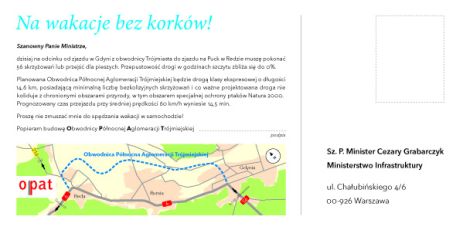 12 sierpnia 2011, przy rondzie w Rumi, u zbiegu ul. Grunwaldzkiej z ul. Dąbrowskiego oraz Żwirki i Wigury, odbyła się nadzwyczajna konferencja prasowa, a raczej wydarzenie dotyczące budowy Obwodnicy Północnej Aglomeracji Trójmiejskiej (OPAT) - przedłużenia Obwodnicy Trójmiasta na drodze krajowej nr 6. Przedstawiciele samorządów, które od lat z determinacją zabiegają o jej budowę, przybyli, by zaapelować wespół z kierowcami do Ministra Infrastruktury Cezarego Grabarczyka o włączenie OPAT do systemu dróg krajowych. Każdy z samorządowców przedstawił dziennikarzom argumenty przekonujące o konieczności budowy OPAT jako drogi o statusie drogi krajowej. Kierowcy zaś z rąk samorządowców i hostess otrzymali karty pocztowe z tym apelem adresowane do pana ministra. Miejsce konferencji wybrane zostało nieprzypadkowo. To tutaj, zwłaszcza w godzinach szczytu i dniach wzmożonego ruchu wakacyjnego, tworzą się potężne korki, które zabierają czas i zdrowie kierowcom. To właśnie ci kierowcy mogą być sojusznikami pomorskich samorządów w zabiegach o uznanie OPAT za jedną z priorytetowych inwestycji Pomorza o randze krajowej. Dlatego organizatorzy dzisiejszej konferencji przygotowali 5 tys. kart pocztowych (ze znaczkiem) zaadresowanych do Ministra Infrastruktury Cezarego Grabarczyka, które to kartki oraz drobne (plażowe) gadżety przekazane zostały kierowcom z nadzieją, że wyślą je do adresata. Pogodna atmosfera happeningu nie powinna nikogo zmylić. Jak stwierdziła burmistrz Rumi Elżbieta Rogala-Kończak w ciągu doby przez rondo w Rumi przejeżdża 60-80 tys. samochodów. Z kolei prezydent Gdyni Wojciech Szczurek zwrócił uwagę na to, że droga z Gdyni na Hel samochodem pochłania tyle samo godzin, co z Warszawy do Gdyni, czyli nawet 4,5 godziny, choć mogłaby trwać zaledwie kilkadziesiąt minut. Statystyki wypadków na drodze nr 6, która dziś jest drogą przez mękę, są dramatyczne. W 2010 r. na odcinku od Obwodnicy Trójmiasta w Gdyni do Redy doszło do ponad 330 kolizji i wypadków, a od stycznia do lipca br. - do ponad 200. W konferencji wzięli udział: prezydent Gdyni Wojciech Szczurek, burmistrz Rumi Elżbieta Rogala-Kończak, burmistrz Jastarni Tyberiusz Narkowicz, wójt Luzina Jarosław Wejer, prezydent Wejherowa Krzysztof Hildebrandt, zastępca wójta Krokowej Jarosław Białk, zastępca burmistrza Redy Teresa Kania, burmistrz Pucka Marek Rintz, zastępca wójta gminy Puck Jerzy Tkaczyk, burmistrz Władysławowa Grażyna Cern, burmistrz Helu Mirosław Wądołowski. OPAT, czyli Obwodnica Północna Aglomeracji Trójmiejskiej, to projektowana trasa długości 14 km, która wraz z ośmioma węzłami drogowymi, stanowić ma przedłużenie istniejącej Obwodnicy Trójmiejskiej - na obszarach miasta Gdyni, gminy Kosakowo oraz miast Rumi i Redy w powiecie wejherowskim. To dziś jedno z największych, strategicznych wyzwań inwestycyjnych Pomorza, o randze wykraczającej daleko poza granice regionu, zarazem o przewidywanym koszcie (ok. 1 miliarda zł), znacznie przewyższającym możliwości lokalnych samorządów. Choć to właśnie lokalne samorządy wyszły z inicjatywą budowy OPAT i wzięły na siebie wysiłek prac organizacyjnych i projektowych. Sytuacja jest dramatyczna!- Rezerwy przepustowości drogi krajowej nr 6 na przedłużeniu Obwodnicy Trójmiasta i dróg dojazdowych wyczerpują się, a w godzinach szczytu zbliżają się do 0%!- Ulice: Morska i Obwodnica Trójmiasta w Gdyni, Sobieskiego i Grunwaldzka w Rumi, Wejherowska i Gdańska w Redzie, a ponadto w Redzie w ciągu drogi wojewódzkiej nr 216 jako ulica Pucka w godzinach szczytu - przez cały rok, a sezonie wakacyjnym w szczególności - są „zakorkowane" (obecnie to 60 tysięcy pojazdów/dobę);- Wzrosła liczba wypadków na trasie tranzytowej biegnącej przez centra miast, spowodowana zwiększonym natężeniem ruchu. Według statystyki Komendy Wojewódzkiej Policji w Gdańsku na drodze krajowej nr 6 (odcinek od Gdyni do Redy) w 2010 roku odnotowano 397 kolizji i 34 wypadki, w których zginęło 5 osób a 35 osób zostało rannych. W 2011 roku (do lipca) odnotowano 184 kolizje i 25 wypadków, w których śmierć poniosły 3 osoby i 32 osoby zostały ranne.- Ciężki i intensywny ruch samochodów na istniejącej trasie powoduje szybką degradację nawierzchni i konieczność jej częstych remontów. - Wraz ze zmniejszaniem się przepustowości dróg, prędkość przejazdów zmniejsza się a czas podróży wydłuża - podczas sezonu letniego droga z Gdyni na Półwysep Helski zabiera nawet kilka godzin, zamiast kilkudziesięciu minut! Budowa Obwodnicy Północnej Aglomeracji Trójmiejskiej oznacza:• sprawne połączenie północno-zachodniej części województwa pomorskiego z Aglomeracją Trójmiejską;• stworzenie dogodnego tranzytowego ciągu komunikacyjnego w kierunku Szczecina, głównie dla ciężkich pojazdów;• zmniejszenie uciążliwości ruchu tranzytowego w centrach miast: Gdyni, Rumi i Redy;• odciążenie dróg lokalnych w gminie Kosakowo przeciążonych wskutek nieprzejezdności głównego ciągu drogi nr 6 w Gdyni, Rumi i Redzie;• usprawnienie dojazdu do atrakcyjnych turystycznie terenów Półwyspu Helskiego i Pobrzeża Kaszubskiego z obszaru całej Polski.OPAT - drogą krajową!Świadectwem determinacji lokalnych samorządów w sprawie budowy OPAT i akceptacji przez władze wojewódzkie i centralne argumentów na rzecz tej inwestycji , było już 24.05.2007 r. podpisanie przez Samorząd Województwa Pomorskiego oraz samorządy Gdyni, Rumi, Redy, Wejherowa, Helu, Jastarni, Władysławowa, Pucka i Kosakowa oraz Powiatu Wejherowskiego i Puckiego przy udziale Ministra Transportu - porozumienia w sprawie przygotowań do realizacji budowy. Gdynia jest koordynatorem tych przygotowań. Jesteśmy absolutnie przekonani o konieczności włączenia OPAT do systemu dróg krajowych i będziemy wytrwale, aż do skutku przekonywać o tym resortowego ministra, kt