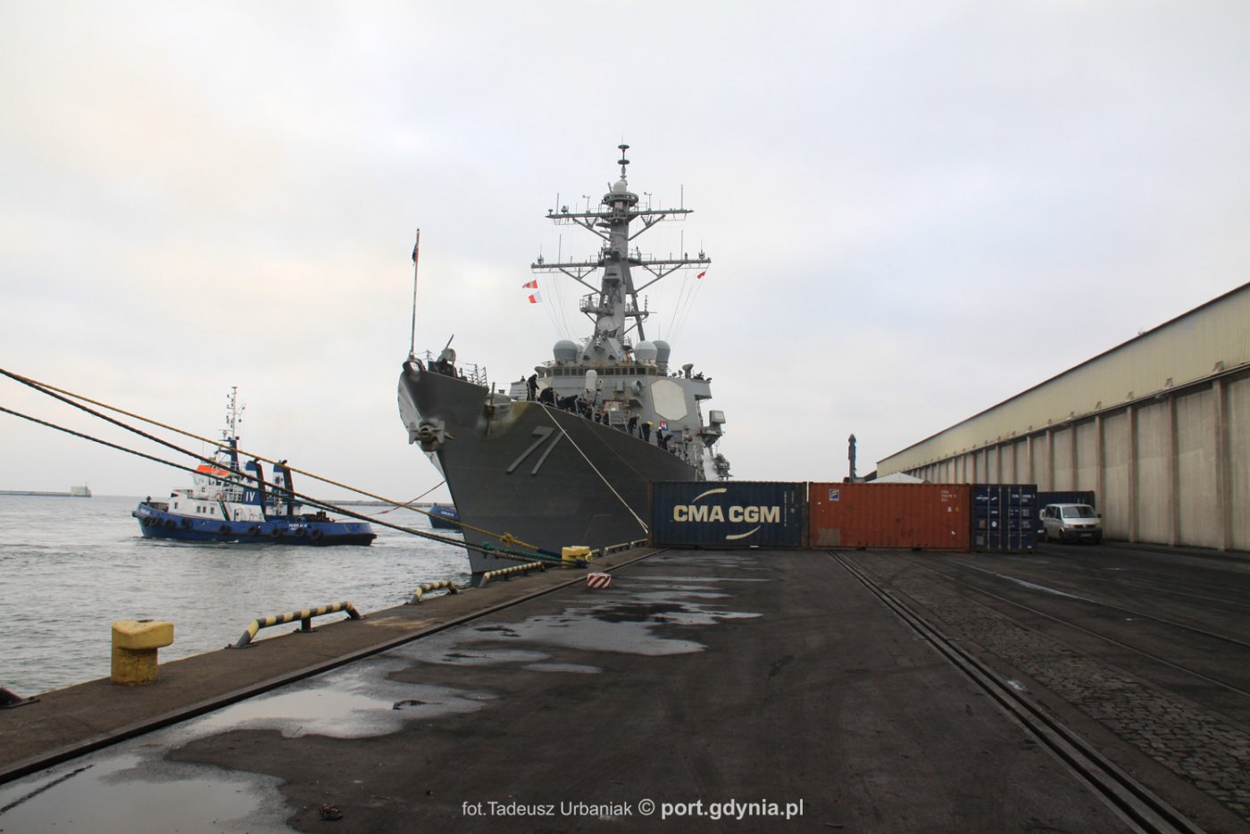W poniedziałek, 16 listopada przy nabrzeżu Francuskim w Gdyni, obok Muzeum Emigracji, zacumował amerykański niszczyciel USS Ross DDG-71. Okręt przypłynął do nas z krótką wizytą roboczą. Zwodowany w 1992 roku niszczyciel amerykańskiej Marynarki Wojennej USS Ross DDG-7 przypłynął do Gdyni z tak zwaną wizytą roboczą. Uzupełni zapasy i prawdopodobnie we wtorek, 17 listopada ruszy w dalszą podróż. Do portu wprowadziły go holowniki Fairplay IV oraz Fairplay VII i ustawiły przy nabrzeżu Francuskim, zamkniętym i obstawionym kontenerami. USS Ross to jeden z pierwszej serii niszczycieli klasy Arleigh Burke, skonstruowanych w latach 80. z myślą o zwalczaniu radzieckich samolotów, pocisków manewrujących oraz okrętów podwodnych.Klasę nazwano na cześć admirała Arleigha Burke, dowódcy niszczyciela w okresie drugiej wojny światowej, późniejszego CNA (Chief of Naval Operations) Marynarki Wojennej USA. Niszczyciele tej klasy to najdłuższa seria okrętów jednego typu budowanych w Stanach Zjednoczonych. W służbie znajduje się 68 jednostek, w budowie jest sześć, a trzy kolejne są już zamówione. Stępkę pod USS Ross DDG-71 położono w kwietniu 1995 roku, wodowano go w marcu 1996 roku, a do służby wszedł w czerwcu 1997 roku.Okręt ma 154 m długości, 20 m szerokości, 9,4 m zanurzenia i od 6.900 (light) do 9.000 ton (full) wyporności. Napędzają go 4 turbiny gazowe o łącznej mocy 100.000 KM, pozwalające na osiągnięcie prędkości 31 węzłów. Uzbrojony jest mniej więcej w to samo, co inne podobne maszyny wojenne na świecie. Ross wyposażony jest w lądowisko, ale nie ma hangaru dla helikopterów. Od lutego 2012 roku USS Ross stał się częścią obronnego systemu rakietowego w Europie. Wraz z trzema innymi jednostkami tej samej klasy (USS Donald Cook - DDG 75, USS Porter - DDG 78 i USS Carney - DDG 64) został przeniesiony do Hiszpanii. Jego aktualnym portem macierzystym jest baza marynarki wojennej Rota. To właśnie stamtąd wyrusza na pokojowe misje lub w celu zapewnienia bezpieczeństwa na Morzu Czarnym. Jednostki zacumowanej w Gdyni nie można zwiedzać.Źródło: NB/AD Galeria zdjęć Pobierz galerię Niszczyciel amerykańskiej marynarki wojennej USS Ross DDG-7 zacumował przy nabrzeżu Francuskim, fot. Tadeusz Urbaniak Pobierz zdjęcie Niszczyciel amerykańskiej marynarki wojennej USS Ross DDG-7 zacumował przy nabrzeżu Francuskim, fot. Tadeusz Urbaniak Pobierz zdjęcie Niszczyciel amerykańskiej marynarki wojennej USS Ross DDG-7 zacumował przy nabrzeżu Francuskim, fot. Tadeusz Urbaniak Pobierz zdjęcie Niszczyciel amerykańskiej marynarki wojennej USS Ross DDG-7 zacumował przy nabrzeżu Francuskim, fot. Tadeusz Urbaniak Pobierz zdjęcie Warunki pobierania Wszelkie prawa do zdjęć lub grafik prezentowanych w ramach portalu, należą do Prowadzącego portal lub do podmiotów z nim współpracujących i podlegają ochronie prawnej. Prowadzący portal zezwala na kopiowanie i przedstawianie utworów jedynie w celach niekomercyjnych oraz pod warunkiem zachowania go w oryginalnej postaci i zachowaniem kontekstu tematu, do którego zostało wykorzystaneprzez redakcję gdynia.pl. Opublikowane materiały powinny zawsze zawierać źródło, czyli adres strony www.gdynia.pl. Na publikowanie utworów w innych celach wymagana jest zgoda właściciela strony czyli Prowadzącego portal. Opublikowano: 16.11.2020 14:58 Autor: Magdalena Śliżewska (magdalena.slizewska@gdynia.pl) Zmodyfikowano: 16.11.2020 19:12 Zmodyfikował: Redakcja portalu Gdynia.pl