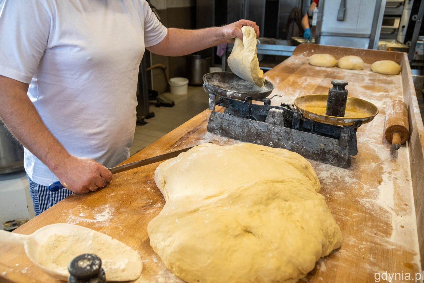 W tłusty czwartek nie wypada sobie odmówić zjedzenia pączka – albo nawet kilku. Stoimy po nie w długich kolejkach, próbujemy różnych smaków i nie liczymy kalorii. Ten dzień to także prawdziwa próba sił dla wszystkich piekarni i cukierni, które mają pączki w swojej ofercie. Jak wygląda przygotowanie tych smakołyków, sprawdziliśmy w pracowni gdyńskiej cukierni „Justynka”. Cukiernie i piekarnie pracują na wysokich obrotach już na kilka dni przed tłustym czwartkiem. Tego dnia od wczesnych godzin porannych daje się zauważyć poruszenie w mieście i ludzi ustawiających się w długich kolejkach przed cukierniami czy piekarniami. Jak powstają pączki i w którym momencie aplikuje się nadzienie? Ile sztuk trzeba upiec na tłusty czwartek, żeby zaspokoić apetyt klientów? Zapytaliśmy o to w cukierni „Justynka”, która działa w Gdyni od ponad czterdziestu lat. – Nasze ciasto na pączki składa się z mąki, drożdży, mleka, cukru, naturalnego tłuszczu, cukru waniliowego. Robimy je metodą dwufazową: najpierw rozczyn, później po pół godzinie robi się ciasto, które około godziny musi odleżakować. Następnie je werkujemy, robimy mniejsze kęsy. Jak minie 20 minut sprawdzamy uformowane pączki, i jeżeli są już dobre, to możemy wrzucać na patelnię. Smażą się około 7-8 minut. Nadziewamy je marmoladą – w naszym wypadku dżemem truskawkowym. Następnie pączki trafiają do pomady ze skórką pomarańczową, na sito i do kartonika – precyzyjnie wyjaśnia Daniel Hirsz, cukiernik z „Justynki”. Ile czasu potrzeba, aby odpowiednio przygotować się do tłustego czwartku? Ile trzeba upiec pączków? Tym bardziej, że tego dnia w cukierni „Justynka” są też dostępne pozostałe produkty m.in.: faworki, ciasta oraz pieczywo. – Przygotowania do tłustego czwartku trwają od tygodnia. Skupujemy półprodukty, przygotowujemy pomadę, czyli ten lukier, który jest na pączkach. Musimy przygotować wcześniej nadzienia: truskawkowe i adwokatowe. Staramy się zrobić do 30 tys. pączków, bo takie są nasze możliwości produkcyjne. Staramy się je robić zgodnie z potrzebą, nie narabiamy ich 24 godziny wcześniej – mówi Piotr Kaliszczak, właściciel cukierni „Justynka”. Co wyróżnia pączki z gdyńskiej „Justynki”? – Tradycyjna, rzemieślnicza metoda według starej receptury, którą kontynuujemy od 1980 roku i uczciwe półprodukty, bez domieszki chemii – dodaje Kaliszczak. Pączek na szczęście Początki tradycji tłustego czwartku sięgają pogaństwa. W tym dniu żegnano się z zimą i z radością świętowano nadejście wiosny. W chrześcijaństwie tłusty czwartek rozpoczyna ostatni tydzień karnawału. W tym dniu dozwolone jest objadanie się, przed rozpoczęciem czterdziestodniowego postu. Według dawnych przesądów, kto nie zje ani jednego pączka w tłusty czwartek – ten nie będzie cieszył się powodzeniem w życiu.Według staropolskich przepisów, pączki przygotowywano ze słoniną lub boczkiem i mięsem. Tłuste i ciężkie wyroby chętnie zapijano wówczas wódką. Niektóre źródła informują, że dopiero około XVI wieku zaczęto wyrabiać pączki słodkie, inspirując się prawdopodobnie kuchnią arabską.Dzisiaj smaków pączków jest mnóstwo. Klienci chętnie wybierają też alternatywy w postaci faworków, które znane są również jako chrusty czy chruściki. To ciasto drożdżowe zawinięte w kształcie „kokardki”, usmażone w głębokim tłuszczu i posypane cukrem pudrem.W zależności od regionu na stołach królują charakterystyczne wyroby. Np. ruchanki – rodzaj drożdżowych racuchów – to specjał, który można znaleźć w kuchni kaszubskiej. Warto jednak zaznaczyć, że jest to tak naprawdę specjał kociewski, choć Kaszubi równie mocno go lubią. Galeria zdjęć Pobierz galerię Wyrabianie ciasta w specjalnej maszynie w pracowni „Justynki”, fot. Paweł Kukla Pobierz zdjęcie Ciasto na pączki, fot. Paweł Kukla Pobierz zdjęcie Ciasto na pączki, fot. Paweł Kukla Pobierz zdjęcie Ciasto na pączki, fot. Paweł Kukla Pobierz zdjęcie Pączki przed pieczeniem leżakują około godziny, fot. Paweł Kukla Pobierz zdjęcie Pączki w procesie smażenia, fot. Paweł Kukla Pobierz zdjęcie Polukrowane pączki trafią do pudełka i do klientów, fot. Paweł Kukla Pobierz zdjęcie Warunki pobierania Wszelkie prawa do zdjęć lub grafik prezentowanych w ramach portalu, należą do Prowadzącego portal lub do podmiotów z nim współpracujących i podlegają ochronie prawnej. Prowadzący portal zezwala na kopiowanie i przedstawianie utworów jedynie w celach niekomercyjnych oraz pod warunkiem zachowania go w oryginalnej postaci i zachowaniem kontekstu tematu, do którego zostało wykorzystaneprzez redakcję gdynia.pl. Opublikowane materiały powinny zawsze zawierać źródło, czyli adres strony www.gdynia.pl. Na publikowanie utworów w innych celach wymagana jest zgoda właściciela strony czyli Prowadzącego portal. Opublikowano: 21.02.2022 07:00 Autor: Magdalena Śliżewska (magdalena.slizewska@gdynia.pl) Zmodyfikowano: 24.02.2022 19:30 Zmodyfikował: Agnieszka Janowicz