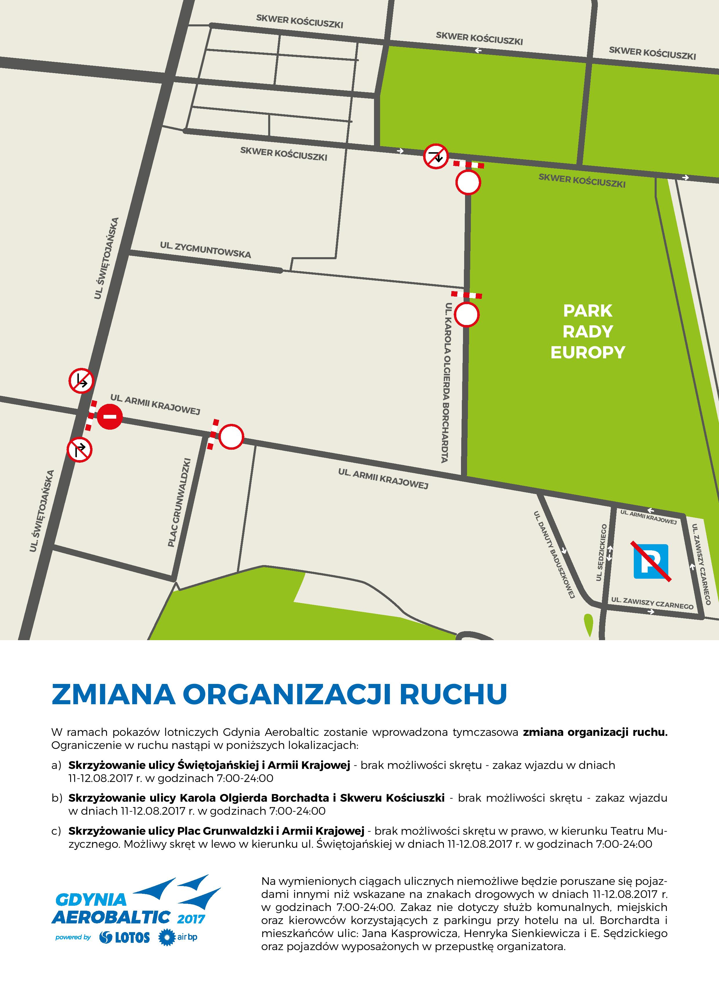 W najbliższy piątek i sobotę, 11 i 12 sierpnia, szykuje się w Gdyni kolejna widowiskowa impreza sportowa. Kontynuując sukces zawodów Red Bull Air Race, przez dwa popołudnia i dwie noce na gdyńskim niebie gościć będzie wspaniałe lotnicze widowisko. Gdynia AeroBaltic Powered by Lotos Air BP to podniebne show, na które oprócz akrobacji składa się także pirotechniczna strona wizualna. Takiego wydarzenia jeszcze w naszym mieście nie było!Gdynia AeroBaltic to nietypowe pokazy lotnicze, odbiegające w swojej formule od podobnych widowisk, do których przyzwyczajeni są widzowie. Dużą rolę w wydarzeniu odgrywać będzie jego strona artystyczna oraz elementy pirotechniczne. Wzmocnią one efektowność podniebnych ewolucji wykonywanych przez przeczące prawom grawitacji maszyny i pilotów. Pokazy odbywać się będą wieczorem i w nocy co sprawi, że efekty pirotechniczne będą bardzo widowiskowe. Zarówno w piątek, jak i w sobotę przewidziany jest taki sam program występów - specjalnie po to, aby jak największa liczba osób mogła obejrzeć widowisko. Każdeg dnia rozpoczynać je będą akrobatyczne popisy skoczków spadochroniarskich z grupy SKYMAGIC.– Podczas imprezy Gdynia AeroBaltic powered by Lotos Air BP niebo nad gdyńską plażą nie tylko rozbłyśnie, ale stanie się areną podniebnych ewolucji w wykonaniu najlepszych pilotów z Polski i z zagranicy – mówi Sebastian Golus, prezes firmy Aeropact, organizatora pokazów. Na gdyńskim niebie pojawią się wówczas zarówno piloci indywidualni, jak Artur Kielak, Marek Choim, Johan Gustafsson, a także formacje z Polski i zagranicy: Żelazny, Aerosparx, FireFlies czy Patrouille Reva. Podniebnemu spektaklowi towarzyszyć będą pokazy świetlne oraz oprawa muzyczna. Dwa dni pokazów podzielone będą na bloki popołudniowe i nocne. Pierwszy blok rozpoczynać się będzie o godzinie 16.30 i kończyć ok. godziny 20.00, zaś drugi blok wystartuje po godzinie 20.10 i skończy się ok. godziny 22.30. Najlepszym miejscem do obserwacji pokazów będzie Plaża Śródmieście, Bulwar Nadmorski czy skwer Kościuszki.Każdego dnia, od godz. 10.00 do 23.00, będą też otwarte strefy sponsorskie i gastronomiczne na terenie gdyńskiej plaży miejskiej. Zaś na parkingu przy Muzeum Miasta Gdyni (ul. Zawiszy Czarnego) od piątku do niedzieli można będzie wziąć udział w towarzyszącym imprezie Festiwalu Smaków Food Trucków. – Gdynia AeroBaltic zapowiada się fantastycznie! Cieszymy się, że to niezwykle widowiskowe wydarzenie odbędzie się w naszym mieście – mówi Marek Łucyk, dyrektor Gdyńskiego Centrum Sportu. Program imprezy: Piątek, 11 sierpnia 16.30 – Rozpoczęcie Gdynia AeroBaltic 2017; 16.35 – Blok popołudniowy – skoki spadochronowe i pokazy lotnicze; 19.50 – Zakończenie bloku popołudniowego; 19.55 – Sesja zdjęciowa z powietrza; 20.10 – Blok wieczorno-nocny – pokazy lotnicze; 22.30 – Zakończenie. Sobota, 12 sierpnia 16.30 – Rozpoczęcie; 16.35 – Blok popołudniowy – skoki spadochronowe i pokazy lotnicze; 19.50 – Zakończenie bloku popołudniowego; 19.55 – Sesja zdjęciowa z powietrza; 20.10 – Blok wieczorno-nocny – pokazy lotnicze z towarzyszeniem pirotechniki oraz projekcja na specjalnym wodnym ekranie "Water Screen"; 22.30 – Zakończenie imprezy. Szczegółowe informacje dotyczące programu imprezy można znaleźć na stronie internetowej www.aerobaltic.pl lub na profilu Facebook www.facebook.pl/gdyniaaerobaltic. Informacje organizacyjne i czasowe zmiany w organizacji ruchu: W związku z organizacją imprezy konieczne będzie wprowadzenie czasowych zmiany w organizacji ruchu w centrum miasta, w okolicach plaży miejskiej. Ze względu na spodziewaną dużą liczbę gości, wszystkich uczestników imprezy zachęcamy do przybycia środkami komunikacji miejskiej. W razie konieczności użycia samochodu, radzimy pozostawić go na parkingach poza centrum miasta i zastosowania się do zmian w organizacji ruchu: Skrzyżowanie ulic Świętojańskiej i Armii Krajowej – brak możliwości skrętu – zakaz wjazdu w dniach 11-12.08 w godzinach 7.00-23.00; Skrzyżowanie ulicy Borchadta i skweru Kościuszki – brak możliwości skrętu – zakaz wjazdu w dniach 11-12.08 w godzinach 7.00-23.00; Skrzyżowanie ulic plac Grunwaldzki i Armii Krajowej – brak możliwości skrętu w prawo, w kierunku Teatru Muzycznego. Możliwy skręt w lewo w kierunku ul. Świętojańskiej w dniach 11-12.08 w godzinach 7.00-23.00. Na wymienionych ciągach ulicznych niemożliwe będzie poruszanie się pojazdami innymi, niż wskazane na znakach drogowych w dniach 11-12.08 w godzinach 7.00-23.00. Zakaz nie dotyczy służb komunalnych, miejskich oraz kierowców korzystających z parkingu przy hotelu na ul. Borchardta i mieszkańców ulic: Kasprowicza, Sienkiewicza i Sędzickiego oraz pojazdów wyposażonych w przepustkę organizatora. W dniach 10-13.08 parking przy ul. Zawiszy Czarnego będzie wyłączony z użytku. W dniach 11-12.08 droga rowerowa wiodąca od ul. Piłsudskiego wzdłuż Bulwaru Nadmorskiego do ul. Zawiszy Czarnego będzie niedostępna. W razie konieczności przyjazdu samochodem, sugerowane parkingi to: parking pomiędzy Centrum Riviera a Gdynia Areną (ul. K. Górskiego 8), parking przy skwerze Arki Gdynia (na końcu al. Marszałka Piłsudskiego), parking przy hotelu Marriott Courtyard (ul. Waszyngtona 19), parking przy hotelu Mercure (ul. Borchardta), parking przy Centrum Handlowym Batory (ul. Władysława IV), parking przy Akwarium Gdyńskim (al. Jana Pawła II). W razie potrzeby organizatorzy udostępnią także tymczasowy parking przy al. Marszałka Piłsudskiego, na terenie byłego boiska GOSiR.Mając na uwadze najwyższy priorytet, jakim jest bezpieczeństwo podczas trwania imprezy, na Plaży Śródmieście wyznaczone zostaną strefy zamknięte. Będą one pełniły m.in. funkcję lądowiska dla skoczków spadochronowych.UWAGA! Wszystkich rodziców, którzy na pokazy lotnicze wy