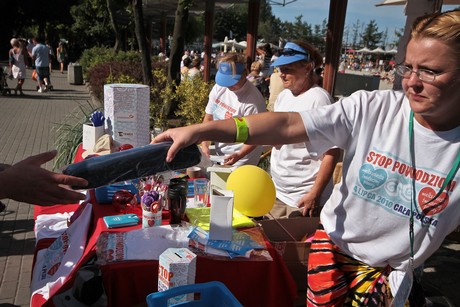 Nietypowo, bo latem. Nie z czerwonymi, ale z niebieskimi serduszkami zagrała w niedzielę 4 lipca 2010r. Wielka Orkiestra Świątecznej Pomocy. W Gdyni zebrano prawie 50 tys. zł. Dochód zostanie przeznaczony na zakup sprzętu pomagającego w likwidowaniu skutków powodzi. W Gdyni Orkiestra zagrała przed Teatrem Miejskim, gdzie znajdowały się stragany ze specjałami z Kaszub i Kociewia oraz miasteczko atrakcji zorganizowane przez Kolibki Adventure Park. Podobnie jak podczas zimowych WOŚP odbyła się licytacja darów, przekazanych przez gdyńskie instytucje i firmy. Sztab WOŚP pracował także w Centrum Kultury i Rozrywki GEMINI, gdzie odbyły sie koncerty, pokazy taneczne, licytacje, a także wielka loteria fantowa. Również w Contrast Cafe zbierano pieniędze dla Orkiestry. Zbiórkę prowadzili także wolontariusze z gdyńskiej YMCA. fot.: Bartosz Pietrzak Opublikowano: 05.07.2010 00:00 Autor: Dorota Nelke (11@gdynia.pl)