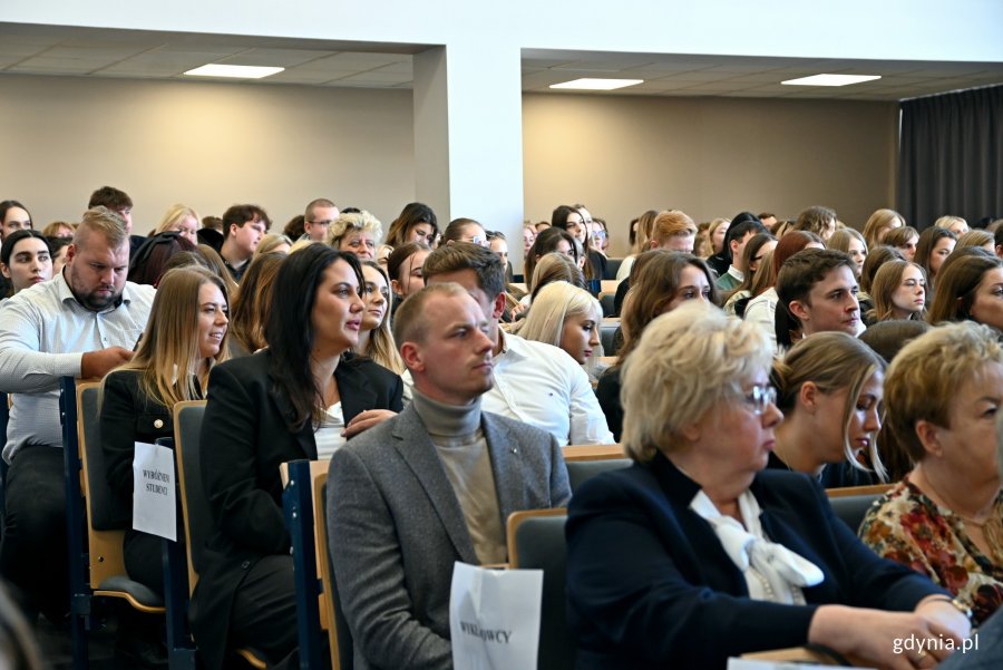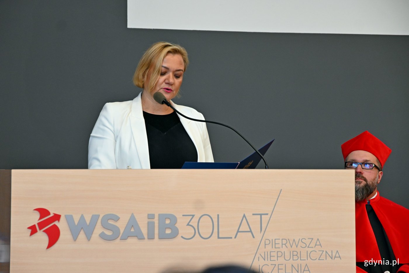To uczelnia, która proponuje bogatą ofertę kształcenia. Działa od 30 lat i ma trzy wydziały, gdzie można studiować na kilkunastu kierunkach. Około 1 400 studentów rozpoczyna tam właśnie swoją akademicką przygodę. Wyższa Szkoła Administracji i Biznesu oficjalnie rozpoczęła nowy rok akademicki. Uroczysta inauguracja odbyła się we wtorek, 1 października. Uczestniczyła w niej prezydent Gdyni Aleksandra Kosiorek, która wygłosiła wykład inauguracyjny. Wyższa Szkoła Administracji i Biznesu w Gdyni to jedna z najstarszych uczelni niepublicznych na Pomorzu. Powstała 30 lat temu i od tej pory nieustannie się rozwija. W tym roku akademickim w jej murach naukę podejmie około 1 400 nowych studentów. W sumie uczy się tam ponad 4 000 osób.Uroczysta inauguracja roku akademickiego na uczelni odbyła się we wtorek, 1 października. W uroczystości uczestniczyli m.in. samorządowcy, przedstawiciele służb mundurowych i lokalnych instytucji oraz firm, a także społeczność akademicka WSAiB. Wśród gości pojawiła się prezydent Gdyni Aleksandra Kosiorek. Trzydzieste urodziny to okrągła rocznica. I dowód na to, że uczelnia ma się dobrze i że się rozwija. A rozwój Wyższej Szkoły Administracji i Biznesu obserwowałam od lat. I to dosłownie, bo mieszkałam z rodzicami bardzo niedaleko. I na tutejszej auli, jeszcze w jej starym kształcie, przed remontem, miałam zajęcia na aplikacji radcowskiej. Tak więc korzystałam z gościnności WSAiB – mówi prezydent Gdyni. Wydarzenie rozpoczęło się od wprowadzenia sztandaru i odegrania hymnu państwowego. Następnie dr Tomasz Białas, rektor uczelni, przywitał gości i wygłosił przemówienie inauguracyjne. To moment magiczny, bo przyjmujemy w szeregi społeczności akademickiej nowych studentów. Jest to pewien ceremoniał. Studenci pierwszego roku – to przede wszystkim dla nich jest ta uroczystość. Są pięknie ubrani, ale nie o sam ubiór chodzi, a o atmosferę, o słowa ślubowania studenckiego, w którym mówią o tym, że wstępują do społeczności akademickiej wyższej uczelni i że zobowiązują się do przestrzegania zasad tej społeczności. To 31. inauguracja w tej sali. Właśnie skończyliśmy 30 lat. Zatem czas na podsumowania. Planów jest mnóstwo. Jeden z najważniejszych to rozbudowa infrastruktury. Pozyskaliśmy zgodę na nowe kierunki i aby móc je rozwijać, zakupiliśmy, tu w Gdyni, nowy budynek. Zostanie oddany do użytku dla studentów i dla wykładowców dokładnie za rok – mówi rektor Wyższej Szkoły Administracji i Biznesu w Gdyni. Potem głos zabrała Anna Olkowska-Jacyno, II wojewoda pomorska, która życzyła społeczności uczelni udanego roku akademickiego. Kolejnym punktem była uroczysta immatrykulacja studentów I roku. Złożyli oni ślubowanie. Tuż potem uczestnicy uroczystości wysłuchali wykładu inauguracyjnego pt. „Klauzula sumienia w świetle zasad wykonywania zawodu lekarza”, który wygłosiła prezydent Aleksandra Kosiorek. Pan rektor zachęcił mnie do tego, żebym wygłosiła wykład na mój ulubiony temat z zakresu prawa medycznego – o klauzuli sumienia w świetle zasad wykonywania zawodu lekarza. Czyli obcy temat, jeżeli chodzi o samorząd, natomiast mimo wszystko bardzo bliski, bo to wciąż samorząd zawodowy. Taka mała zajawka na temat tego, czym specjaliści prawa medycznego zajmują się na co dzień – podkreśliła prezydent Aleksandra Kosiorek. Prezydent Gdyni Aleksandra Kosiorek wygłosiła wykład inauguracyjny (fot. Magdalena Czernek)Podczas inauguracji wręczono również nagrody rektora dla pracowników i studentów.Wyższa Szkoła Administracji i Biznesu powstała w 1994 roku. Można tam ukończyć studia licencjackie, magisterskie, inżynierskie, podyplomowe i MBA. Oferta kształcenia jest bogata i zróżnicowana. Na studiach zdobywamy duże doświadczenie, dużą wiedzę, ponieważ mamy zajęcia z praktykami, dzięki czemu uczymy się na żywych przykładach. Więc to jest duży plus. Myślę, że po takich studiach, jeśli student się naprawdę przyłoży i pouczy, można zdobyć wiele wiedzy. Poza tym na uczelni jest dużo organizacji studenckich, dzięki czemu każdy znajdzie swoją grupę znajomych i ma też czas po prostu na swoje własne życie – mówi Wiktoria Kulesiak, studentka WSAiB. Na WSAiB działają trzy wydziały. To Wydział Prawa i Administracji, Wydział Zarządzania i Wydział Zdrowia. Oferuje kształcenie na kierunkach: administracja, bezpieczeństwo wewnętrzne, dietetyka, finanse i rachunkowość, logistyka, logopedia, management, psychodietetyka, psychologia w biznesie, zarządzenie, studia menedżersko-prawne, logistyka, prawo i psychologia. Galeria zdjęć Pobierz galerię Senat Wyższej Szkoły Administracji i Biznesu podczas inauguracji roku akademickiego (fot. Magdalena Czernek) Pobierz zdjęcie Uczestnicy inauguracji roku akademickiego w Wyższej Szkole Administracji i Biznesu w Gdyni (fot. Magdalena Czernek) Pobierz zdjęcie dr Tomasz Białas, rektor Wyższej Szkoły Administracji i Biznesu w Gdyni przemawiający podczas inauguracji roku akademickiego (fot. Magdalena Czernek) Pobierz zdjęcie Uczestnicy inauguracji roku akademickiego w Wyższej Szkole Administracji i Biznesu w Gdyni, a wśród nich prezydent Gdyni Aleksandra Kosiorek (pierwsza z prawej) (fot. Magdalena Czernek) Pobierz zdjęcie Anna Olkowska-Jacyno, II wicewojewoda pomorska, podczas inauguracji roku akademickiego w Wyższej Szkole Administracji i Biznesu (fot. Magdalena Czernek) Pobierz zdjęcie Wręczenie nagród zasłużonym, wieloletnim pracownikom uczelni (fot. Magdalena Czernek) Pobierz zdjęcie Wręczenie nagród zasłużonym, wieloletnim pracownikom uczelni (fot. Magdalena Czernek) Pobierz zdjęcie Prezydent Gdyni Aleksandra Kosiorek podczas wygłaszania wykładu inauguracyjnego (fot. Magdalena Czernek) Pobierz zdjęcie Uczestnicy inauguracji roku akademickiego w Wyższej Szkole Administracji i Biznesu w Gdyni (fot. Magd