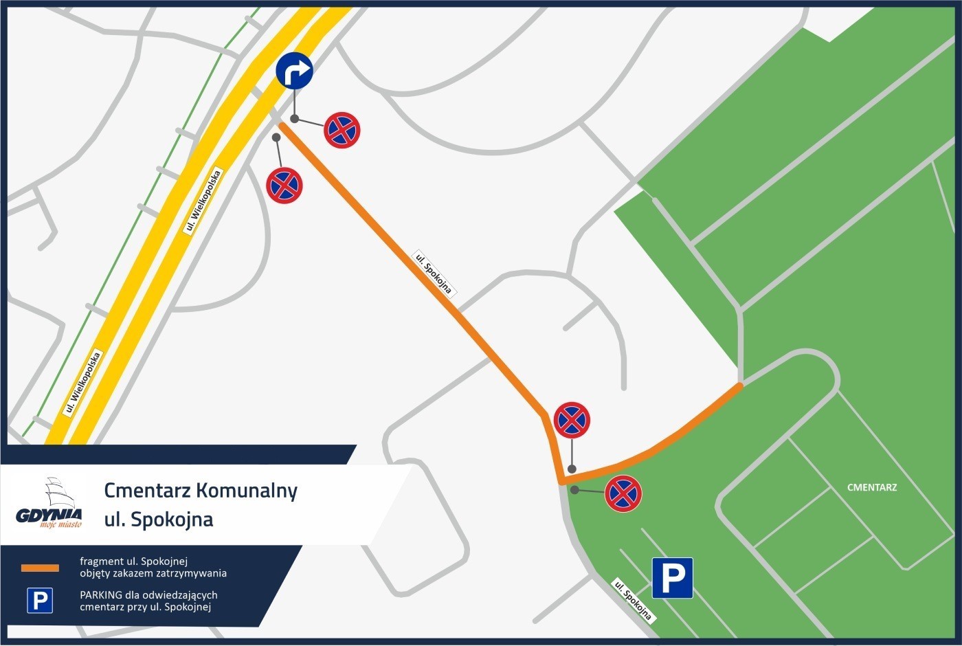 Aby zapewnić bezpieczeństwo i ułatwić dojazd do nekropolii okresie Wszystkich Świętych, w Gdyni obowiązywać będzie tymczasowa organizacja ruchu przy trzech cmentarzach komunalnych oraz w Kosakowie. Wprowadzone też zostaną zmiany w rozkładach jazdy autobusów i trolejbusów. Sprawdź, jak poruszać się po mieście, gdzie zaparkować i z jakich tras skorzystać w tych dniach. Cmentarz Witomiński – ruch jednokierunkowy i parkowanie Cmentarz przy ul. Spokojnej Cmentarz Marynarki Wojennej Cmentarz w Kosakowie Funkcjonowanie gdyńskiej komunikacji miejskiej Ostatnie dni października i pierwsze dni listopada są pełne zadumy i refleksji. To czas odwiedzania grobów, zapalania zniczy i wspominania bliskich. W Gdyni, podobnie jak w poprzednich latach, wprowadzone zostaną tymczasowe zmiany w organizacji ruchu i funkcjonowaniu komunikacji miejskiej, aby zapewnić sprawny dojazd i bezpieczeństwo w rejonie cmentarzy.Zmiany w organizacji ruchu obowiązywać będą od piątku, 31 października, od godzin porannych, do niedzieli, 2 listopada, do około godziny 22:00. Obejmą trzy gdyńskie cmentarze komunalne oraz nekropolię w Kosakowie. Cmentarz Witomiński – ruch jednokierunkowy i parkowanie Ul. Witomińska będzie jednokierunkowa – od skrzyżowania z ul. Zielną i Bursztynową w stronę ul. Warszawskiej. Wjazd od ul. Warszawskiej dozwolony tylko dla autobusów, służb miejskich i rowerzystów. Pozostali kierowcy dojadą od ul. Kieleckiej. Z ul. Śląskiej w lewo w ul. Warszawską skręcą jedynie autobusy i pojazdy służbowe. Na skrzyżowaniu ulic Kielecka - Rolnicza - Witomińska - Konwaliowa skręt w lewo z ul. Kieleckiej w ul. Konwaliową będzie niemożliwy, z ul. Witomińskiej – tylko w prawo, w ul. Rolniczą. Parkowanie Możliwe na pasie ruchu między ul. Zielną a bramą główną cmentarza. Tymczasowy postój taksówek na końcu tego odcinka. Parking przy siedzibie Zarządu Cmentarzy Komunalnych będzie wyłączony, a parking przy bramie głównej przeznaczony będzie dla osób z niepełnosprawnościami. Na odcinku od bramy do ul. Warszawskiej będzie obowiązywał zakaz zatrzymywania się. Cmentarz przy ul. Spokojnej Zakaz zatrzymywania się po obu stronach ulicy i na drodze dojazdowej. Z ul. Spokojnej na skrzyżowaniu z ul. Wielkopolską możliwy tylko skręt w prawo. Dostępny parking za drogą dojazdową do cmentarza. Cmentarz Marynarki Wojennej Ruch jednokierunkowy na ulicach Miegonia i Muchowskiego – od ul. Dickmana w kierunku ul. Arciszewskich. Cmentarz w Kosakowie Zmiany w organizacji ruchu, które będą obowiązywać 1 listopada: Dojazd do cmentarza komunalnego przy ul. Rzemieślniczej możliwy będzie objazdem przez Pierwoszyno, ulicami: Żeromskiego - Kaszubską - Rumską - Rzemieślniczą. Wprowadzony zostanie zakaz zatrzymywania się po stronie cmentarza na ul. Rzemieślniczej (z wyłączeniem komunikacji miejskiej). Na ul. Żeromskiego, na odcinku od ronda do ul. Kaszubskiej, obowiązywać będzie zakaz zatrzymywania się po lewej stronie (nie dotyczy komunikacji miejskiej). Na ul. Leśnej, od ul. Rumskiej do ul. Brzozowej, obowiązywać będzie zakaz zatrzymywania się po obu stronach. Na ul. Rzemieślniczej zostanie wprowadzony ruch jednokierunkowy w kierunku ul. Rumskiej do ul. Chrzanowskiego. Wszystkich, którzy w tych dniach odwiedzą groby, prosimy o ostrożność i stosowanie się do oznakowania oraz poleceń służb. Warto rozważyć skorzystanie z komunikacji miejskiej, która kursować będzie częściej i dowiezie pasażerów w pobliże nekropolii. Funkcjonowanie gdyńskiej komunikacji miejskiej Wzmożona obsługa komunikacyjna nekropolii w Gdyni oraz w obsługiwanych gdyńską komunikacją miejską gminach sąsiednich: od 25 października do 2 listopada.Sobota – niedziela, 25-26 październikaObowiązują stałe rozkłady jazdy (w sobotę – sobotnie, w niedzielę – niedzielno-świąteczne).Dojazd do Cmentarza Witomińskiego Linia 141 – w sobotę według stałego rozkładu jazdy, w niedzielę w godz. 9:00-17:00 z częstotliwością zwiększoną do 20 minut. Linia 190 – w sobotę i niedzielę w godz. 9:00-17:00 z częstotliwością podwojoną – odpowiednio do 10 i 15 minut. Dojazd do Cmentarza Komunalnego w Kosakowie Linia 105 – w godz. 6:30-21:00 na stałej trasie. Linia 305 – w godz. 9:00-16:00 na trasie: Gdynia Węzeł F. Cegielskiej - Kielecka - Śląska - Władysława IV - 10 Lutego - Podjazd - Morska - Estakada Kwiatkowskiego - Unruga - Czernickiego - Kosakowo - Kosakowo Cmentarz Komunalny. Obie linie będa obsługiwać autobusy przegubowe, z kursami łącznie co 15 minut.Dojazd do cmentarzy w Rumi Linie 84 i 86 – zgodnie ze stałymi trasami i rozkładami jazdy. Linia 288 – z wprowadzonymi zajazdami na Cmentarz Komunalny. Dojazd do cmentarzy w Sopocie Linie 181 i 187 – zgodnie ze stałymi trasami i rozkładami jazdy. Poniedziałek – czwartek: 27-30 październikaObowiązują stałe rozkłady jazdy ważne w dni powszednie nauki szkolnej. W rejonie cmentarzy obowiązują jeszcze stałe organizacje ruchu. W czwartek, 30 października w godz. 8:30-17:00 zwiększona zostaje częstotliwość kursów na linii 190 – do 7-10 minut. Piątek, 31 październikaObowiązują rozkłady jazdy ważne w dni powszednie nauki szkolnej – ale są odstępstwa. Dojazd do Cmentarza Witomińskiego w Gdyni Linia 390 – na trasie: Gdynia Dworzec Gł. PKP - Dworcowa - 10 Lutego (z powrotem: Władysława IV - Jana z Kolna) - Władysława IV - al. Piłsudskiego - Śląska - Witomińska - Cmentarz Witomiński, w godz. 7:30-19:00, z kursami co 10-15 minut. Linia 392 – na trasie: Witomino Leśniczówka - II MPS - Wielkokacka (wybrane kursy: Stawna - Polna - Długa) - Małokacka - Olimpijska - Sportowa - Górskiego - Droga Gdyńska - Śląska - Warszawska - Witomińska - Cmentarz Witomiński, w godz. 9:00-18:00, z kursami co 20 minut. Linia 190 obsługuje rejon cmentarza tylko w kursach z Witomina do godz. 8:00 i po godz. 19:00. W czasie 