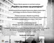 Rok 2013 to rok jubileuszu Muzeum Miasta Gdyni. Muzeum świętować będzie 30 lat swej działalności. W związku z tym zaplanowano szereg przedsięwzięć, w tym cykl wystaw. Prezentowanie na nich będą zgromadzone przez te lata zbiory.Pierwsza z wystaw „Popatrz czy znasz i poznajesz?” powstała z bogatych zbiorów fotograficznych zgromadzonych w Muzeum Miasta Gdyni. Zaprezentowany na niej będzie wybór fotografii, zdjęć, pocztówek obejmujących ostatnie 100 lat Gdyni. Ze względu na bardzo dużą ilość materiału ikonograficznego autorzy zdecydowali się na wybór fotografii, które dotychczas rzadko były wykorzystywane, bądź też zdjęcia pokazujące znane gdyńskie budynki i miejsca ukazane w inny sposób. Będzie też można obejrzeć Gdynię, której już nie ma lub miejsca, które zmieniły się nie do poznania. Wystawę uzupełni multimedialny pokaz ponad 100 fotografii.Fotografie eksponowane będą w Miejskiej Informacji, przy ulicy 10 Lutego 24, do 2 lutego 2013 r. od poniedziałku do piątku w godz. 9.00 – 17.00, w sobotę w godz. 9.00 – 15.00. Wernisaż odbędzie się w czwartek 17 stycznia 2013 r. o godz. 17.00. Podczas wernisażu odbędzie się prelekcja Pana Jacka Ostapkowicza starszego kustosza Muzeum Miasta Gdyni „Gdynia w prasie wybrzeża w latach 1945-1950”. Opublikowano: 16.01.2013 00:00 Autor: Michał Kowalski (2011)